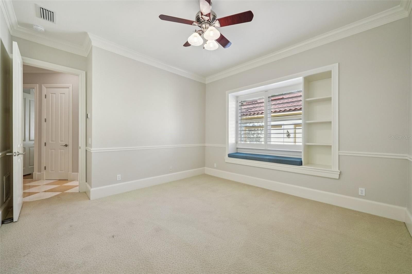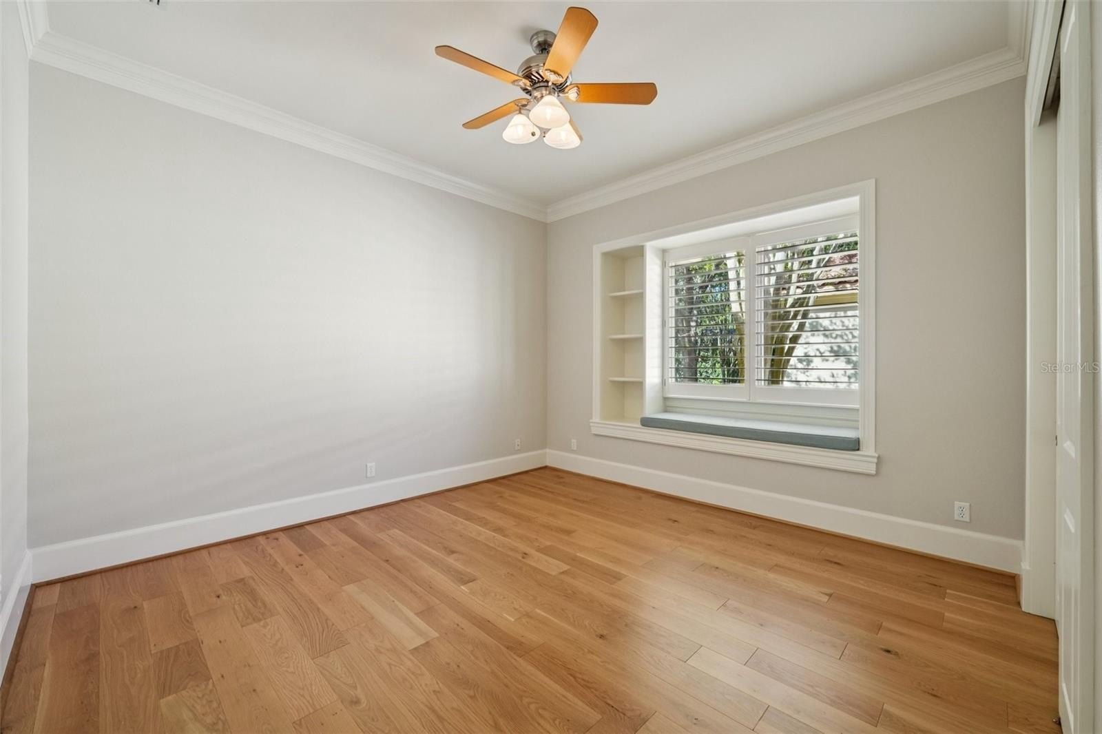 The primary suite offers a true retreat, complete with a sitting area and direct access to the lanai. The en-suite bathroom is spacious and well-appointed, featuring a garden tub, upgraded finishes, and custom closets. Secondary bedrooms include plantation shutters and charming window seats, while a sunroom with built-in desk and shelving provides the perfect flex space for an additional office, studio, or reading room. A fully furnished media room adds even more versatility and entertainment value.