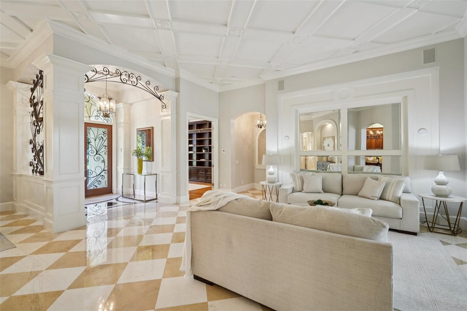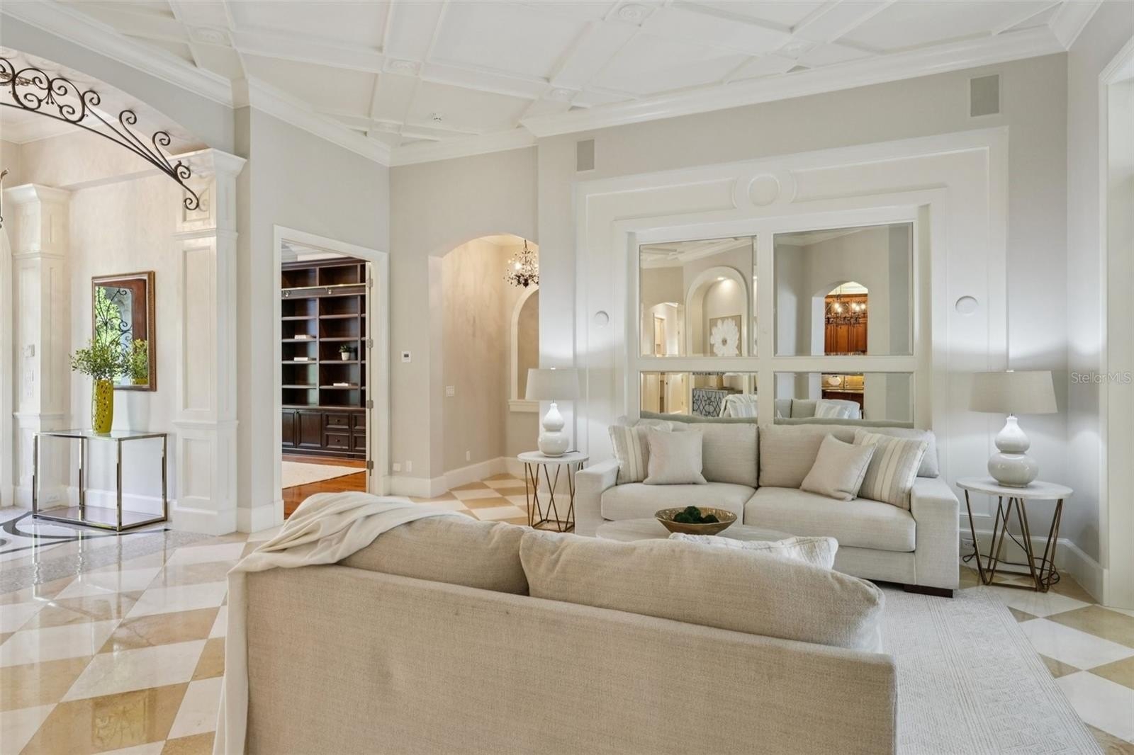 At the front of the home, a dedicated executive office provides a quiet, private workspace—ideal for working from home without interruption. The formal living and dining areas feature elegant marble flooring and French doors, creating a refined setting for entertaining. The family room is the heart of the home, with polished travertine floors, a gas fireplace, built-in media area, and a full wall of French doors that flood the space with natural light and open seamlessly to the lanai.
