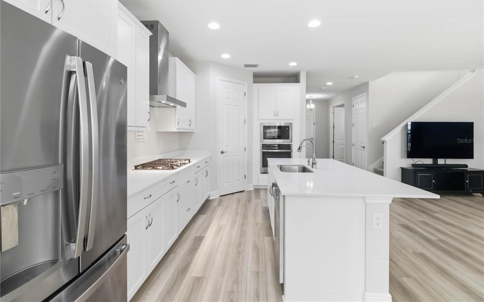 GE stainless appliances including refrigerator, wall oven + microwave, gas cooktop with hooded vent, crown-molded cabinetry, walk-in pantry, reverse osmosis water filtration system & ample dining space.