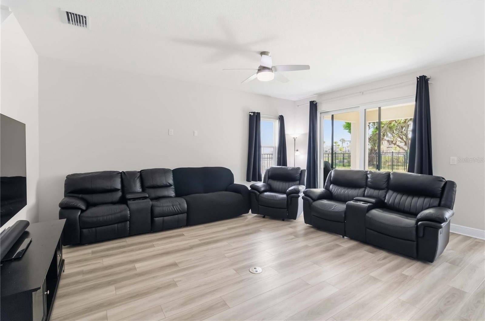 The heart of the home opens into a bright gathering room where oversized sliders frame peaceful preserve views and invite natural light inside. Step outside and you’ll find a fully fenced backyard backing to trees and conservation land—a rare combination of privacy and possibility—with plenty of space for a future pool.