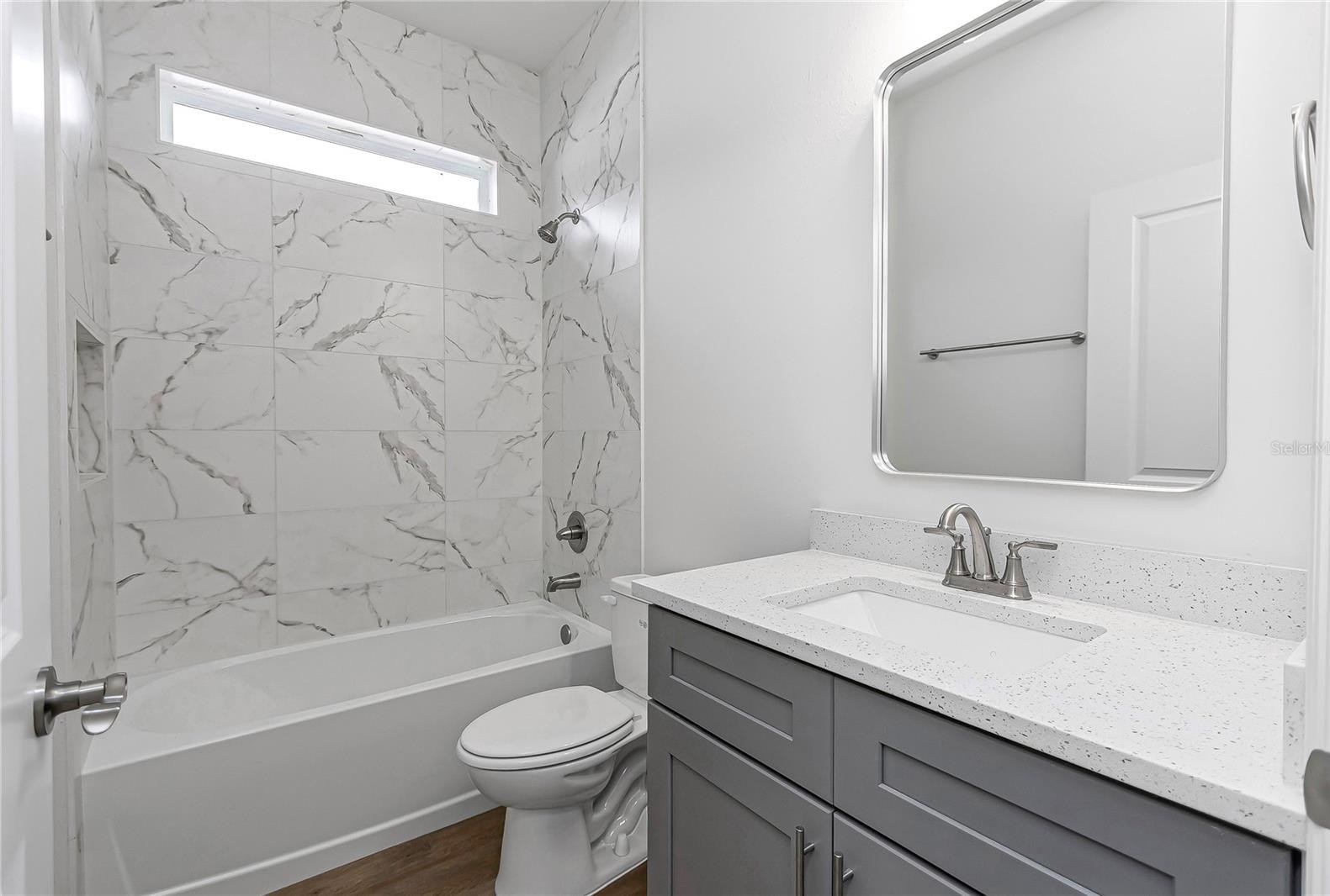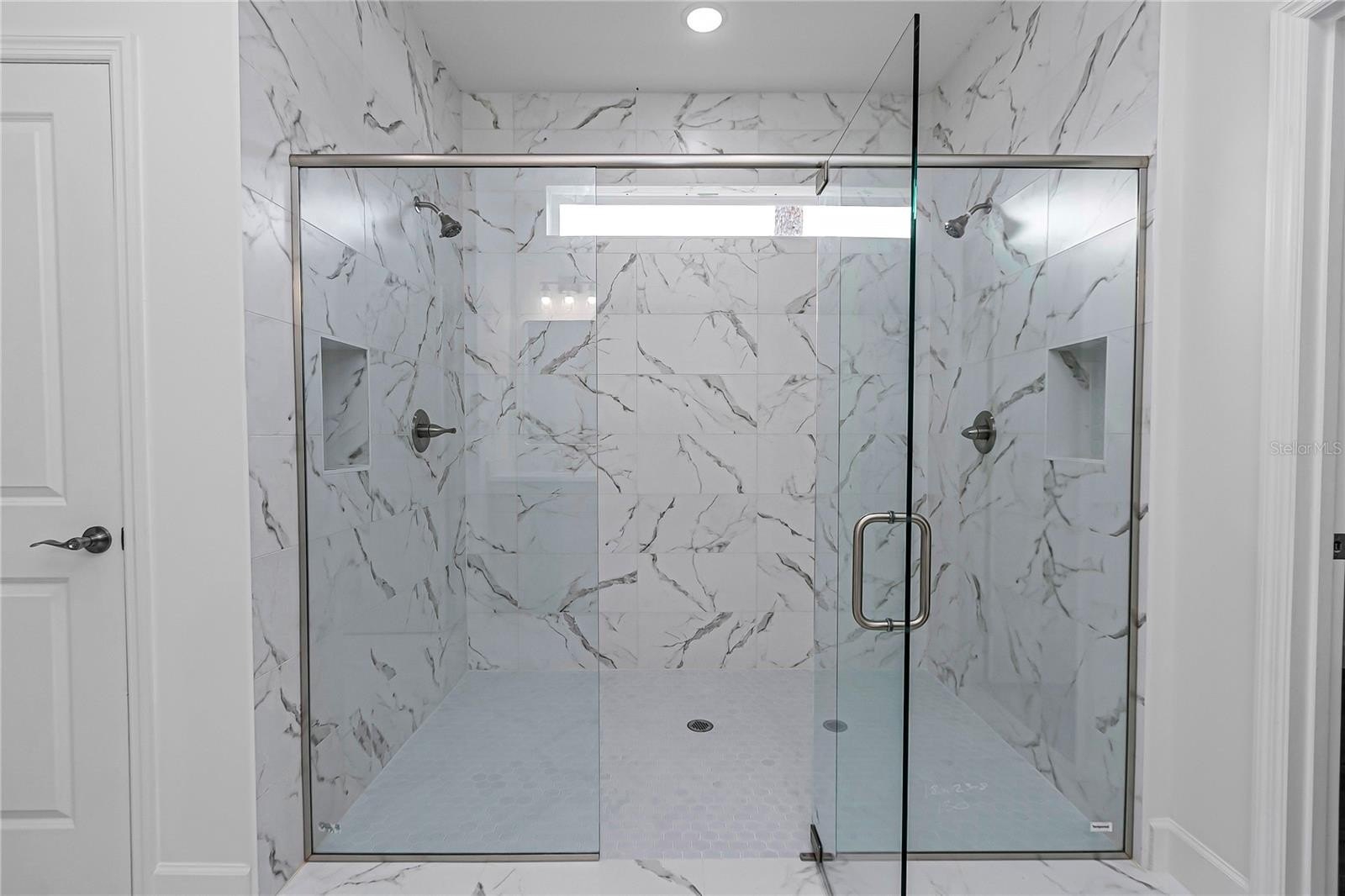 The primary suite offers a true private retreat, complete with a frameless glass shower, floor-to-ceiling marble-look tile, dual vanities, and a stunning custom-designed walk-in closet that combines luxury with exceptional organization. Secondary bedrooms are generously sized and thoughtfully arranged for both comfort and privacy.