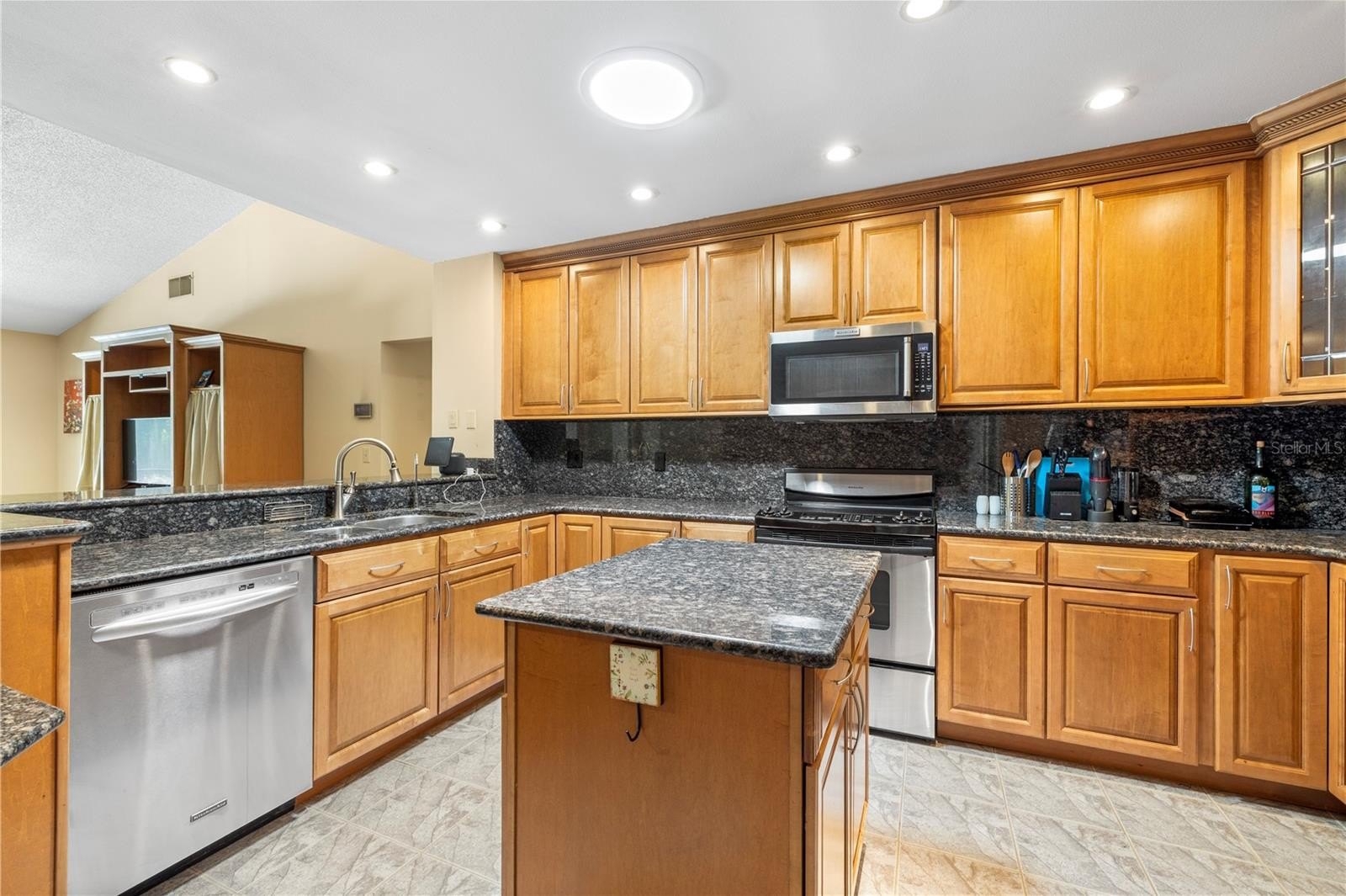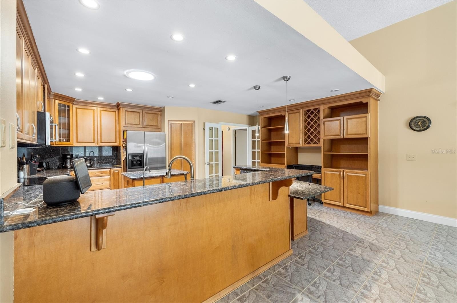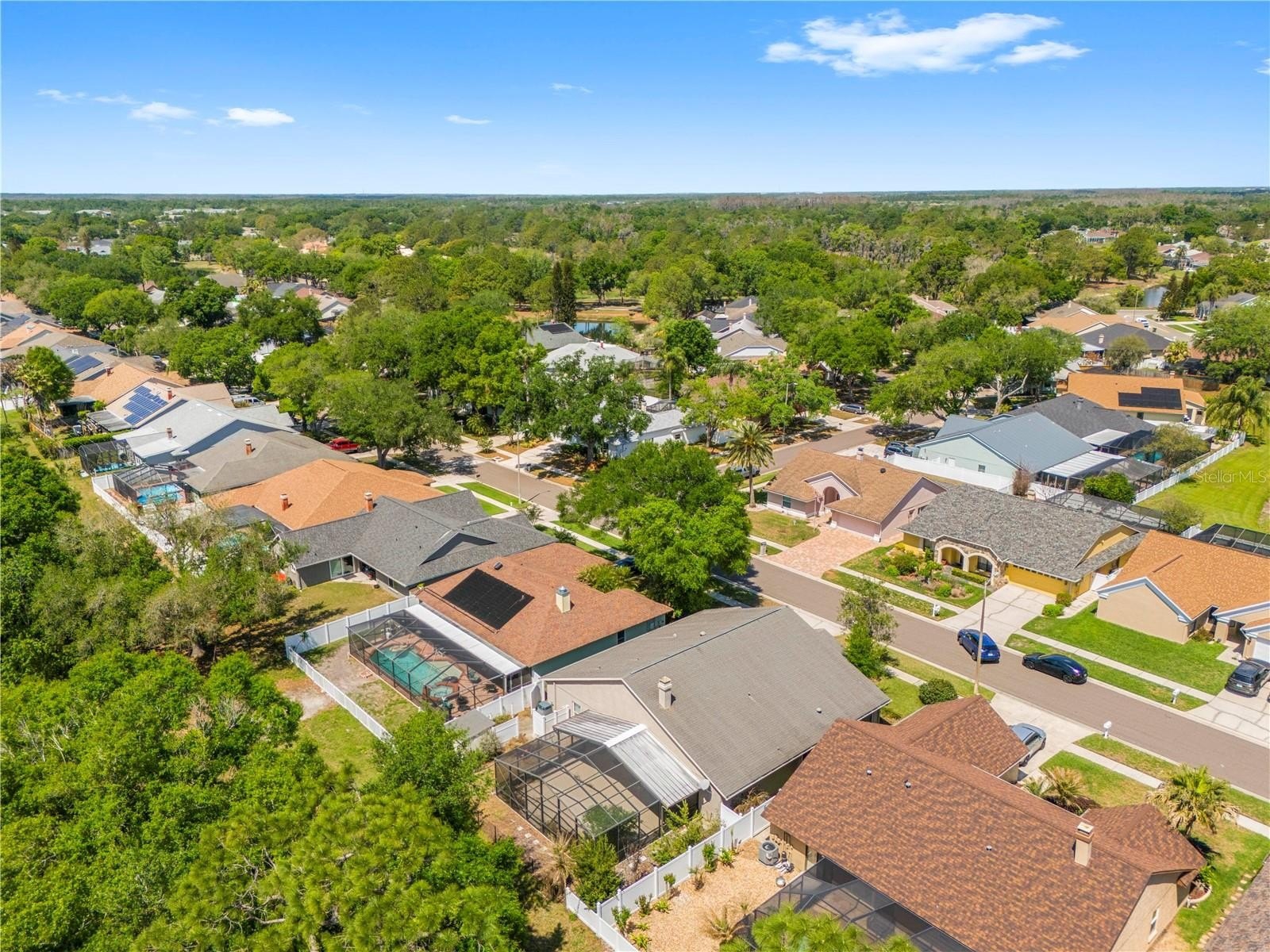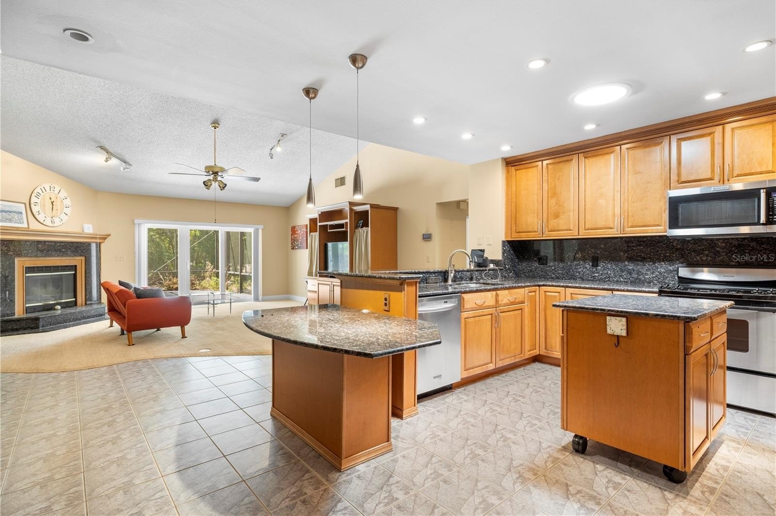 Pebble Creek Village! ONE STORY HOME WITH NO REAR NEIGHBORS!! 4 Bedroom 2.5 bath home with extra space for formal dining/ play room plus office space! This home offers northern charm and peaceful POND VIEWS, best enjoyed from the HUGE SCREENED REAR LANAI. The open layout features a great room with a granite-framed wood-burning fireplace and custom maple built-in cabinetry that continues into the kitchen. The kitchen includes GRANITE countertops and backsplash, a center island, stainless steel appliances, ample maple cabinetry, and a built-in workspace. The primary suite provides lanai access with water views and an ensuite bath featuring dual sinks, a garden tub, and a remodeled walk-in shower. A nearby bedroom includes a private mini-bath with shared access to the primary bath, offering a unique and functional layout. Split floor plan with 2 bedrooms on one side of the home and other 2 on half. Additional features include updated plumbing, energy-efficient double-pane windows and sliding doors, solar tubes for natural light, an interior laundry room, and a two-car garage. Conveniently located near I-75 with access to Tampa, Wesley Chapel, and community amenities including playground, tennis and basketball courts!