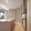 The kitchen presents a clean, contemporary design with custom cabinetry, warm wood accents, and a striking Taj Mahal stone feature wall that continues through the countertops and backsplash. An oversized island anchors the space, while sculptural lighting and a complete Thermador appliance package enhance both form and function, creating an ideal setting for everyday living and entertaining.