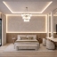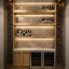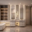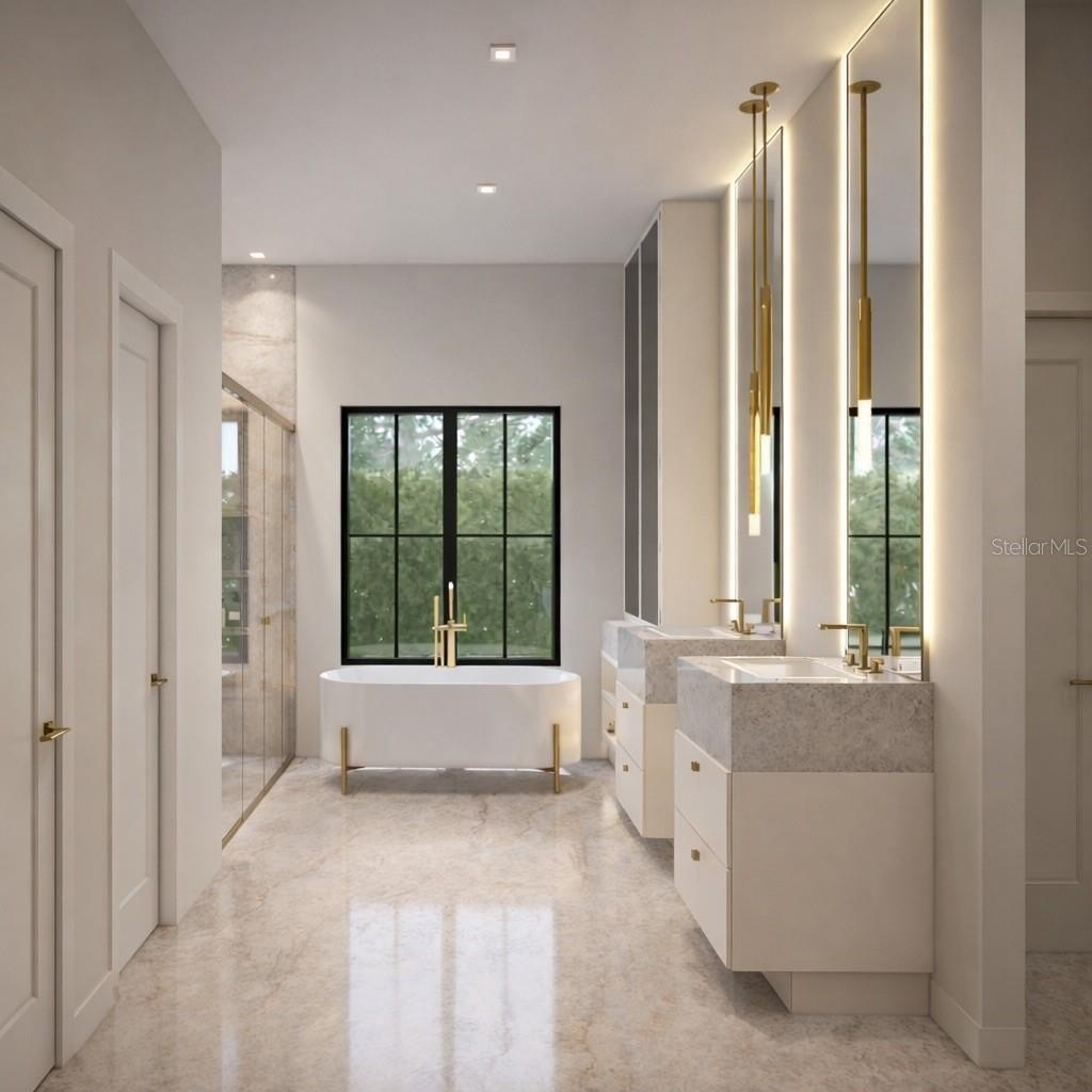The first-floor primary suite is a private retreat defined by a serene palette, clean lines, and soft integrated lighting. The spa-inspired primary bath features Taj Mahal stone flooring, shower walls, and countertops, paired with a freestanding tub, a refined double vanity with vertical lighting, and warm gold accents that bring a sense of understated luxury. An expansive walk-in closet with custom cabinetry offers dedicated his-and-hers storage with a tailored, boutique feel.