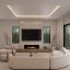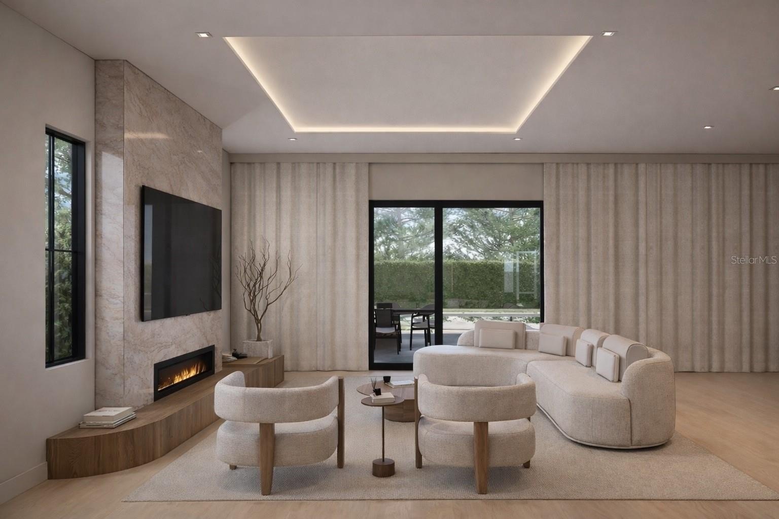 The main living spaces are designed with a seamless, open-concept layout, where the kitchen, dining, and living areas connect effortlessly and extend to the outdoors through expansive sliding glass doors. The living room features a statement Taj Mahal stone TV wall with a sleek fireplace, complemented by soft neutral tones, warm recessed lighting, and curated finishes that create a calm, elevated atmosphere. A refined built-in wine bar showcases warm wood cabinetry, soft integrated lighting, glass-enclosed storage, and dual wine fridges, adding both function and visual impact. Engineered hardwood flooring runs throughout, adding warmth and continuity to the home’s contemporary aesthetic.