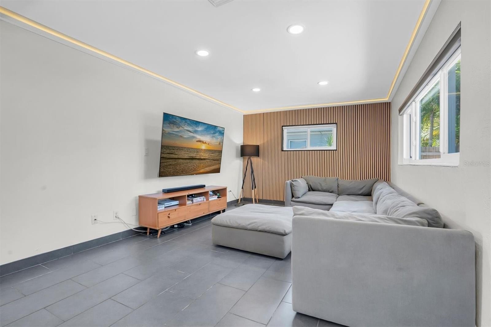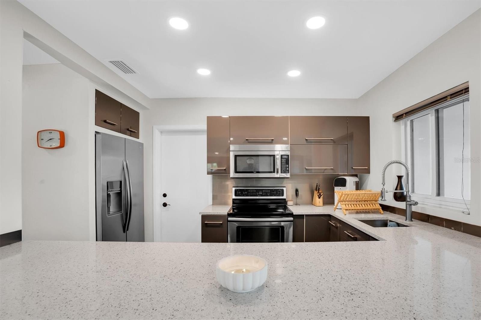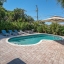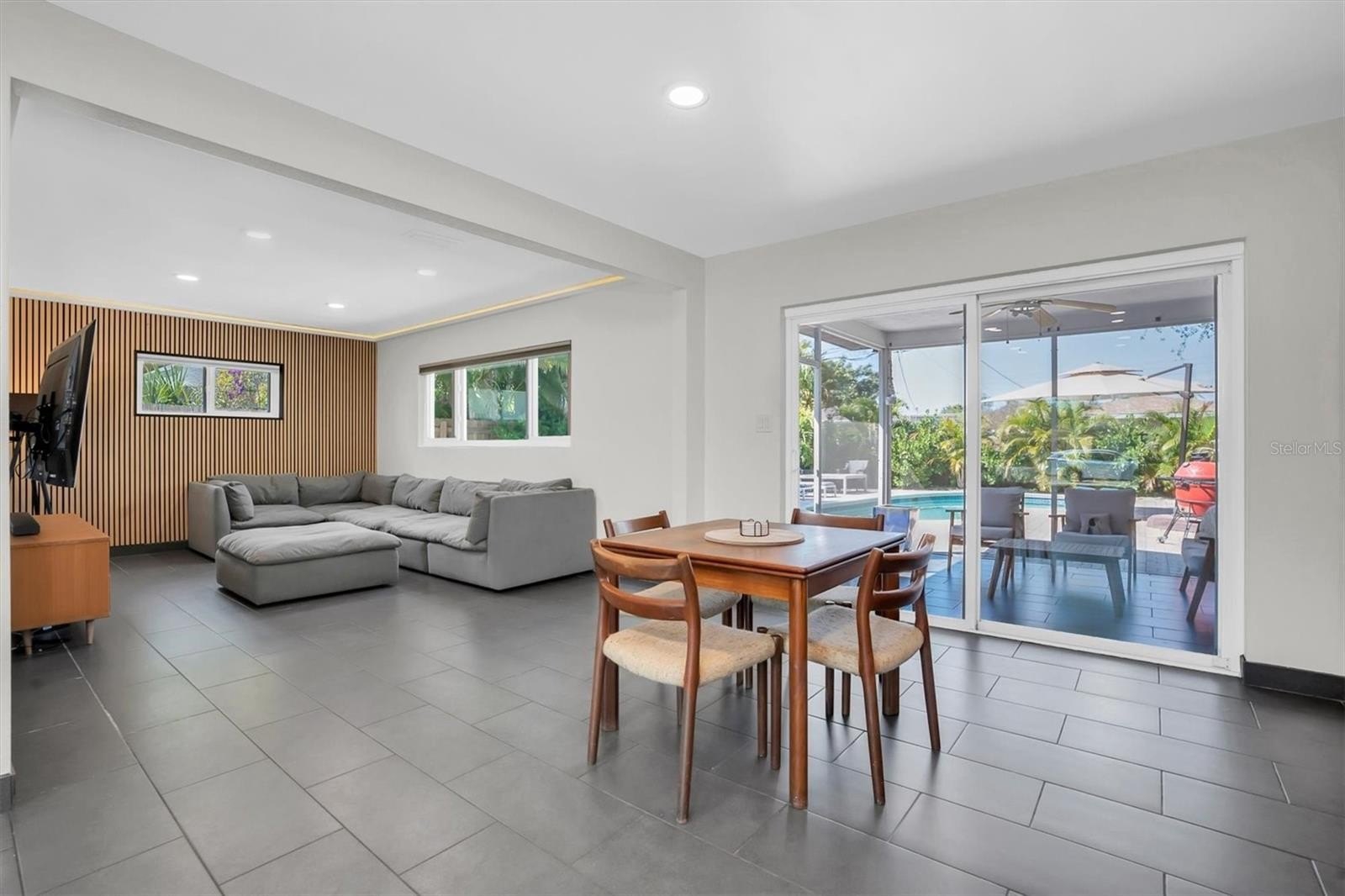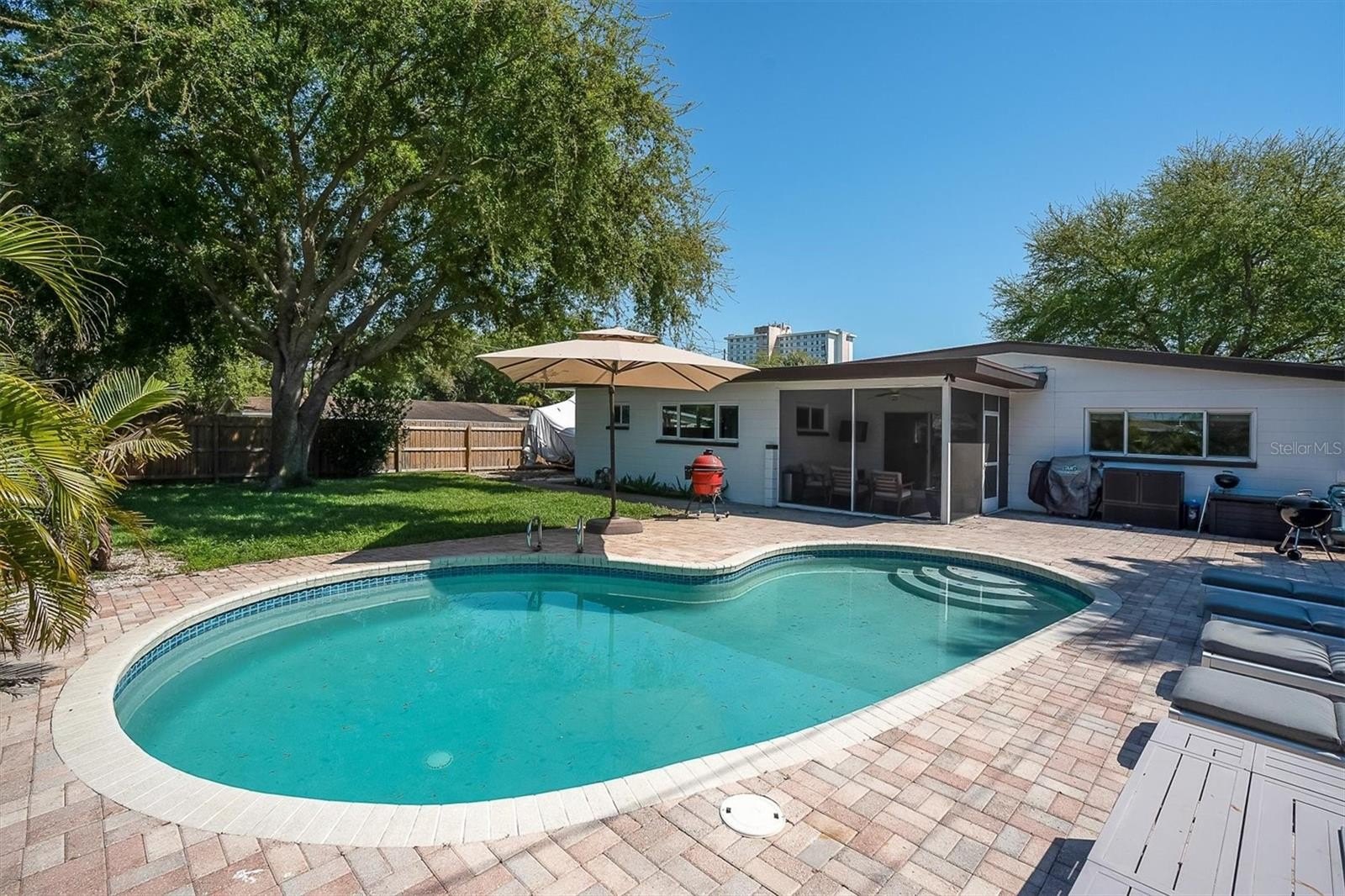Step into timeless style with this authentic Mid-Century Modern 2-bedroom, 2-bath block home—perfectly blending classic design with today’s must-have updates. Located in a no flood zone and thoughtfully upgraded throughout, this property offers true peace of mind with a new roof (2024), impact-rated windows and sliders, a custom front door, and a 2022 AC system. Situated on a desirable corner lot, the property features a huge fenced yard (2024), mature landscaping, and plenty of space for all your lifestyle needs—including boat or RV parking. The outdoor living is a true highlight, with an expansive paver patio, covered and screened lanai, and a stunning saltwater pool with a 2023 system—perfect for relaxing or entertaining year-round. Inside, the home blends classic design with modern upgrades. The updated kitchen features quartz countertops, Whirlpool Gold Series stainless steel appliances, and generous storage. A spacious living and dining room combo is enhanced by a custom soundproof accent wall with theater lighting, creating a unique and inviting atmosphere. Tile flooring throughout adds durability and a clean, cohesive look. The oversized primary suite is a true retreat, complete with a walk-in closet featuring quartz built-ins and a beautifully updated ensuite bathroom with a double vanity and a sleek glass-enclosed rainfall shower. The second bedroom is generously sized with dual closets, and the home offers ample storage throughout. Additional features include an oversized one-car garage, paver driveway, and a new custom front door that enhances curb appeal. Ideally located just 10 minutes to Treasure Island Beach and 10 minutes to Downtown St. Petersburg, this home offers the perfect combination of character, updates, and convenience.