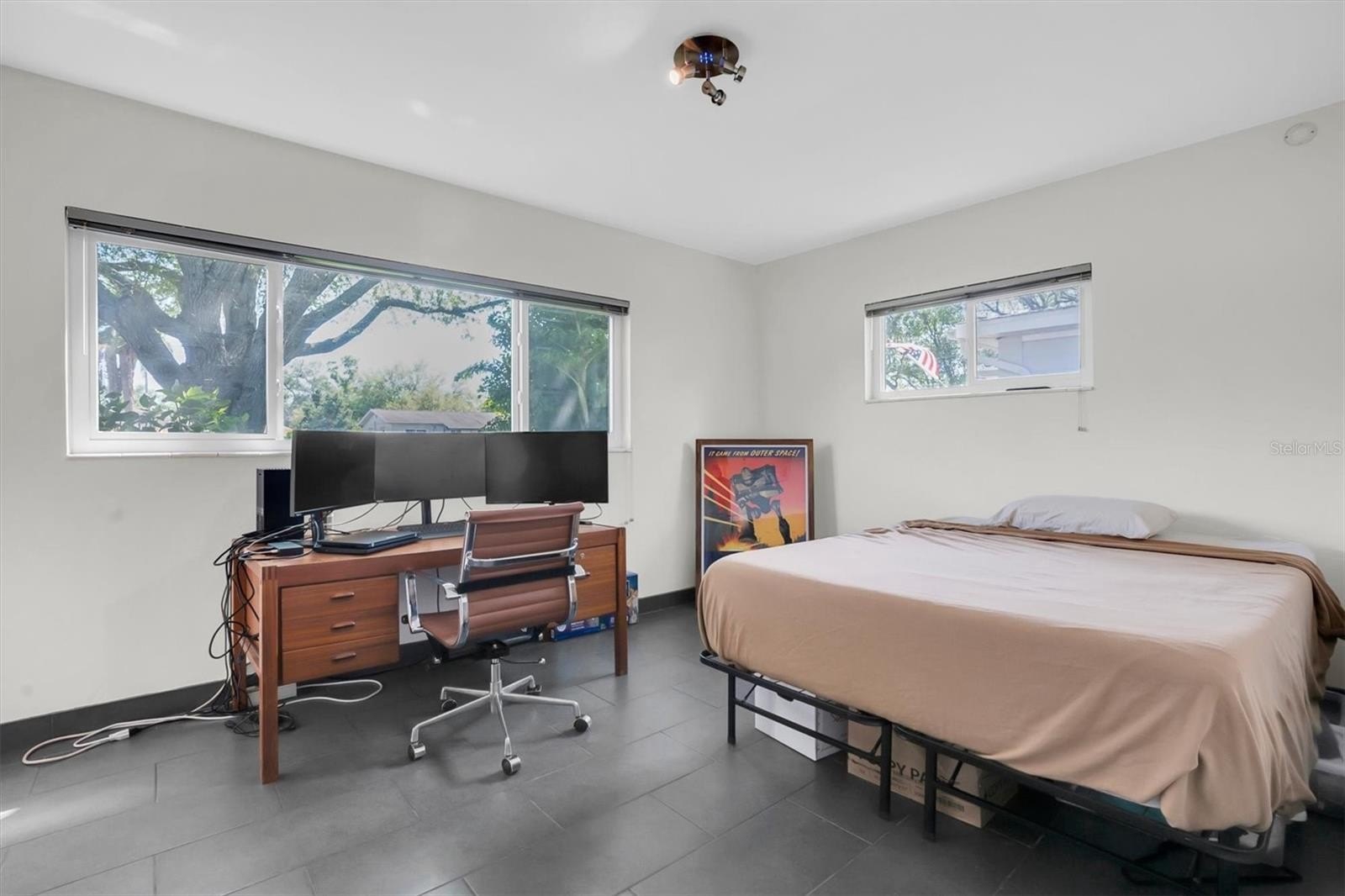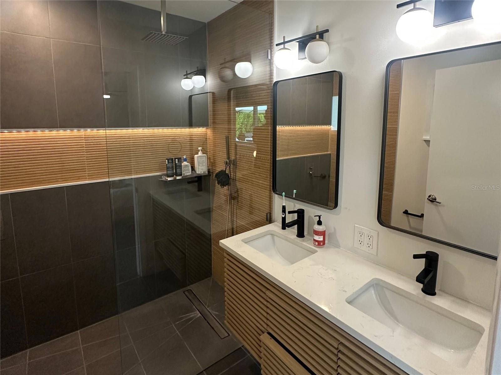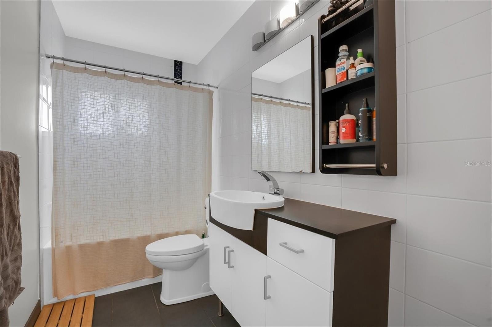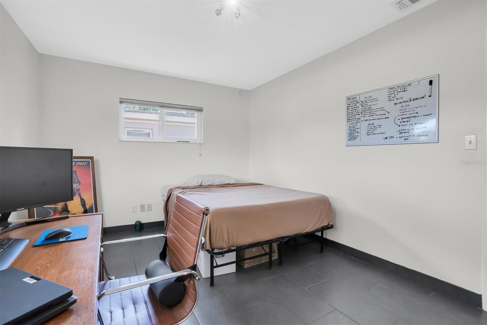 Step into timeless style with this authentic Mid-Century Modern 2-bedroom, 2-bath block home—perfectly blending classic design with today’s must-have updates. Located in a no flood zone and thoughtfully upgraded throughout, this property offers true peace of mind with a new roof (2024), impact-rated windows and sliders, a custom front door, and a 2022 AC system. Situated on a desirable corner lot, the property features a huge fenced yard (2024), mature landscaping, and plenty of space for all your lifestyle needs—including boat or RV parking. The outdoor living is a true highlight, with an expansive paver patio, covered and screened lanai, and a stunning saltwater pool with a 2023 system—perfect for relaxing or entertaining year-round. Inside, the home blends classic design with modern upgrades. The updated kitchen features quartz countertops, Whirlpool Gold Series stainless steel appliances, and generous storage. A spacious living and dining room combo is enhanced by a custom soundproof accent wall with theater lighting, creating a unique and inviting atmosphere. Tile flooring throughout adds durability and a clean, cohesive look. The oversized primary suite is a true retreat, complete with a walk-in closet featuring quartz built-ins and a beautifully updated ensuite bathroom with a double vanity and a sleek glass-enclosed rainfall shower. The second bedroom is generously sized with dual closets, and the home offers ample storage throughout. Additional features include an oversized one-car garage, paver driveway, and a new custom front door that enhances curb appeal. Ideally located just 10 minutes to Treasure Island Beach and 10 minutes to Downtown St. Petersburg, this home offers the perfect combination of character, updates, and convenience.