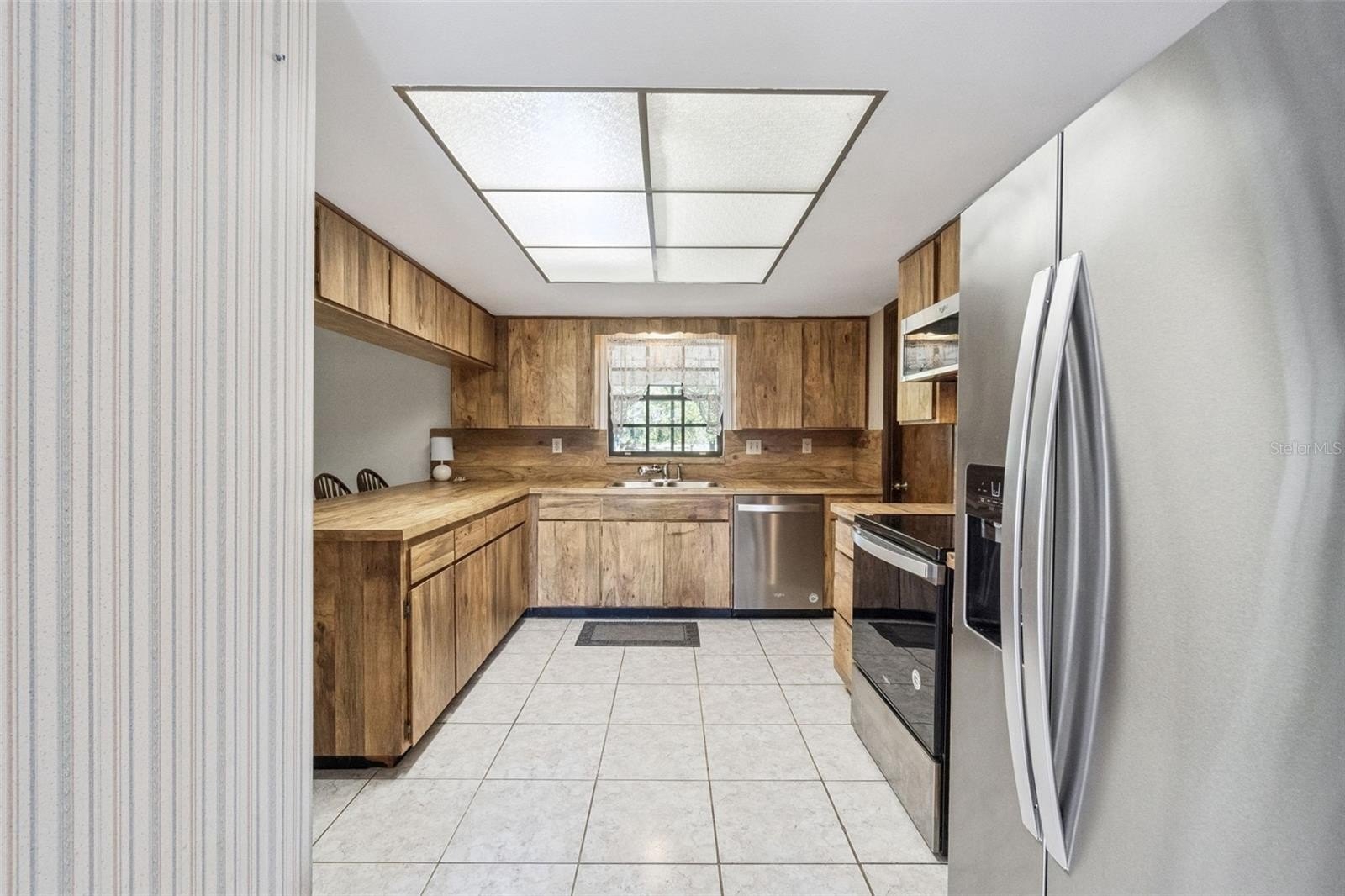 The home offers 4 bedrooms, 2 bathrooms, a living room, formal dining room, and a spacious family room open to the kitchen. A striking double-sided stone fireplace serves both the living and family rooms, creating a warm and inviting focal point. The kitchen is generously sized with abundant storage, ample counter space, a pantry, and nearly new matching stainless steel appliances. A breakfast bar comfortably seats four and overlooks the family room.