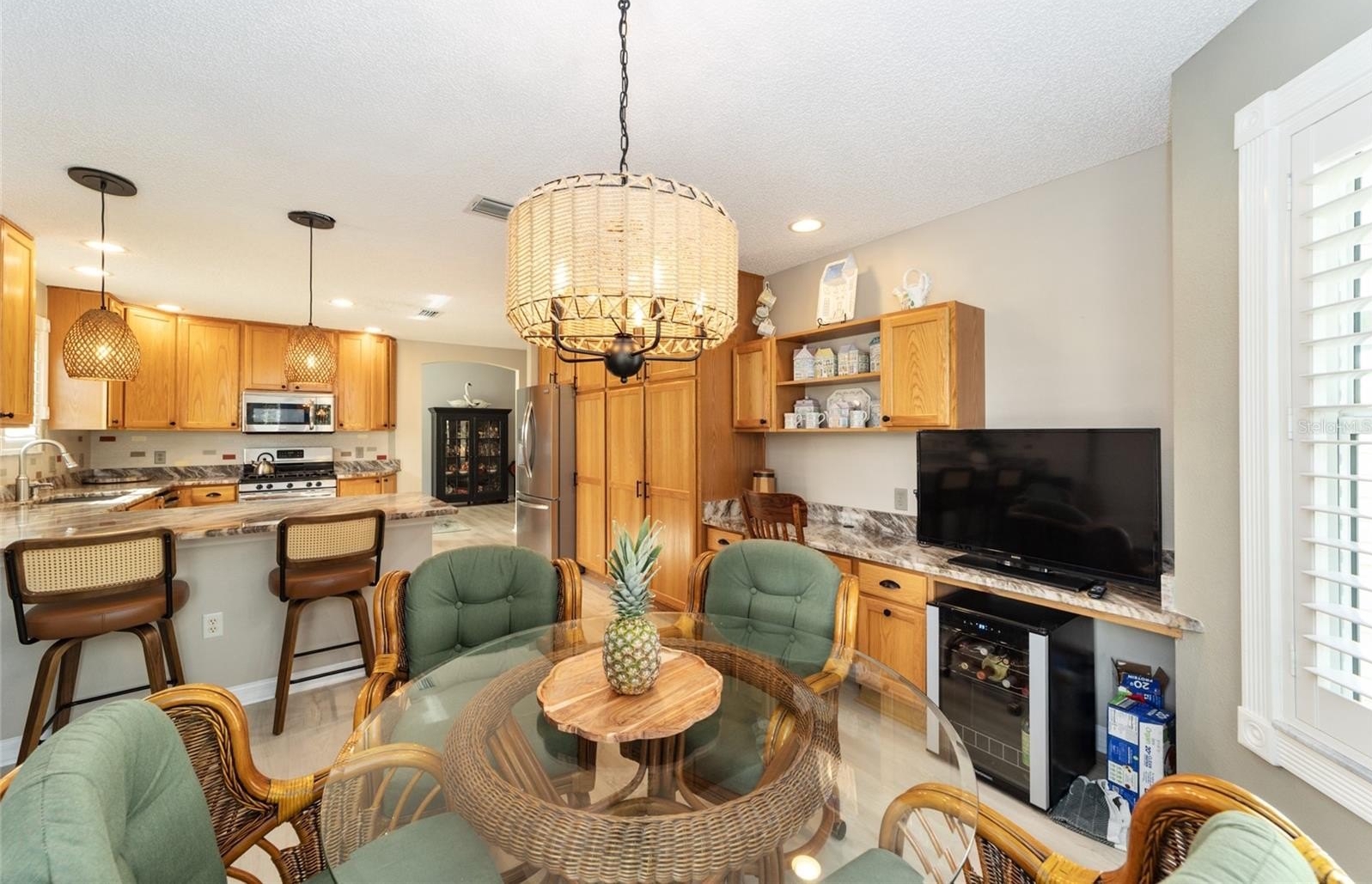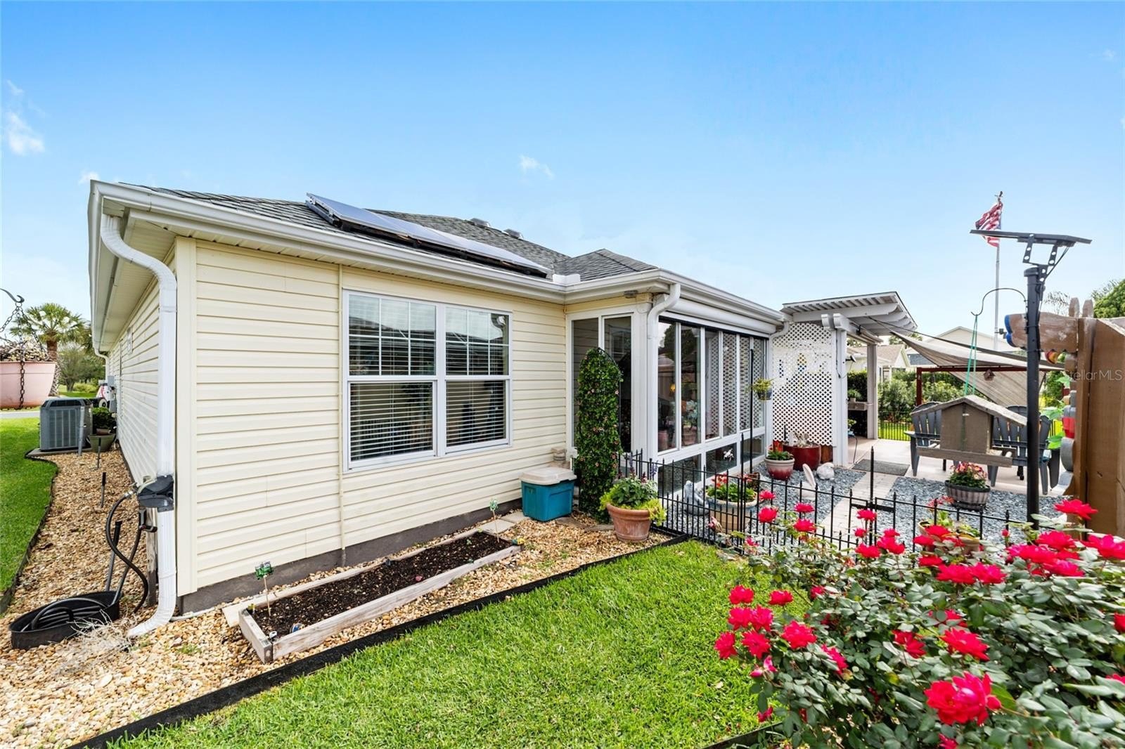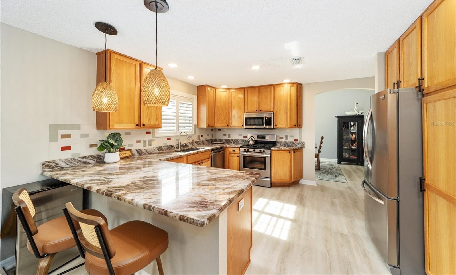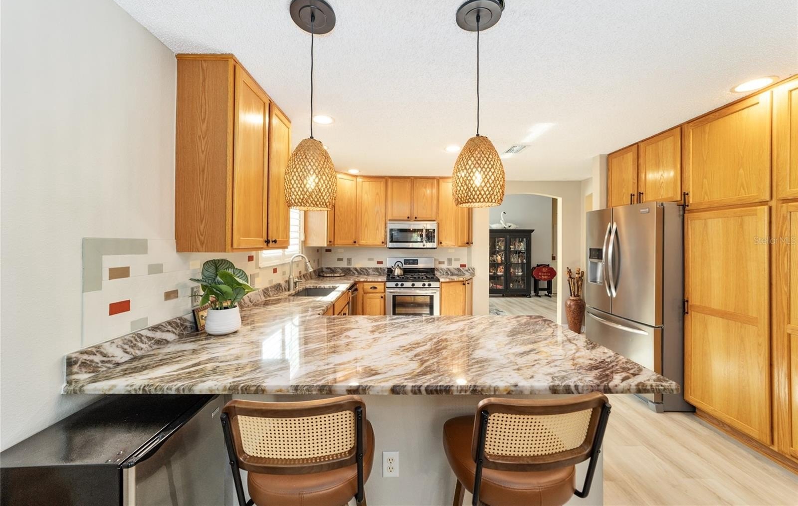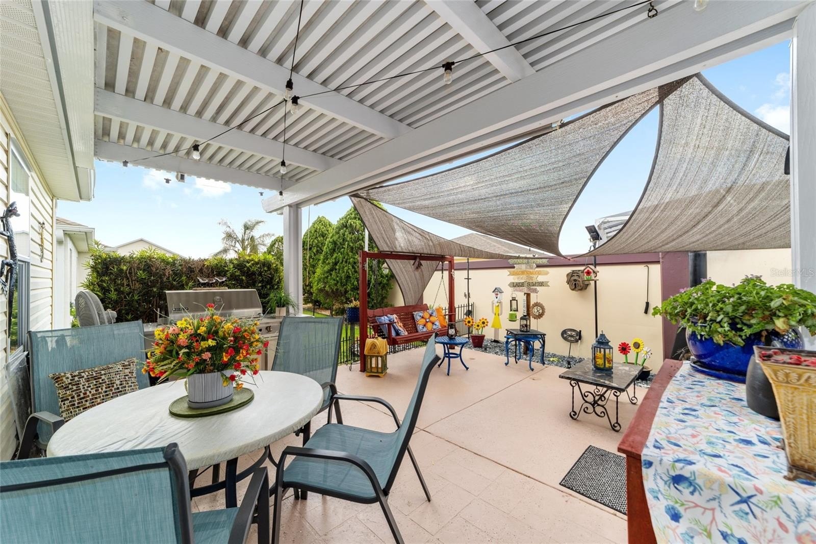 Located just a 2.5-mile ride to Lake Sumter Landing Market Square and LOW BOND | ROOF 2020 | HWH 2021 | GOLF CART GARAGE | PRIME LOCATION BETWEEN 466 & 466A ***WOW CURB APPEAL! ***This beautifully maintained and updated 3-BEDROOM, 2-BATH CYPRESS 1881 sf designer home is ideally located ACROSS FROM CANE GARDEN CHAMPIONSHIP GOLF COURSE in the highly desirable VILLAGE OF POINCIANA. This tastefully designed GOLF CART home is loaded with upgrades, such as NEW LVP FLOORING (2026) in main areas, VAULTED ceilings, PLANTATION SHUTTERS, UPGRADED WINDOW TRIM, and STUNNING QUARTZITE COUNTERTOPS throughout. The kitchen is a true centerpiece, featuring QUARTZITE granite countertops, STAINLESS STEEL APPLIANCES including a GAS STOVE, CABINETRY TO THE CEILING, TWO PANTRIES, a BREAKFAST BAR, BUILT-IN DESK, and DESIGNER LIGHTING. The laundry room continues the high-end feel with coordinating cabinetry, built-in desk, sink, and quartzite countertop. The spacious primary bedroom offers a WALK-IN CLOSET and a beautifully updated EN SUITE BATH with a REMODELED SHOWER, while the 2 guest bedrooms are generously sized with HARDWOOD FLOORING and ample closet space. Enjoy year-round living in the ENCLOSED FLORIDA ROOM complete with an AUTOMATIC SUNSHADE and DESIGNER BLINDS. Step outside to your private backyard oasis featuring a STUCCO PRIVACY WALL, PERGOLA, WATERPROOF SHADE SAILS, and a CHARMING WOODEN SWING. Low maintenance and ready for entertaining. Additional highlights include a GARAGE WITH PAINTED FLOORS, BUILT-IN CABINETRY, and CUSTOM WORK COUNTERTOP, a WHOLE-HOUSE KENMORE WATER SOFTENER AND PURIFIER, and PULL-DOWN ATTIC STAIRS WITH ABUNDANT STORAGE.