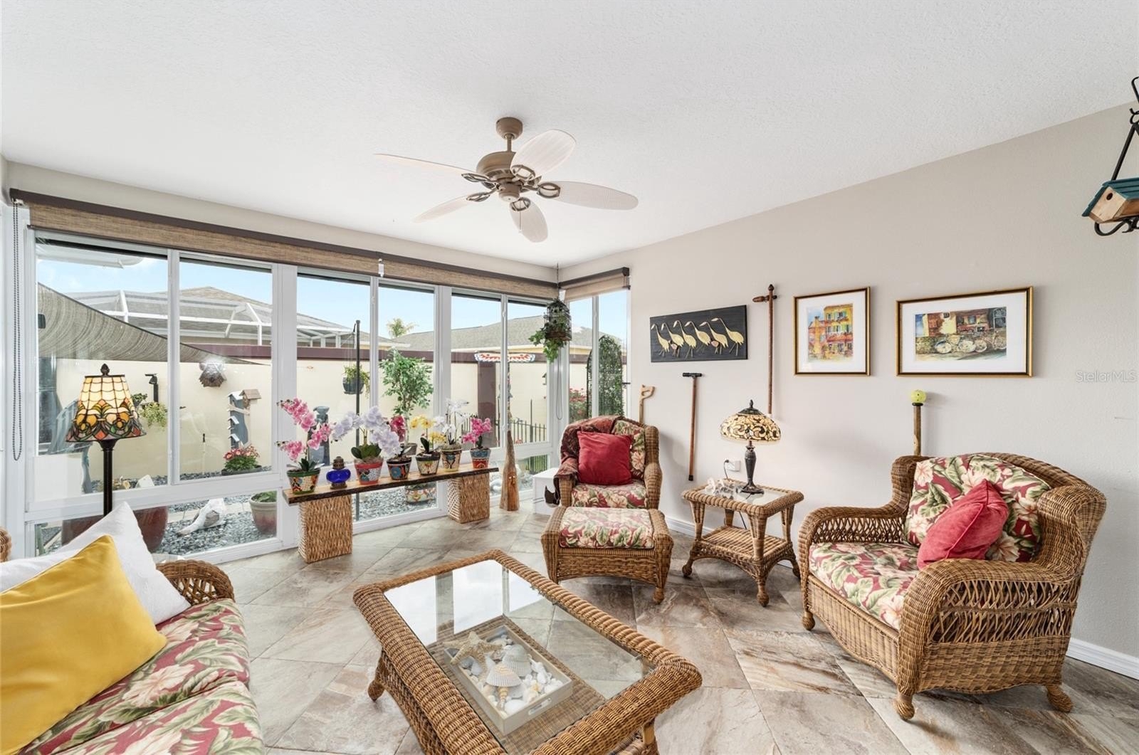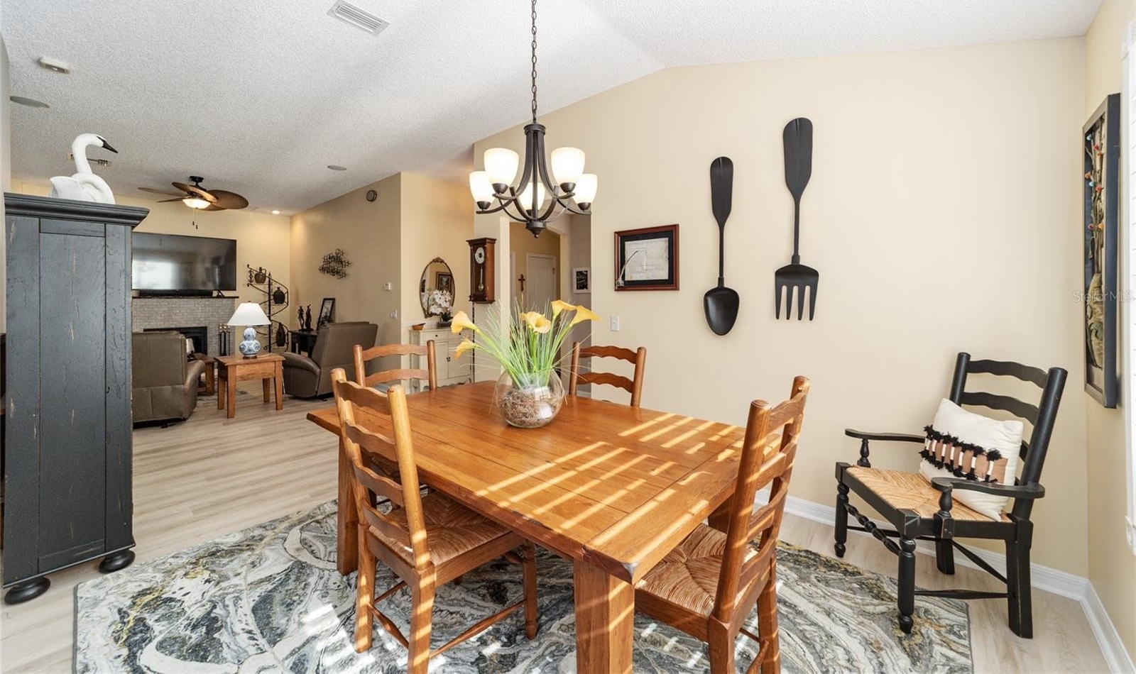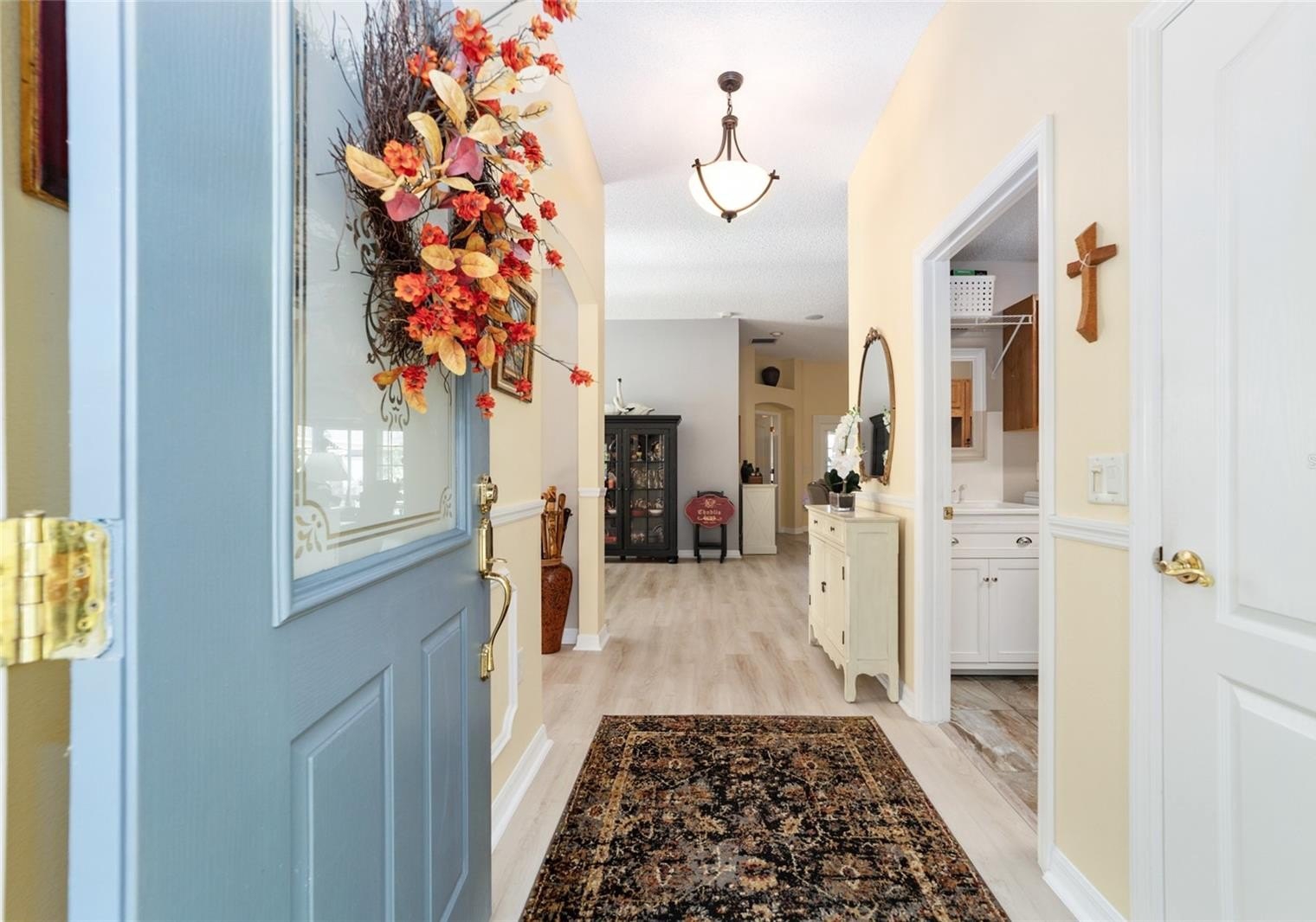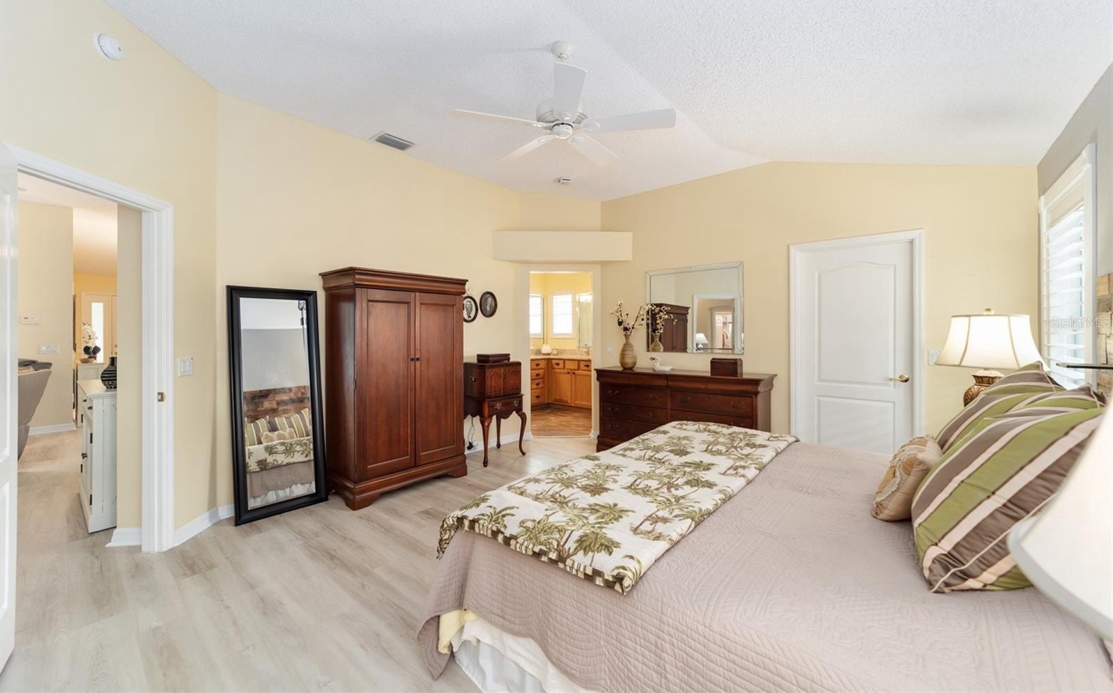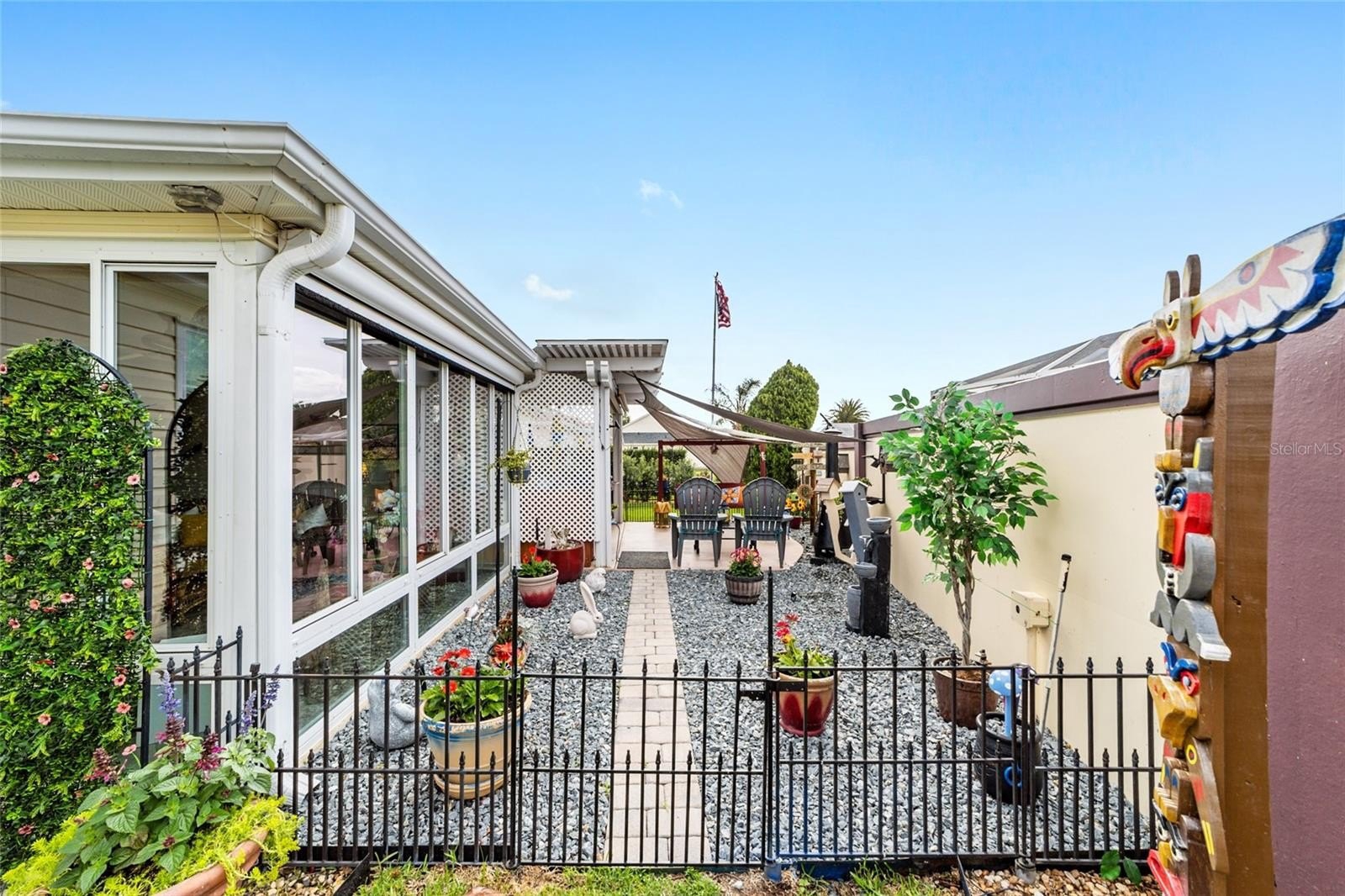 Located just a 2.5-mile ride to Lake Sumter Landing Market Square and LOW BOND | ROOF 2020 | HWH 2021 | GOLF CART GARAGE | PRIME LOCATION BETWEEN 466 & 466A ***WOW CURB APPEAL! ***This beautifully maintained and updated 3-BEDROOM, 2-BATH CYPRESS 1881 sf designer home is ideally located ACROSS FROM CANE GARDEN CHAMPIONSHIP GOLF COURSE in the highly desirable VILLAGE OF POINCIANA. This tastefully designed GOLF CART home is loaded with upgrades, such as NEW LVP FLOORING (2026) in main areas, VAULTED ceilings, PLANTATION SHUTTERS, UPGRADED WINDOW TRIM, and STUNNING QUARTZITE COUNTERTOPS throughout. The kitchen is a true centerpiece, featuring QUARTZITE granite countertops, STAINLESS STEEL APPLIANCES including a GAS STOVE, CABINETRY TO THE CEILING, TWO PANTRIES, a BREAKFAST BAR, BUILT-IN DESK, and DESIGNER LIGHTING. The laundry room continues the high-end feel with coordinating cabinetry, built-in desk, sink, and quartzite countertop. The spacious primary bedroom offers a WALK-IN CLOSET and a beautifully updated EN SUITE BATH with a REMODELED SHOWER, while the 2 guest bedrooms are generously sized with HARDWOOD FLOORING and ample closet space. Enjoy year-round living in the ENCLOSED FLORIDA ROOM complete with an AUTOMATIC SUNSHADE and DESIGNER BLINDS. Step outside to your private backyard oasis featuring a STUCCO PRIVACY WALL, PERGOLA, WATERPROOF SHADE SAILS, and a CHARMING WOODEN SWING. Low maintenance and ready for entertaining. Additional highlights include a GARAGE WITH PAINTED FLOORS, BUILT-IN CABINETRY, and CUSTOM WORK COUNTERTOP, a WHOLE-HOUSE KENMORE WATER SOFTENER AND PURIFIER, and PULL-DOWN ATTIC STAIRS WITH ABUNDANT STORAGE.