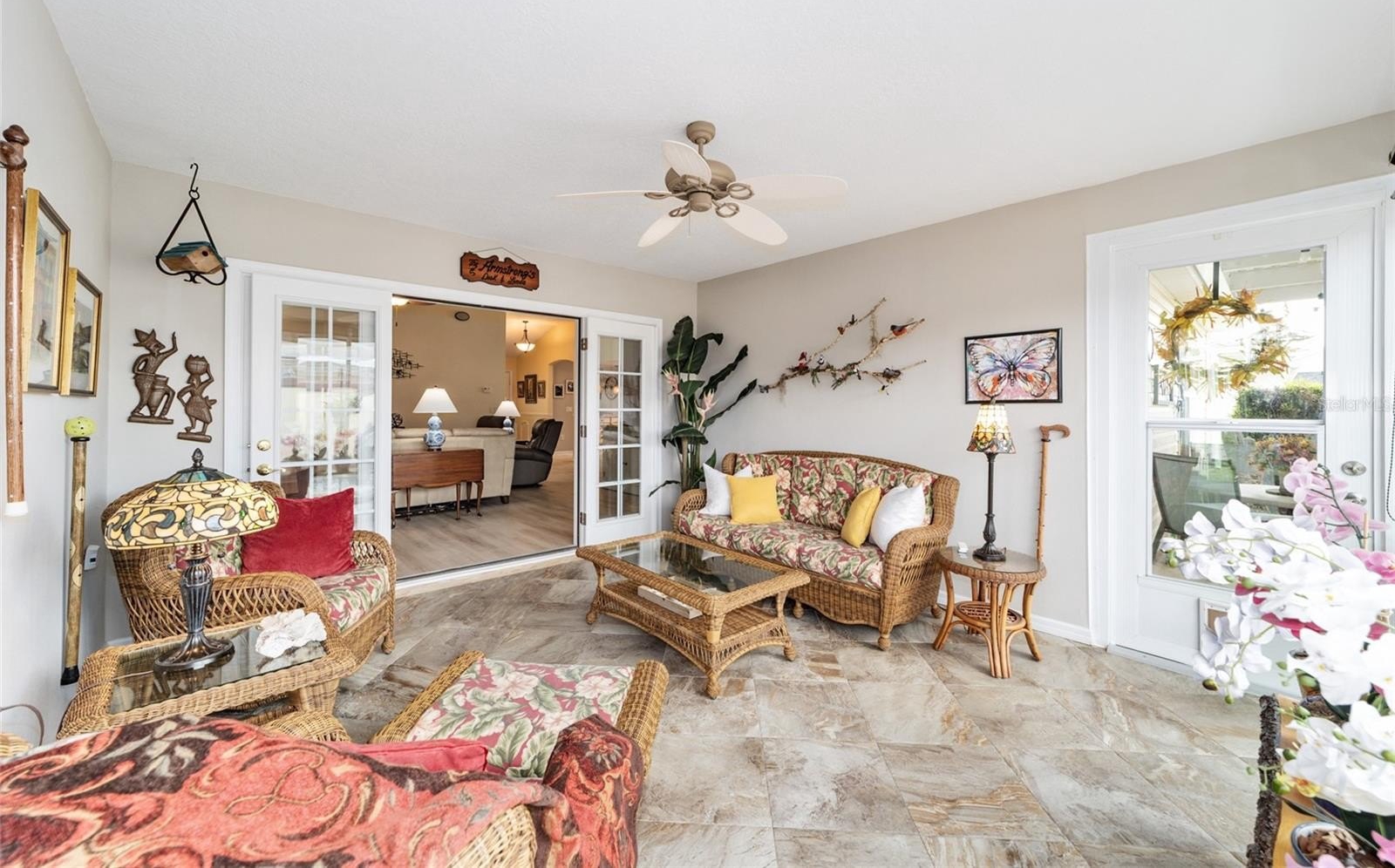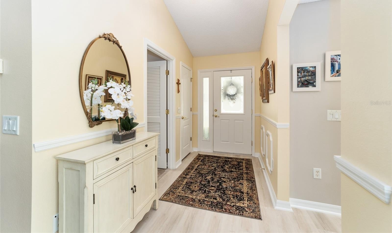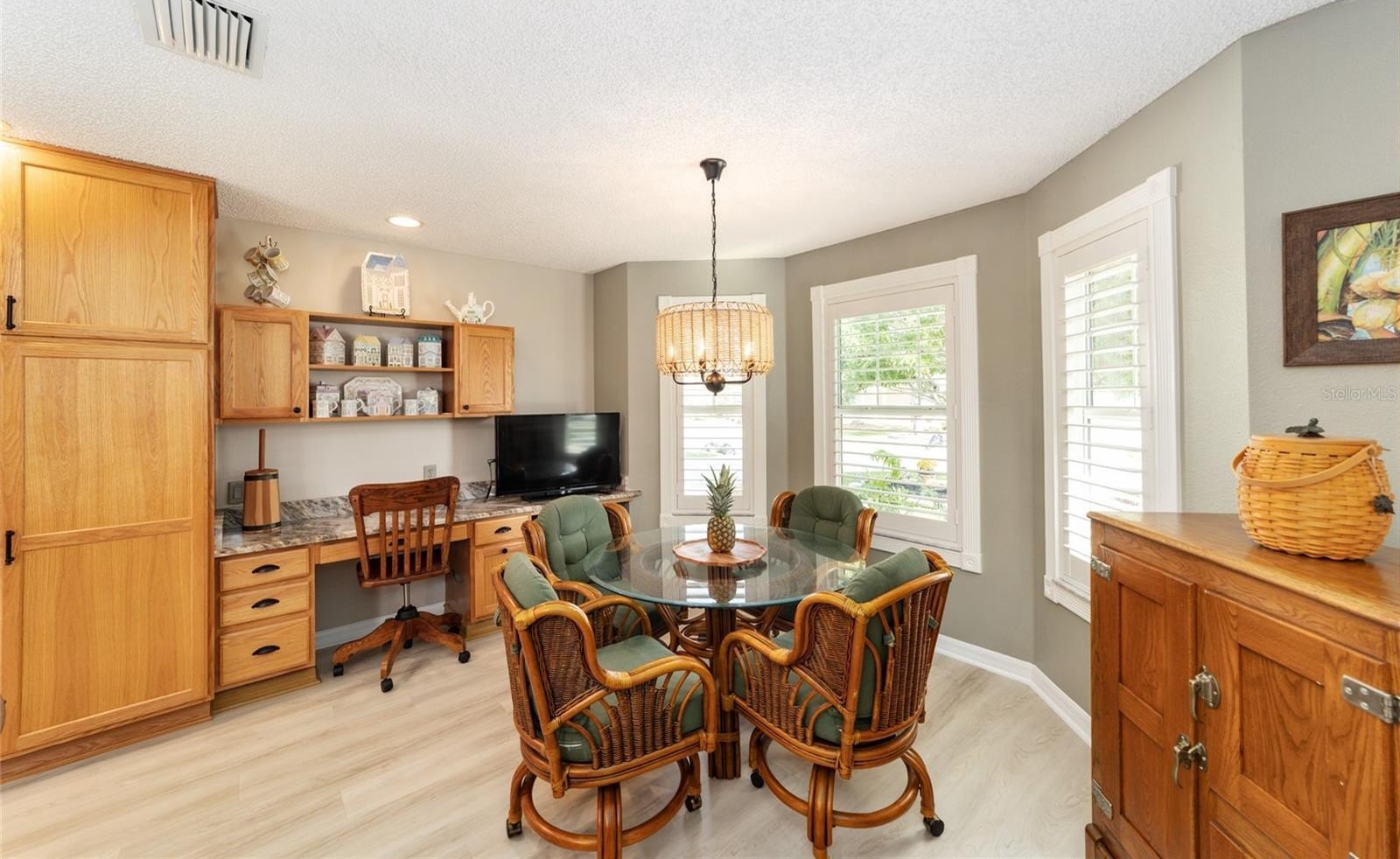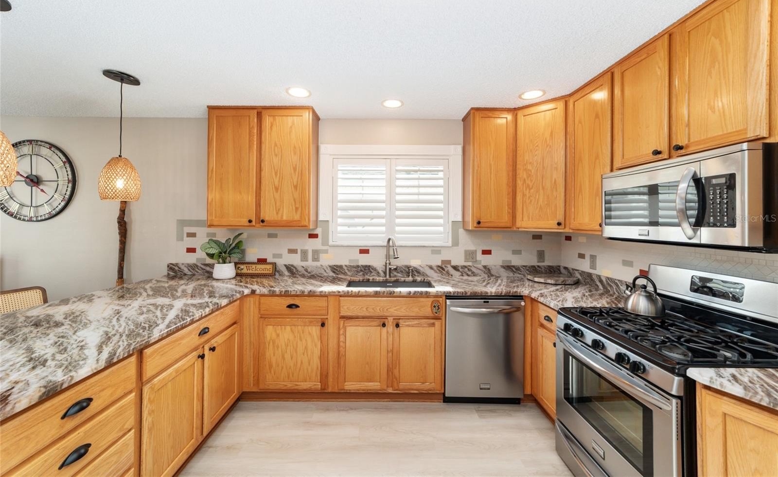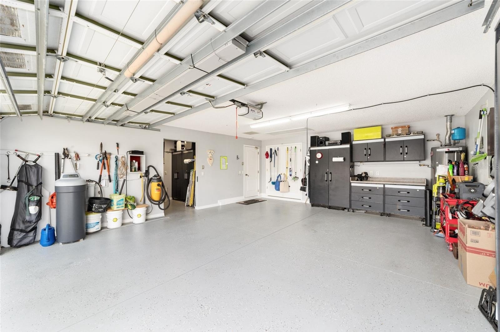 Located just a 2.5-mile ride to Lake Sumter Landing Market Square and LOW BOND | ROOF 2020 | HWH 2021 | GOLF CART GARAGE | PRIME LOCATION BETWEEN 466 & 466A ***WOW CURB APPEAL! ***This beautifully maintained and updated 3-BEDROOM, 2-BATH CYPRESS 1881 sf designer home is ideally located ACROSS FROM CANE GARDEN CHAMPIONSHIP GOLF COURSE in the highly desirable VILLAGE OF POINCIANA. This tastefully designed GOLF CART home is loaded with upgrades, such as NEW LVP FLOORING (2026) in main areas, VAULTED ceilings, PLANTATION SHUTTERS, UPGRADED WINDOW TRIM, and STUNNING QUARTZITE COUNTERTOPS throughout. The kitchen is a true centerpiece, featuring QUARTZITE granite countertops, STAINLESS STEEL APPLIANCES including a GAS STOVE, CABINETRY TO THE CEILING, TWO PANTRIES, a BREAKFAST BAR, BUILT-IN DESK, and DESIGNER LIGHTING. The laundry room continues the high-end feel with coordinating cabinetry, built-in desk, sink, and quartzite countertop. The spacious primary bedroom offers a WALK-IN CLOSET and a beautifully updated EN SUITE BATH with a REMODELED SHOWER, while the 2 guest bedrooms are generously sized with HARDWOOD FLOORING and ample closet space. Enjoy year-round living in the ENCLOSED FLORIDA ROOM complete with an AUTOMATIC SUNSHADE and DESIGNER BLINDS. Step outside to your private backyard oasis featuring a STUCCO PRIVACY WALL, PERGOLA, WATERPROOF SHADE SAILS, and a CHARMING WOODEN SWING. Low maintenance and ready for entertaining. Additional highlights include a GARAGE WITH PAINTED FLOORS, BUILT-IN CABINETRY, and CUSTOM WORK COUNTERTOP, a WHOLE-HOUSE KENMORE WATER SOFTENER AND PURIFIER, and PULL-DOWN ATTIC STAIRS WITH ABUNDANT STORAGE.