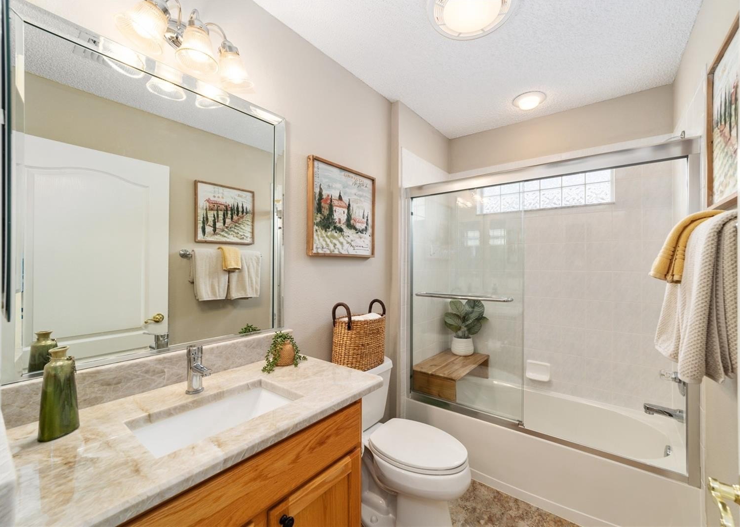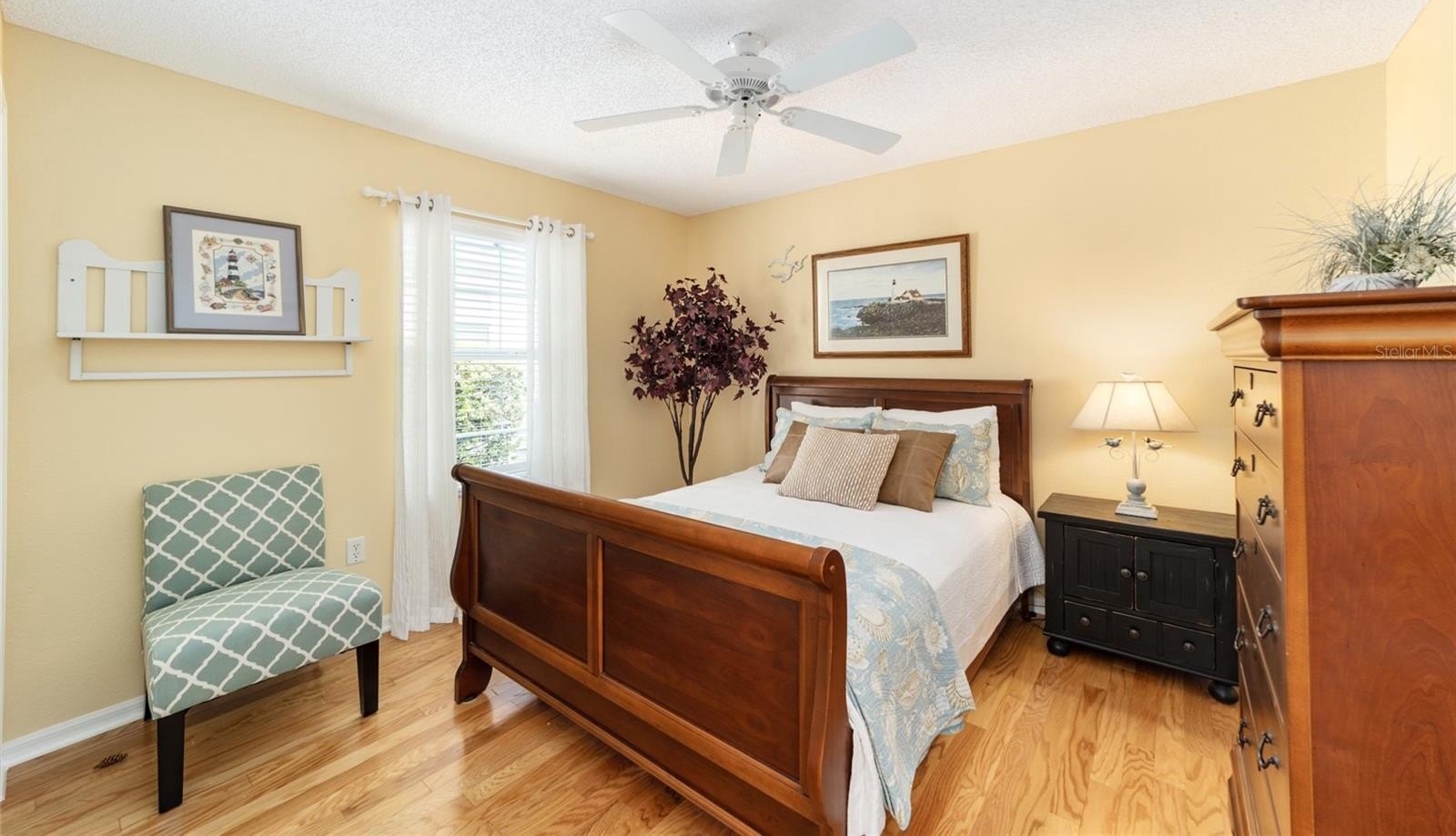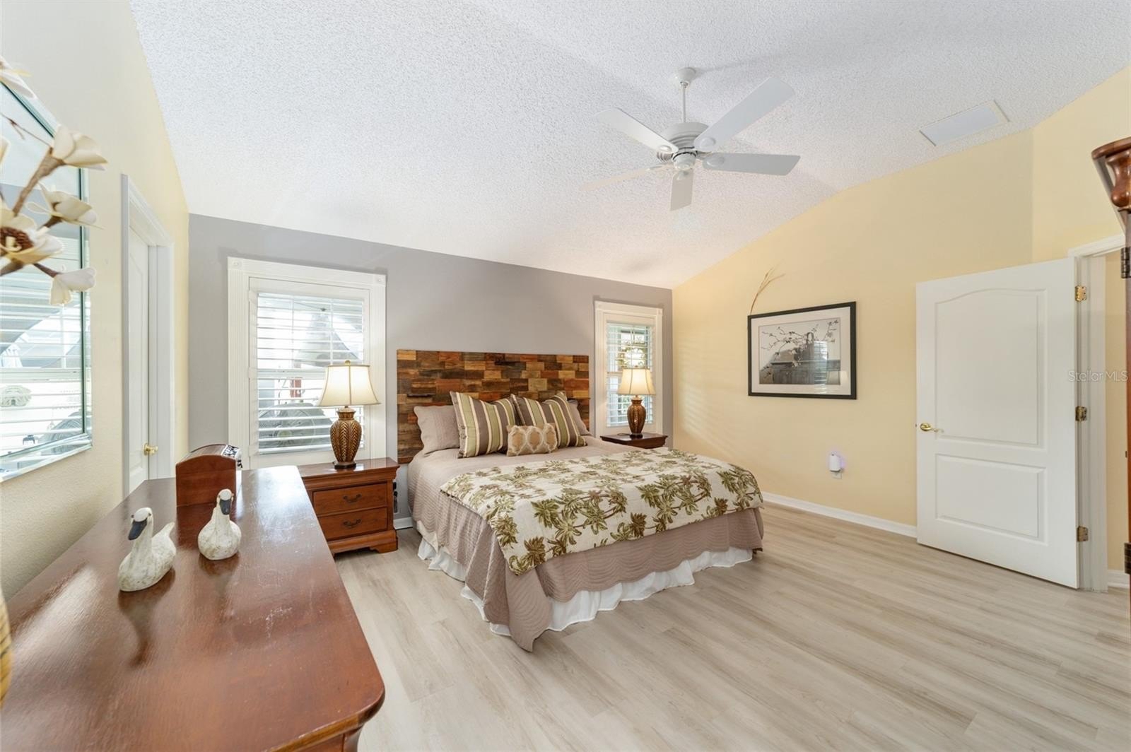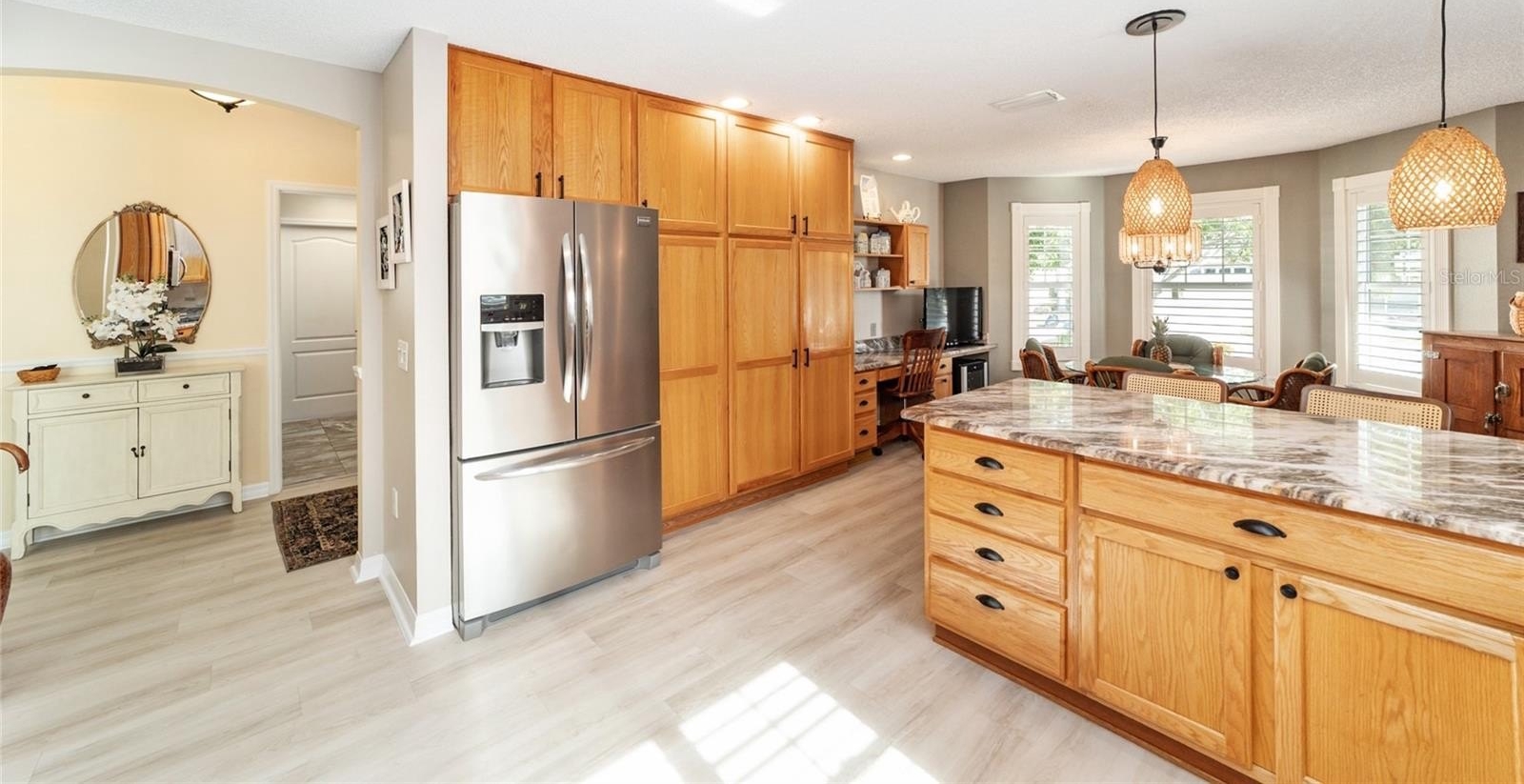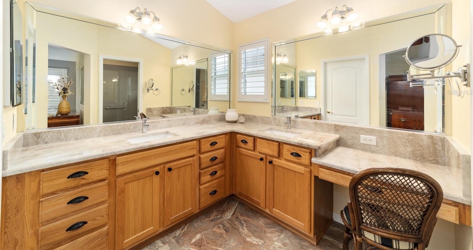 Located just a 2.5-mile ride to Lake Sumter Landing Market Square and LOW BOND | ROOF 2020 | HWH 2021 | GOLF CART GARAGE | PRIME LOCATION BETWEEN 466 & 466A ***WOW CURB APPEAL! ***This beautifully maintained and updated 3-BEDROOM, 2-BATH CYPRESS 1881 sf designer home is ideally located ACROSS FROM CANE GARDEN CHAMPIONSHIP GOLF COURSE in the highly desirable VILLAGE OF POINCIANA. This tastefully designed GOLF CART home is loaded with upgrades, such as NEW LVP FLOORING (2026) in main areas, VAULTED ceilings, PLANTATION SHUTTERS, UPGRADED WINDOW TRIM, and STUNNING QUARTZITE COUNTERTOPS throughout. The kitchen is a true centerpiece, featuring QUARTZITE granite countertops, STAINLESS STEEL APPLIANCES including a GAS STOVE, CABINETRY TO THE CEILING, TWO PANTRIES, a BREAKFAST BAR, BUILT-IN DESK, and DESIGNER LIGHTING. The laundry room continues the high-end feel with coordinating cabinetry, built-in desk, sink, and quartzite countertop. The spacious primary bedroom offers a WALK-IN CLOSET and a beautifully updated EN SUITE BATH with a REMODELED SHOWER, while the 2 guest bedrooms are generously sized with HARDWOOD FLOORING and ample closet space. Enjoy year-round living in the ENCLOSED FLORIDA ROOM complete with an AUTOMATIC SUNSHADE and DESIGNER BLINDS. Step outside to your private backyard oasis featuring a STUCCO PRIVACY WALL, PERGOLA, WATERPROOF SHADE SAILS, and a CHARMING WOODEN SWING. Low maintenance and ready for entertaining. Additional highlights include a GARAGE WITH PAINTED FLOORS, BUILT-IN CABINETRY, and CUSTOM WORK COUNTERTOP, a WHOLE-HOUSE KENMORE WATER SOFTENER AND PURIFIER, and PULL-DOWN ATTIC STAIRS WITH ABUNDANT STORAGE.
