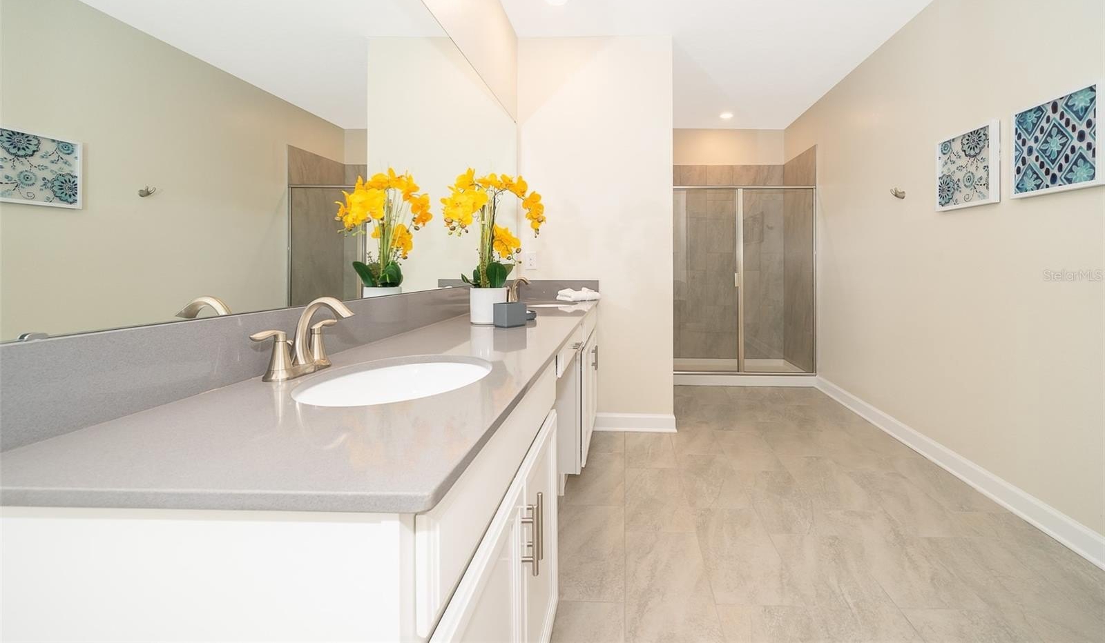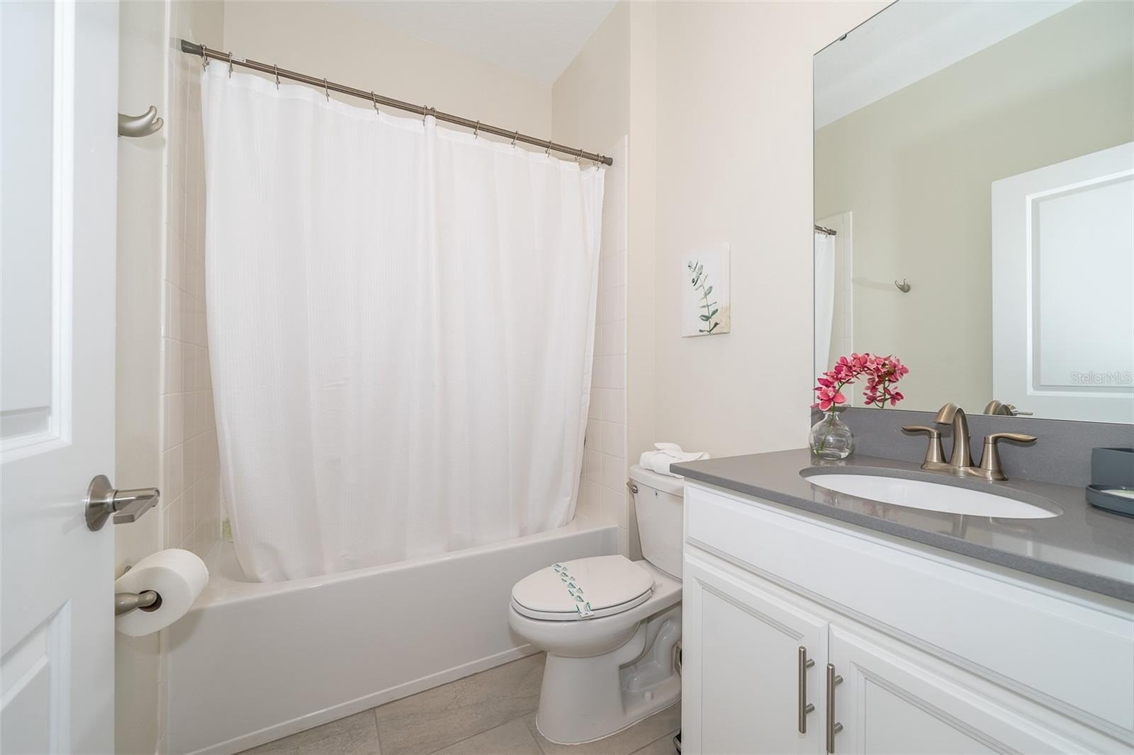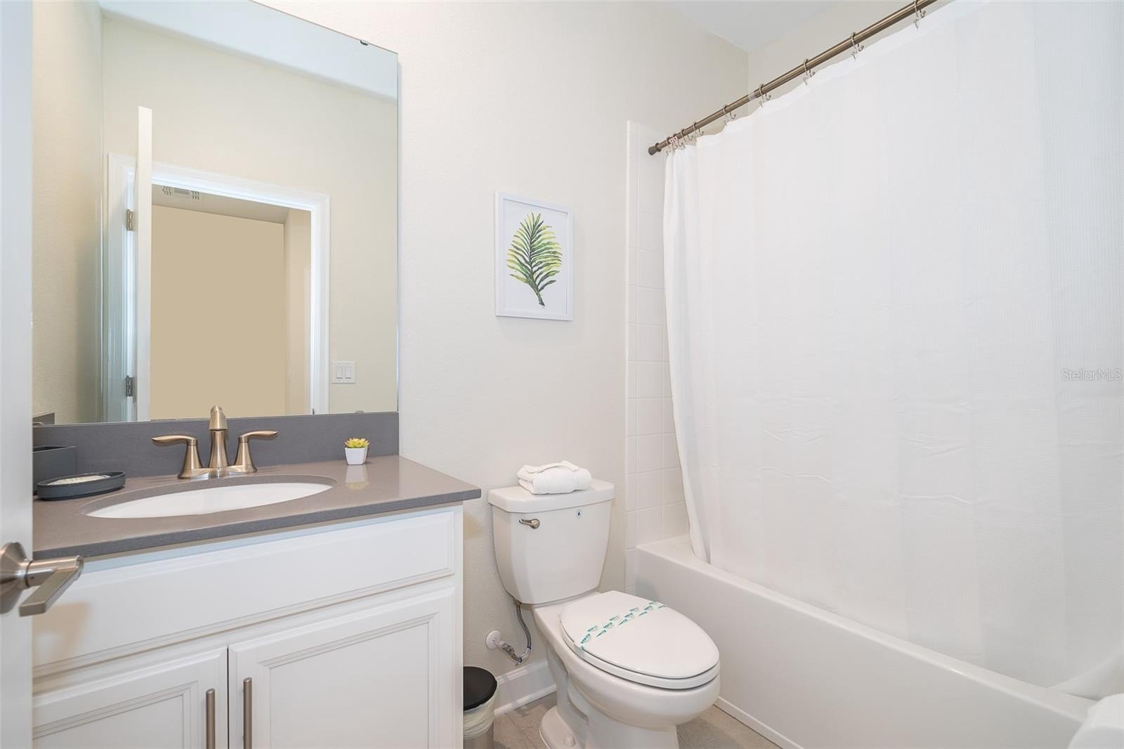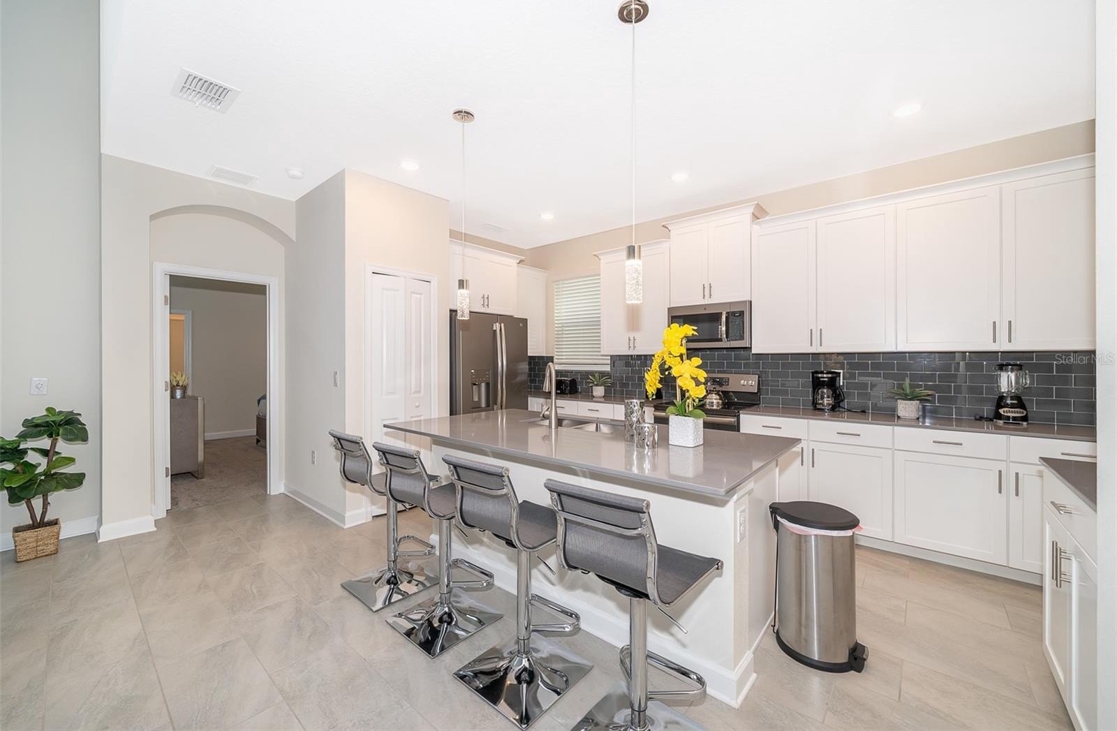 The home offers a modern kitchen with quartz countertops, 42-inch cabinets, slate appliances, and window blinds, providing both style and functionality. Residents and guests enjoy access to resort-style amenities, including a Tiki Bar and Grille, canoe and kayak rentals, a lazy river, fitness center, miniature golf, quiet pool, splash pad, double water slide, volleyball court, and sports court.