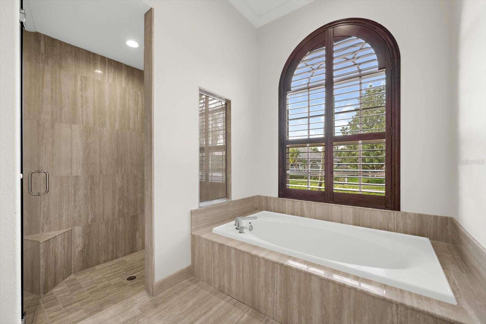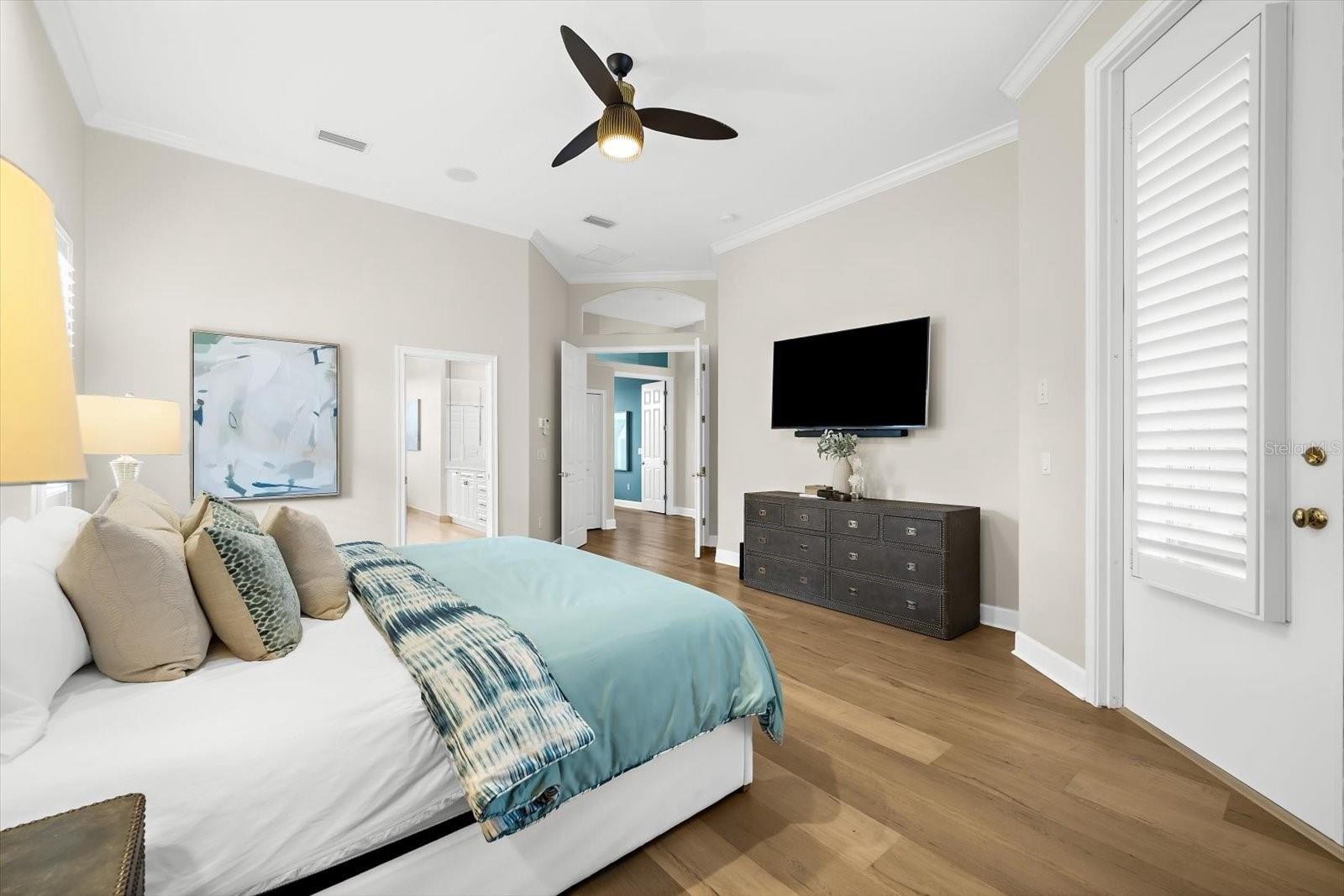 The main-floor primary suite features cathedral ceilings, dual walk-in closets, and access to the screened lanai and covered patio. The en-suite bath is designed for daily comfort. Four additional bedrooms provide flexible space for family, guests, or home offices, along with three full bathrooms.