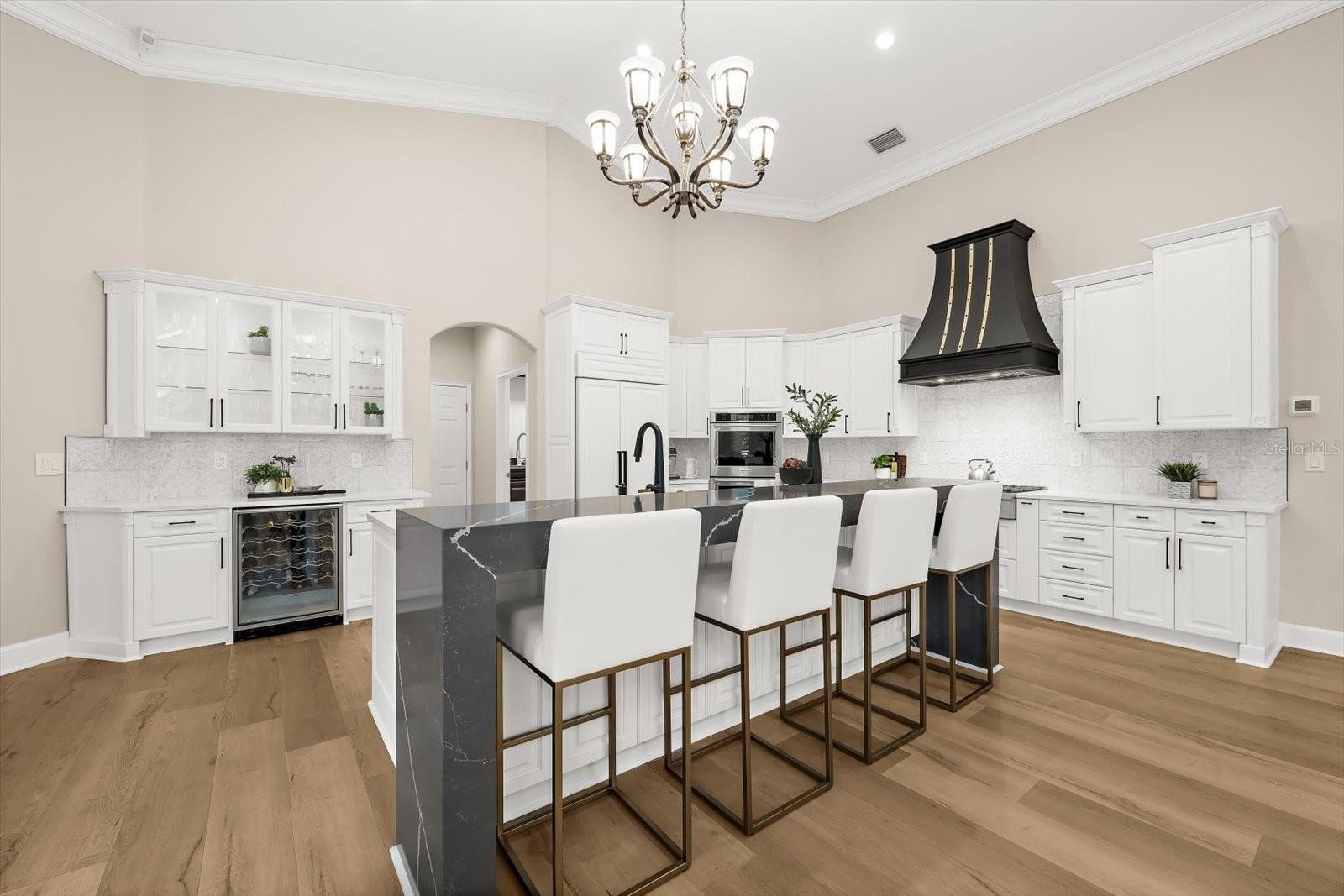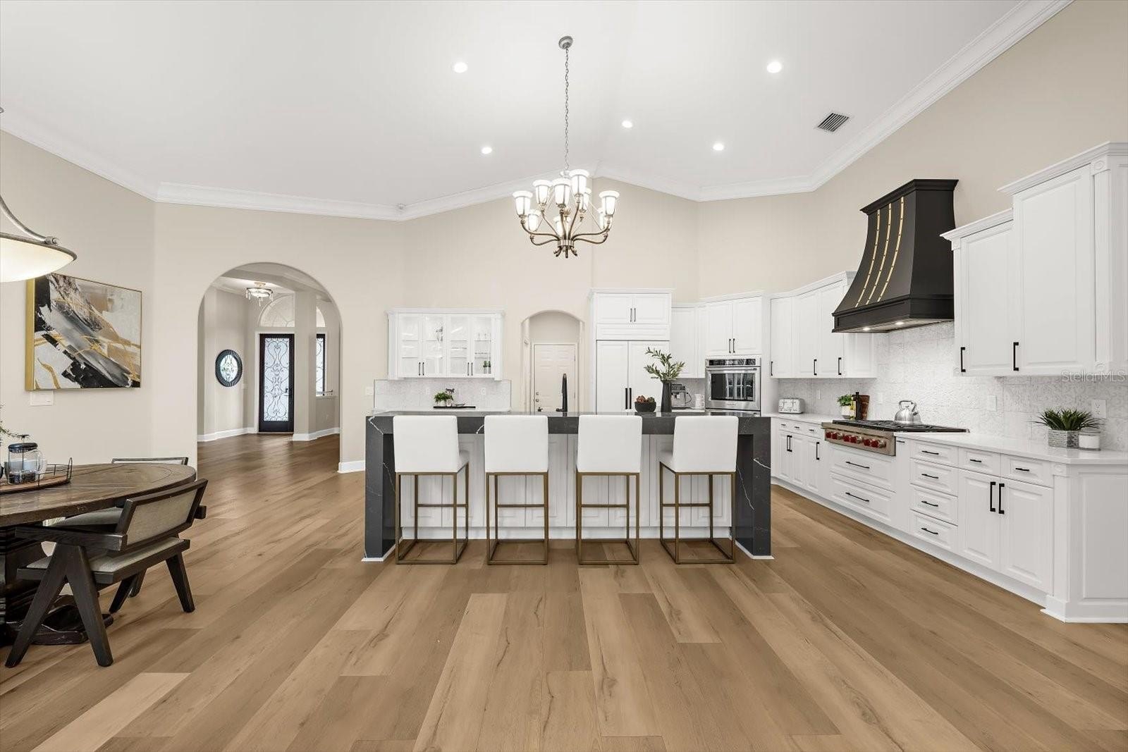 Step through the double entry doors into over 3,340 square feet of heated living space, where cathedral and vaulted ceilings, expansive windows, and an open floorplan create a light-filled environment. The interior combines seem less wood look luxury vinyl plank flooring throughout. Architectural millwork, including crown molding, archways, and trim, reinforces the home’s craftsmanship.