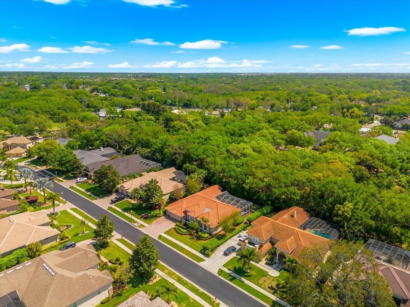 The north-facing façade showcases a tile roof, block construction, and maintained tropical landscaping. Mature greenery and manicured lawns frame the home’s Mediterranean silhouette, creating a welcoming arrival while maintaining privacy. Underground utilities keep the streetscape unobstructed, and the three-car attached garage provides space for vehicles and storage.