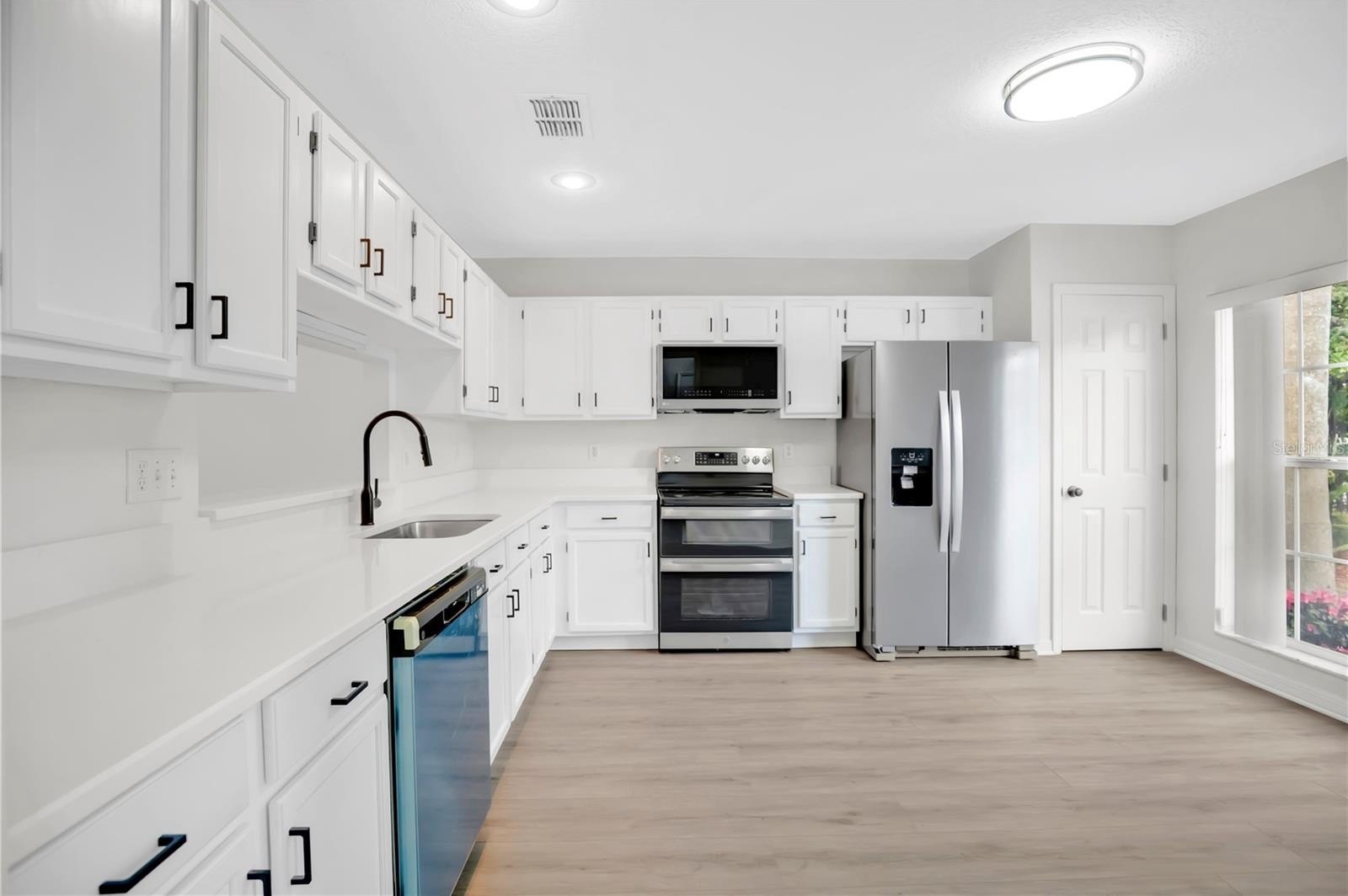 The spacious kitchen is the heart of the home, featuring sleek stainless steel appliances, ample counter space, and plenty of cabinetry — perfect for everyday living and entertaining alike. The open layout flows comfortably into the main living areas, creating a bright and inviting atmosphere.