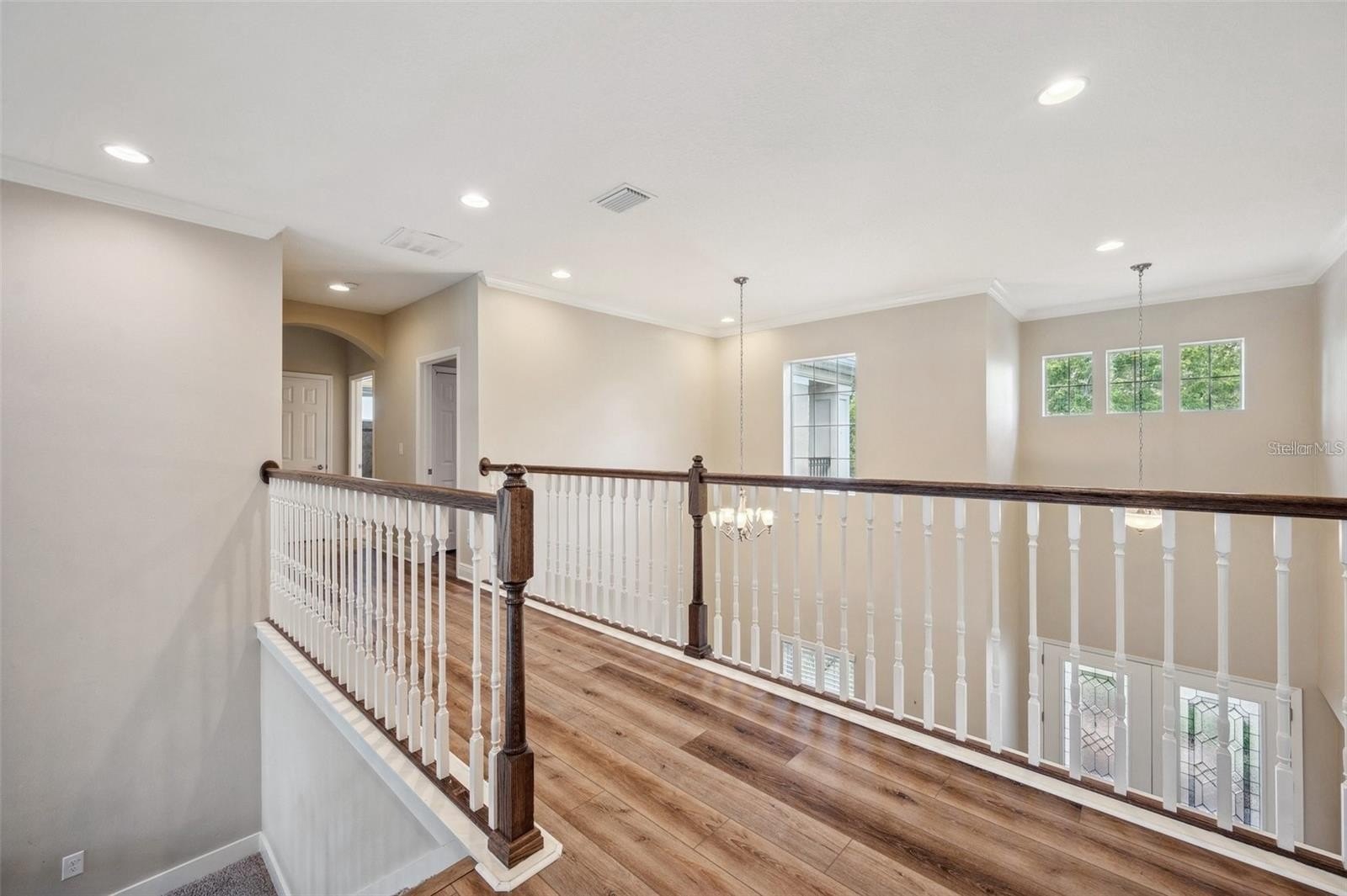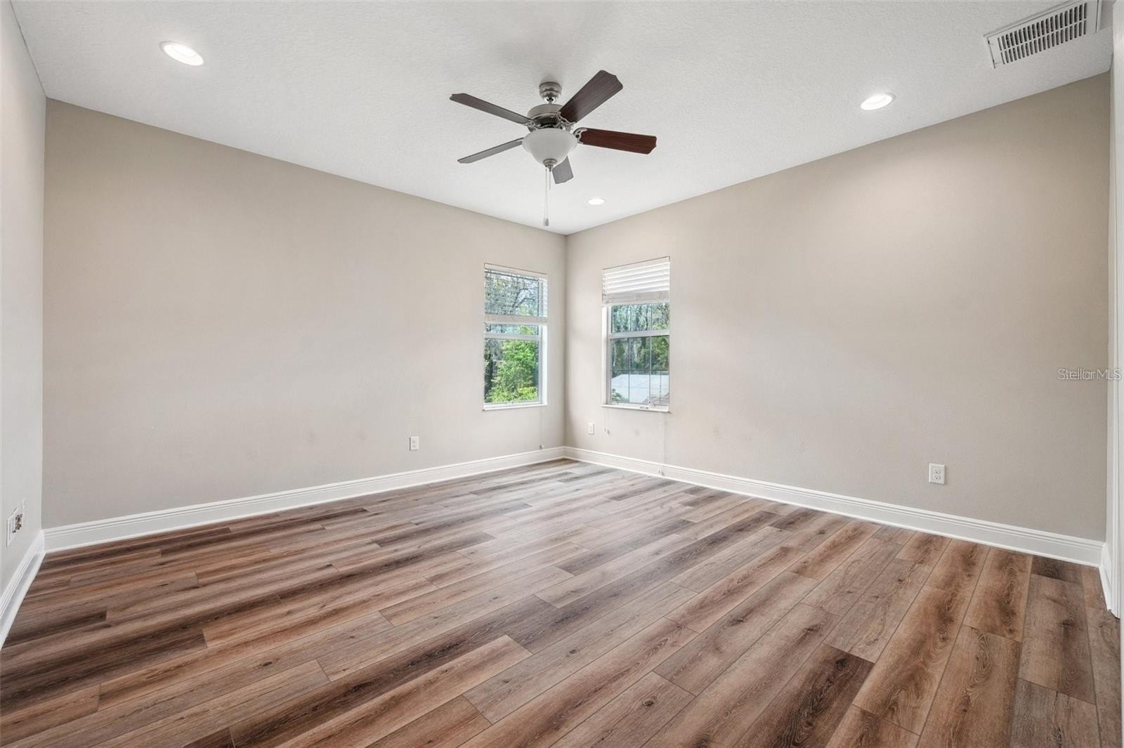 Upgrades galore in this GORGEOUS Westbay pool home situated on 1/4 acre CONSERVATION and CORNER lot with no back, front, or left side neighbors, on a tree-lined street in the desirable community of Starling at Fishhawk with LOW HOA! This 4,329 SF, 3-car garage gem has 2 primary suites and 3 additional bedrooms - 5 bedroom and 4 1/2 bath home. Through the double front doors you will immediately fall in love with the upgraded floors and the MASSIVE amount of SPACE and OPEN FLOOR PLAN. Downstairs you will find a formal dining room, over-sized family room, two primary bedrooms with en-suite bathrooms, kitchen, laundry room and a half guest bathroom. The formal dining room is large enough to fit all your dining room furniture or your billiard table. The kitchen and family room are enormous and will accommodate your guests for holidays and parties. The family room has a soaring two-story high ceiling, beautiful accent wall, 6 sliding doors that face the pool and open into the wall to add outdoor space to your family room, upgraded power blinds that cover the six sliding doors and crown molding. The eat-in kitchen is truly a chef’s dream with an abundance of upgraded 42” raised panel cabinets, granite countertops, a gas stove top, upgraded stainless steel appliances, recessed and pendant lighting, an island that seats 7 counter-high barstools, a walk-in pantry, a built-in desk, and a breakfast nook that faces the pool. The two primary suites are found on the first floor and both have beautiful, upgraded vinyl plank flooring, tray ceilings, ceiling fans, walk-in master closets, en-suite bathrooms with dual sinks, separate shower and a jetted tub. Suite one has added features with built-in cabinetry in the walk-in closet, and over-sized cabinets, countertops and mirror in the bathroom. Suite two has a door that leads to the pool area. The laundry room comes with a full-size upgraded Whirlpool washer and dryer, a window, a sink, and plenty of cabinets and countertops. Up the beautifully designed and spindled stairway you will find brand new vinyl plank flooring throughout, 3 additional bedrooms, two full bathrooms, and a media room. Bedrooms three, four and five all have ceiling fans and recessed lighting. Bedroom 5 is soundproof and could be for the musician in your family. The bathrooms both have dual sinks and a shower/tub combination. The media room does have a closet so could be used as a sixth bedroom, playroom, very large office or extra family room. It has two doors that lead to a private balcony. This home has an abundance of storage space, including under the stairs storage. Step out back to cool down in the pool and enjoy the conservation view. The pool is surrounded by a large pavered and screened in lanai big enough for all your furniture, pool toys and your grill. The backyard is fully screened in for your pets and little ones. The 3-car garage is equipped with two hanging storage racks for extra storage space. This home comes with some amazing upgrades and on the top of the list is an almost new full house 20k generator. Other upgrades include a whole house vacuum system, alarm system, Culligan filtered water system, tankless water heater, intercom system, and a ring doorbell. FishHawk Ranch is a desired community with A-rated schools, so many amenities including an Aquatic Club, Starling Club, many pools & clubhouses, restaurants, daycares, walking trails, and sports complex. Schedule a tour today to make this your next home!