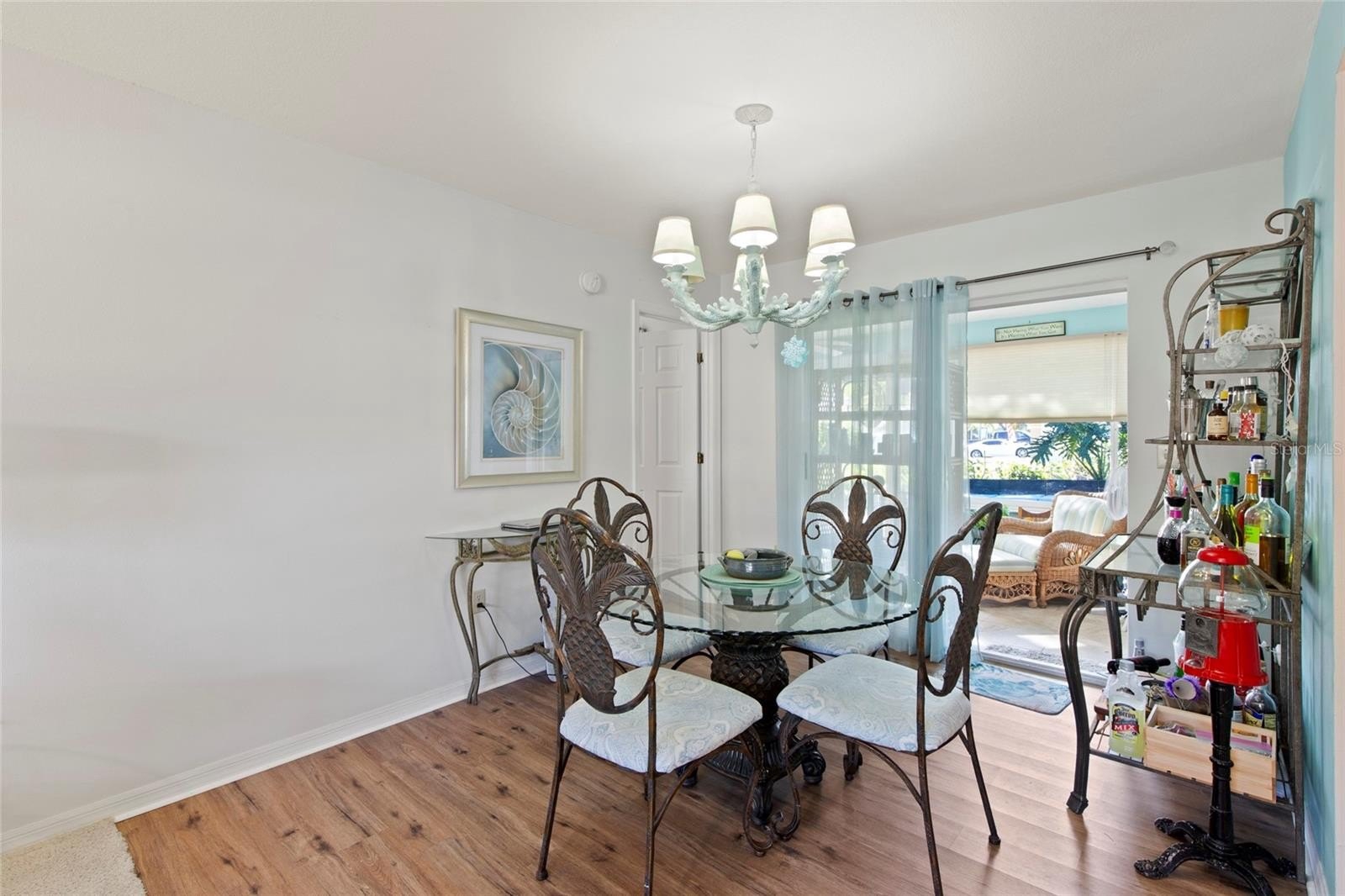 Inside, natural light fills the home through large windows, with some upgrades to hurricane impact. Flooring includes luxury vinyl plank throughout most areas, tile in the kitchen, bathrooms, and Florida room, and carpet in the living room. The family room features vaulted ceilings and a wood-burning fireplace, creating a comfortable gathering space.