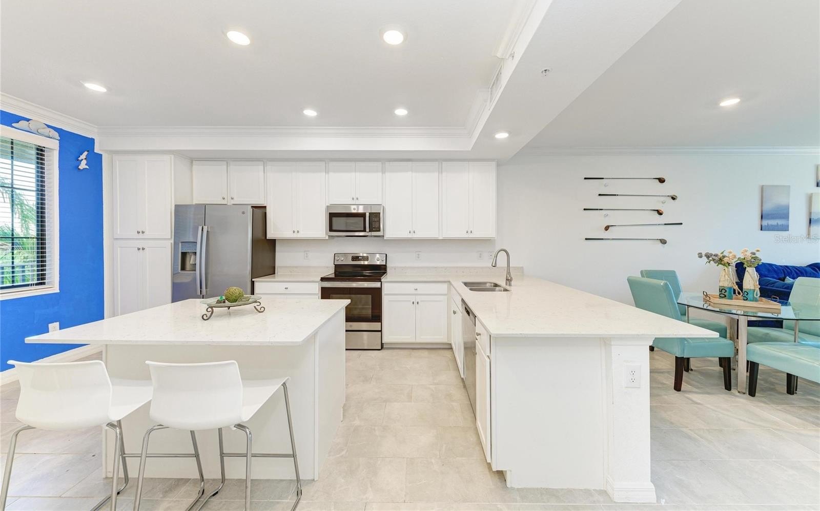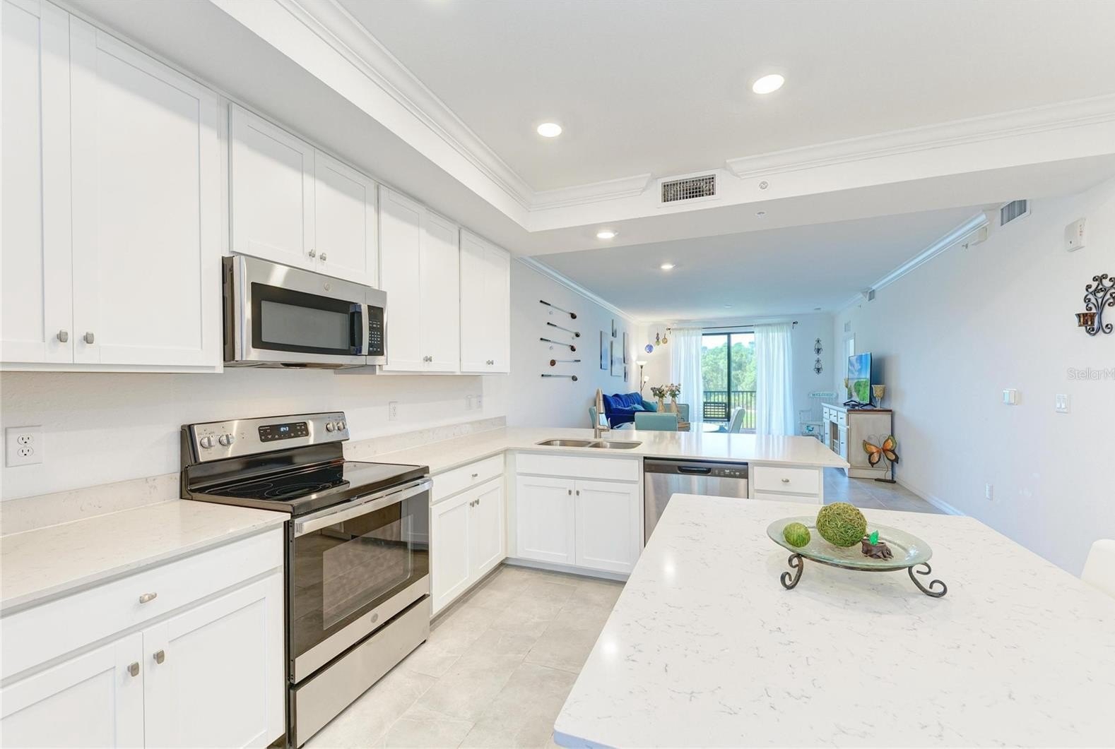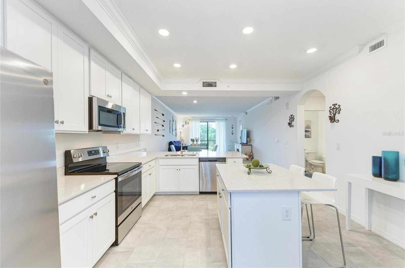 Welcome to this beautifully appointed second-floor 2-bedroom, 2-bath condo in the highly sought-after Lakewood National community of Lakewood Ranch, FL. Built in 2022 and offered turnkey furnished, this residence is truly move-in ready—perfect as a full-time home, seasonal retreat, or investment opportunity. Step inside to a thoughtfully designed open-concept floor plan that blends comfort and modern elegance. The kitchen is both stylish and functional, featuring sleek cabinetry, granite countertops, stainless steel appliances, and a spacious island with bar seating—perfect for casual dining or entertaining guests. The kitchen flows seamlessly into the dining and living areas, where natural light pours in through sliding glass doors, creating a bright and inviting atmosphere. The living room is tastefully furnished with a clean, contemporary feel, offering a relaxing space to unwind while enjoying uninterrupted views of the pond and golf course beyond. The primary suite is a peaceful retreat, complete with a large window that captures the scenic surroundings, two walk-in closets, and an en-suite bath featuring dual sinks and a walk-in shower. The second bedroom is equally inviting, ideal for guests or a home office, with easy access to the second full bathroom. Additional features include in-unit laundry, modern finishes throughout, and neutral tones that complement any décor style. Step out onto the private screened patio to take in the stunning water and golf course views—your own serene escape where you can relax and enjoy Florida’s natural beauty year-round. This home offers not only stunning views but also access to an unparalleled resort-style lifestyle. Lakewood National features two championship Arnold Palmer-designed golf courses, a grand clubhouse, state-of-the-art fitness center, full-service spa, tennis and pickleball courts, resort-style pools with lap lanes, poolside dining, and a vibrant social calendar filled with events and activities. Residents enjoy a maintenance-free lifestyle, allowing more time to relax, connect, and enjoy the surroundings. Whether you’re an avid golfer, a fitness enthusiast, or simply someone who appreciates serene views and an active, social community, this condo offers the perfect blend of luxury, convenience, and Florida living at its finest.