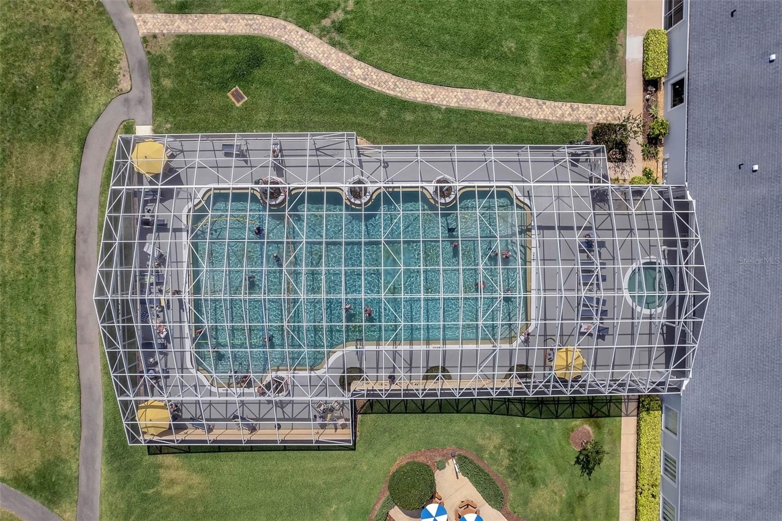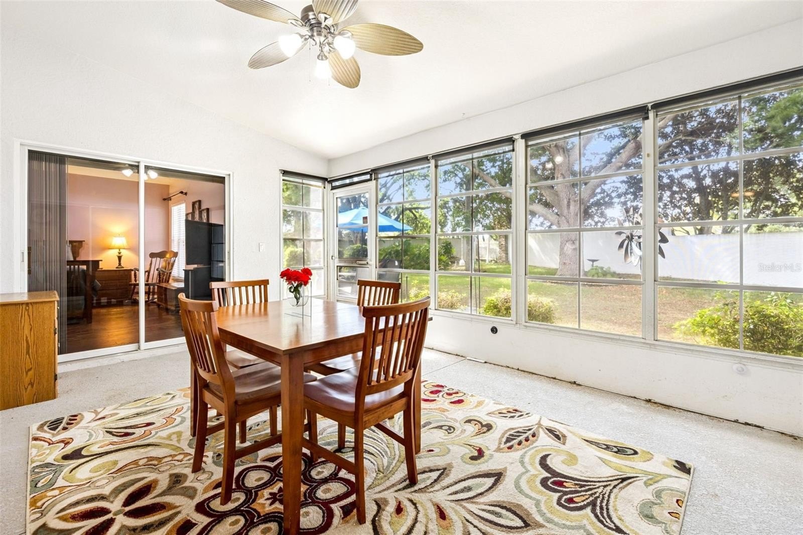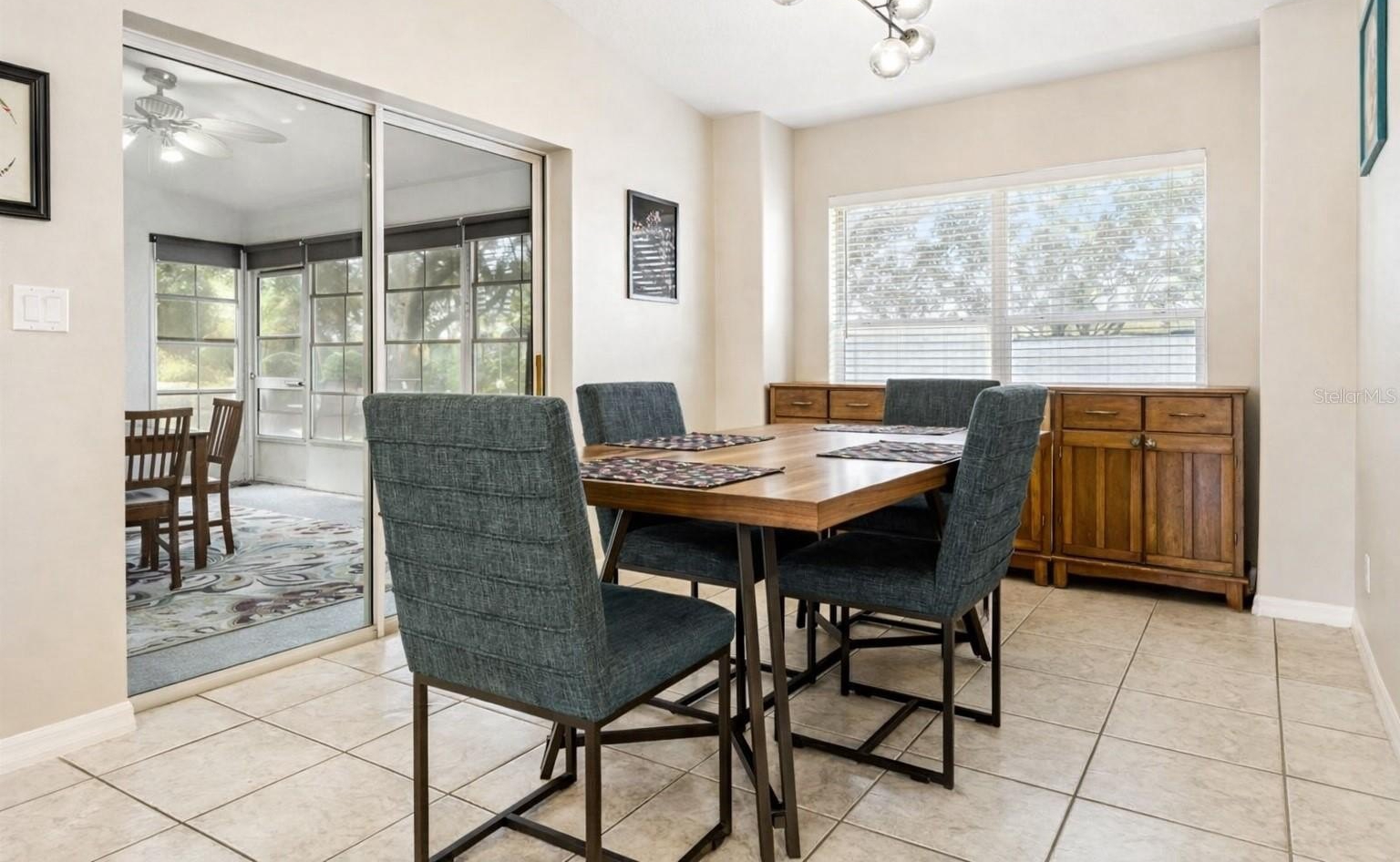 Inside, you’ll find an open living space with high ceilings and great natural light. The kitchen flows right into the main living and dining areas, with bar seating and plenty of room to spread out. Sliding glass doors open all the way to the enclosed lanai, making indoor-outdoor living feel seamless.