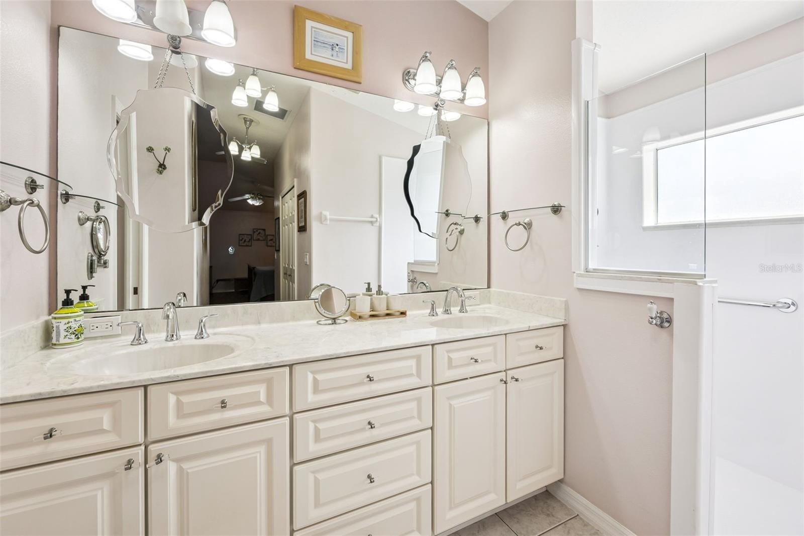 The primary suite is privately situated with direct access to the lanai and a spacious bathroom with dual sinks and separate toilet room.