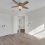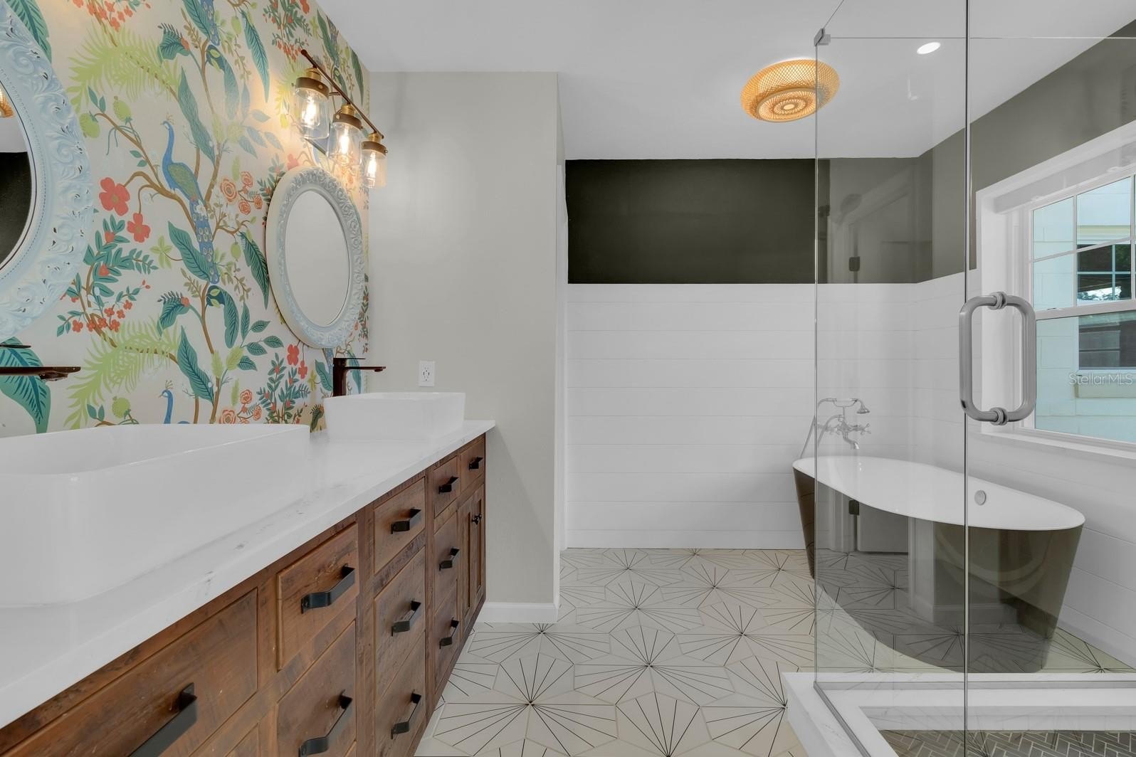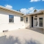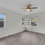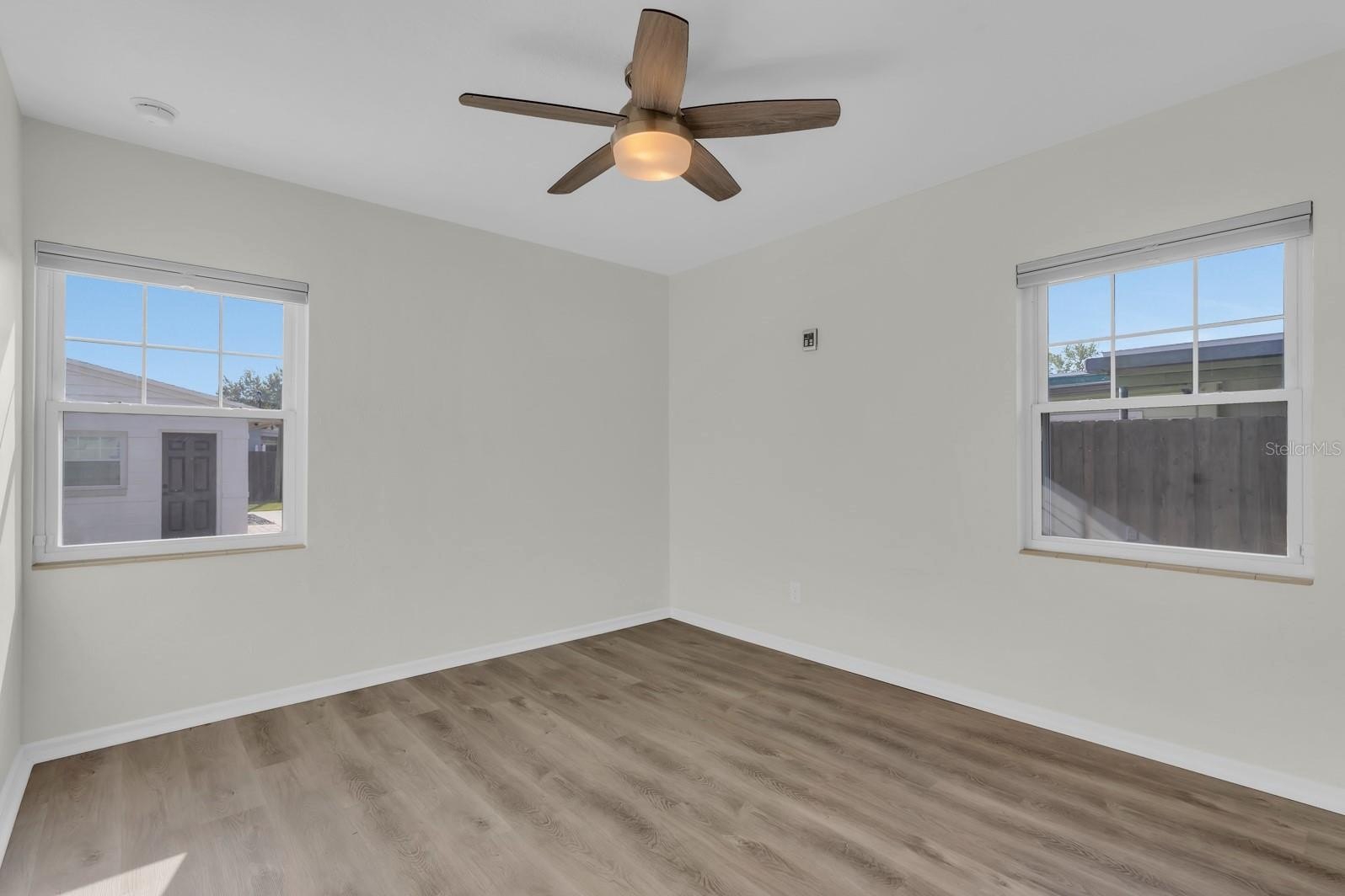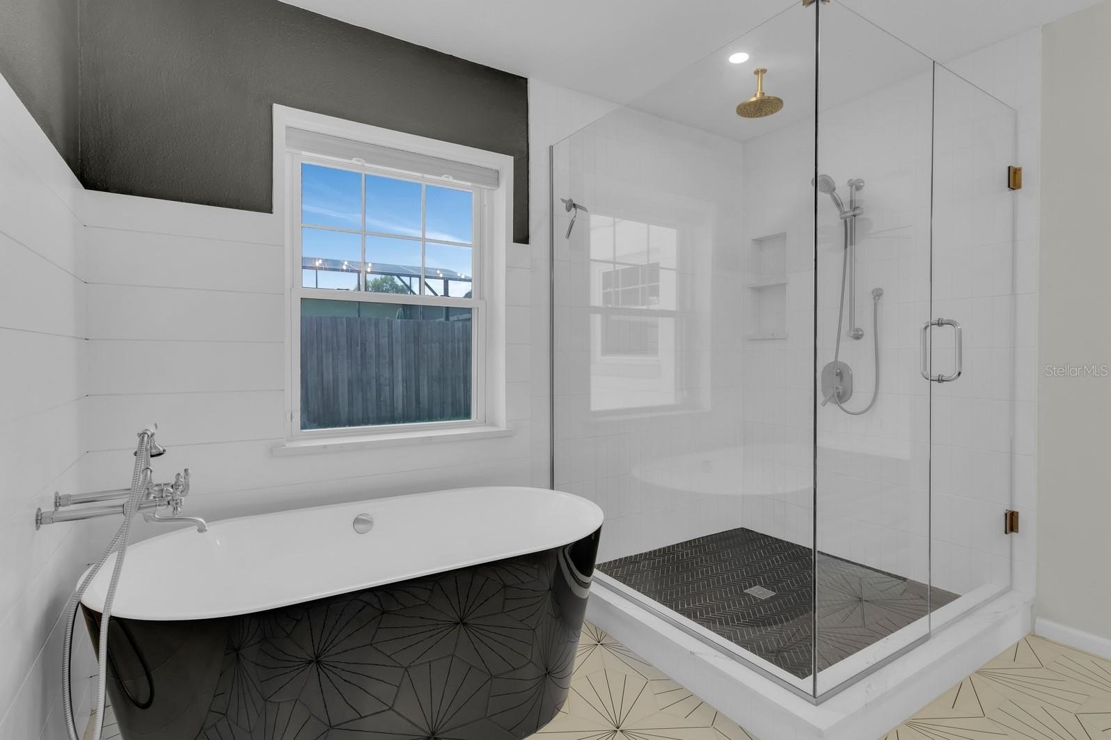 The split floor plan separates three generous bedrooms, each outfitted with ceiling fans, from a private primary suite complete with a soaking tub, walk-in shower, dual vanities, his-and-her walk-in closets, and direct backyard access. The hall bathroom has been equally reimagined with a sleek walk-in shower, reflecting the elevated attention to detail found throughout the home.