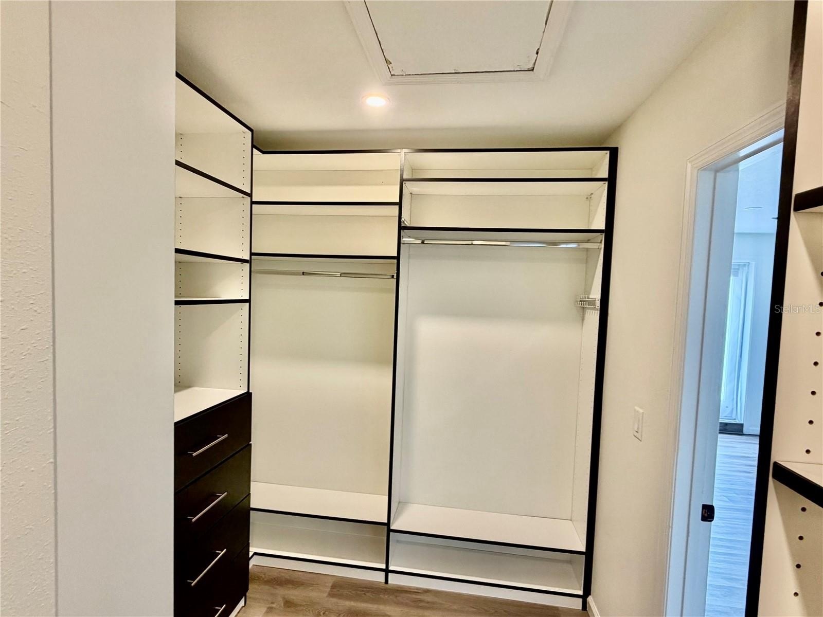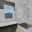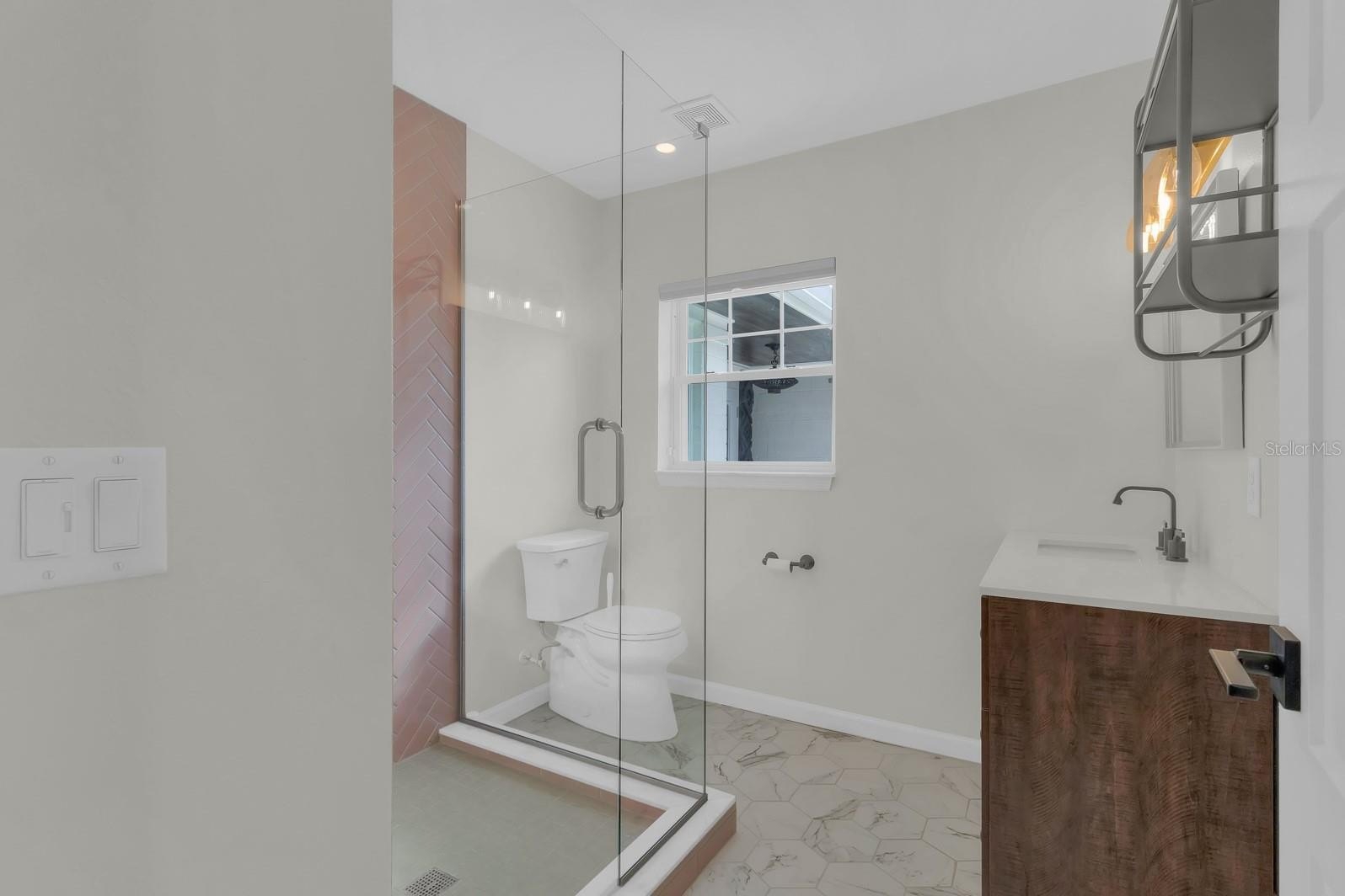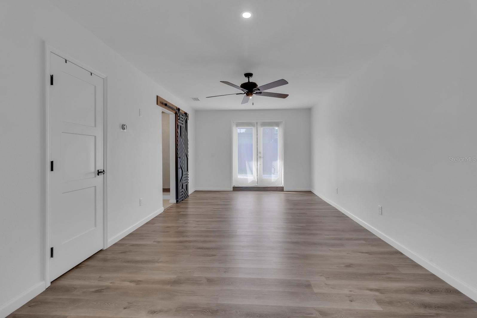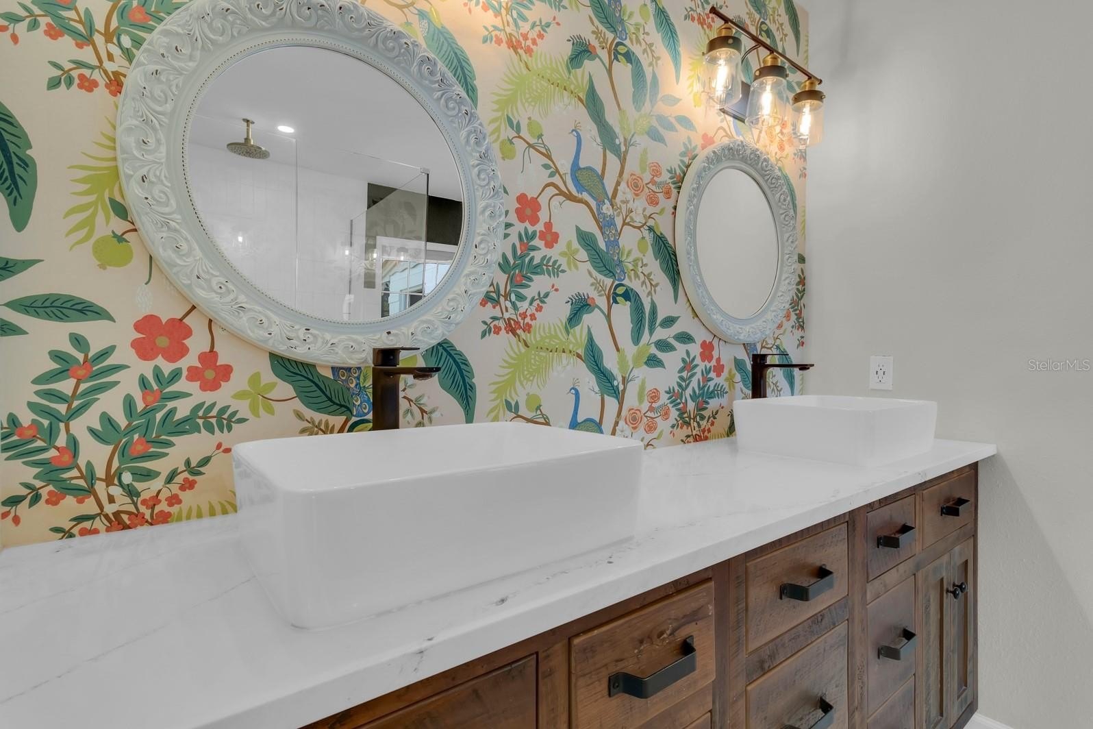 The split floor plan separates three generous bedrooms, each outfitted with ceiling fans, from a private primary suite complete with a soaking tub, walk-in shower, dual vanities, his-and-her walk-in closets, and direct backyard access. The hall bathroom has been equally reimagined with a sleek walk-in shower, reflecting the elevated attention to detail found throughout the home.