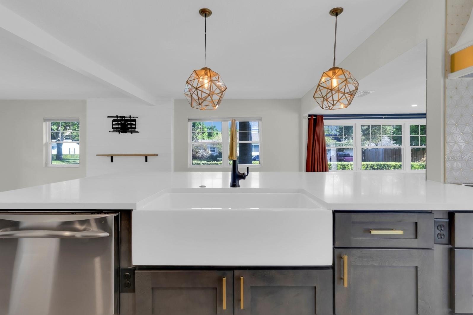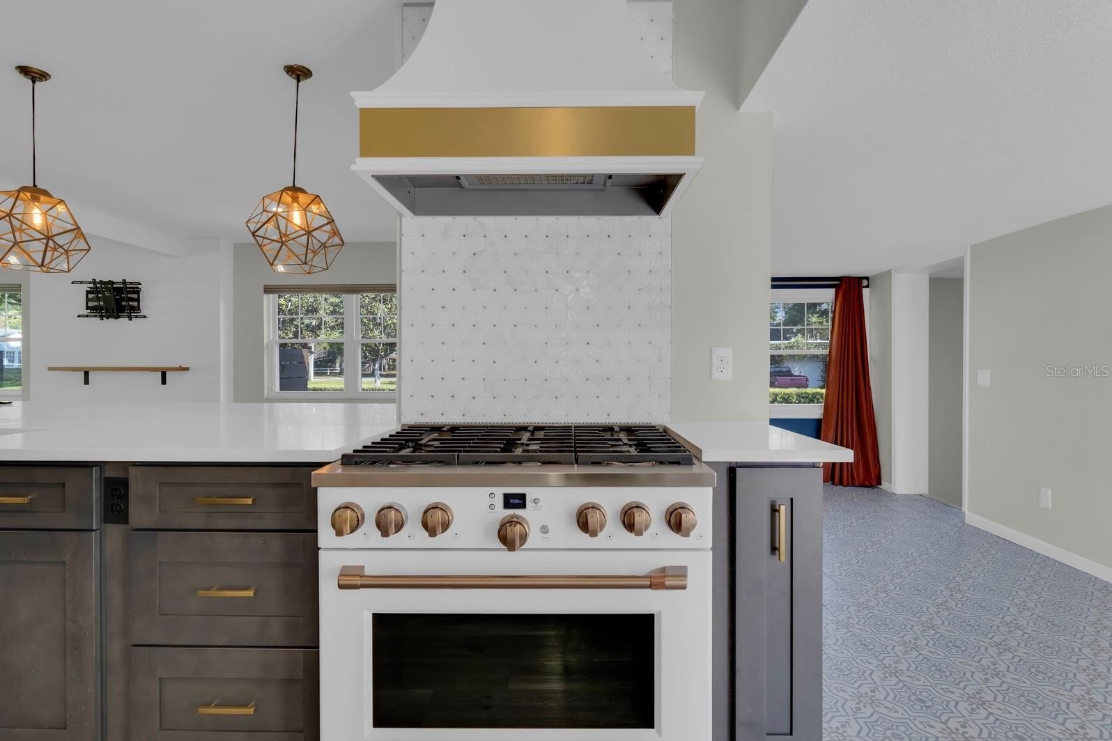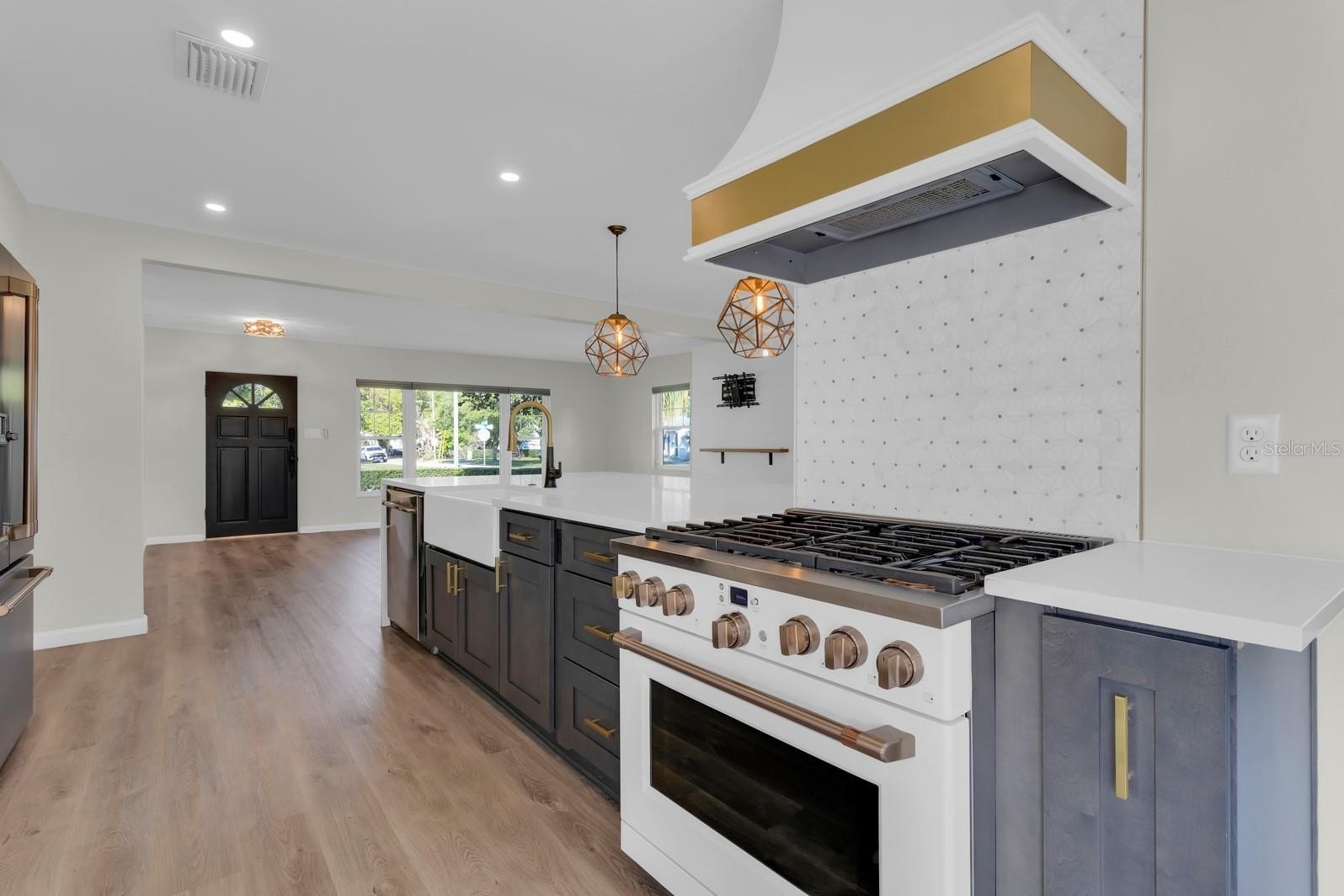 At the center of it all is a gourmet kitchen built for the discerning home chef. GE Café appliances anchor the space, including a restaurant-grade 6-burner stove, complemented by a waterfall countertop, custom golden pendant lighting, and a touchless faucet. A dedicated bar area with dual beverage coolers makes this layout ideal for entertaining at any scale.