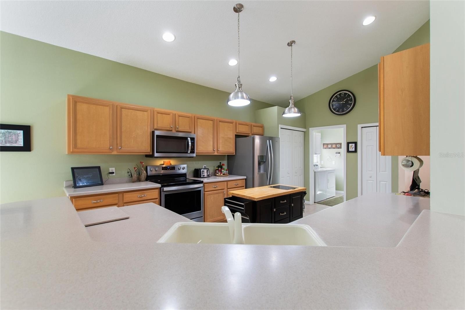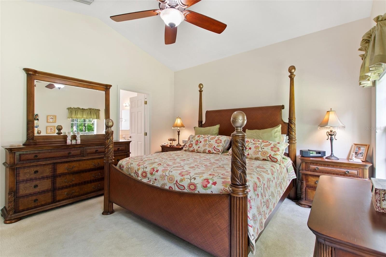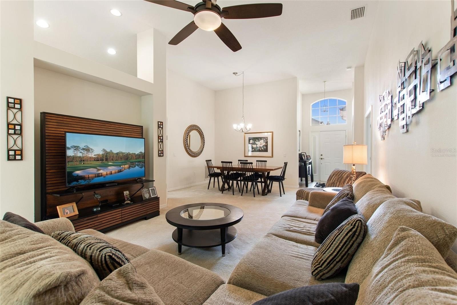 One or more photo(s) has been virtually staged. Mostly Furnished RidgeDale 2/2/Den model with Preferred Bay Window elevation and Extended North-Facing Screened Lanai overlooking a Premium Conservation Lot that backs to Horse Creek, located just 0.4 miles from the High Vista 55+ private clubhouse and outdoor amenity center. 12 FT ceiling in central Great Room with a wall of patio doors to brick paver Lanai & Patio. Eat-in Kitchen has Corian countertops, newer Stainless-Steel appliances, pendant and recessed lighting. Cathedral ceiling in Primary En Suite Bedroom with walk-in and linen closets. Split bedroom design offers a private guest area with adjacent full bath and linen closet in front of house. Den is nestled between bedrooms. Corridor Laundry room to Garage has utility sink and cupboards over washer/dryer. Newer hot water heater, HVAC, ceiling fans, blinds, smoke detectors. Sold As-Is. Ridgewood Lakes is a golf cart friendly community. $230 monthly High Vista HOA fee includes Spectrum internet and basic cable TV with 2 cable boxes, lawn mowing and exclusive access to resident-owned 12,000 SF private High Vista clubhouse and amenities. $425 semi-annual Ridgewood Lakes HOA fee provides 24x7 staffed security gate and master association-owned private road maintenance. Adjacent to 18-hole White Heron Golf Club with The Nest restaurant, privately owned and open to the public. High Vista is a 55+ community with outdoor heated pool and spa, fitness center, library, pub & many organized activities. Pickle ball, tennis, bocce and shuffleboard courts. Miles of biking and walking trails within Ridgewood Lakes gated community. Shopping, Disney, Universal, Orlando & Central FL entertainment nearby, easy access to I-4, medical facilities, airports & Sunrail Station. Advent Health hospital is 3 miles away.