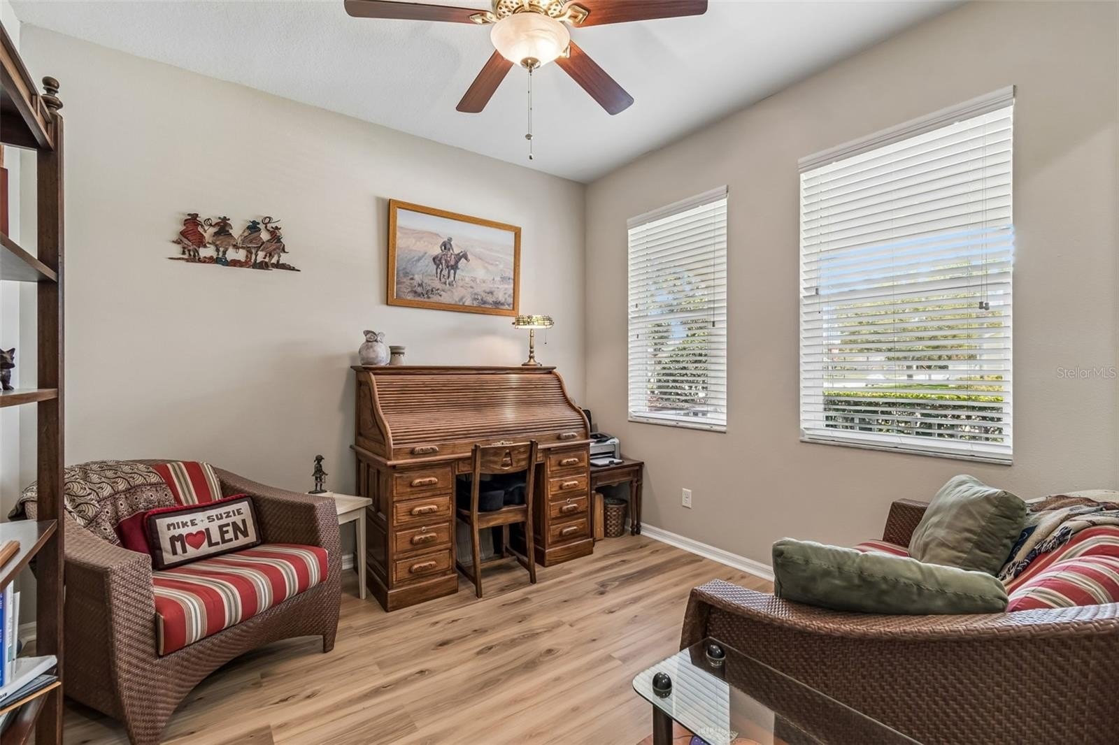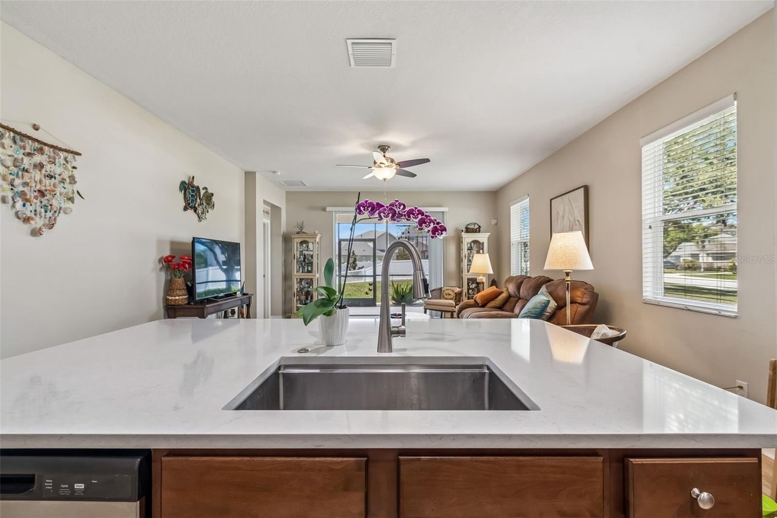 Step inside to discover a bright, open floor plan designed for both comfort and versatility. A flexible front space offers the perfect option for a home office, formal dining room, or bonus area tailored to your lifestyle. The spacious family room flows seamlessly into the heart of the home—the stunning kitchen—featuring updated solid surface countertops, a breakfast bar island ideal for casual dining, a full stainless steel appliance package and an abundance of cabinetry.