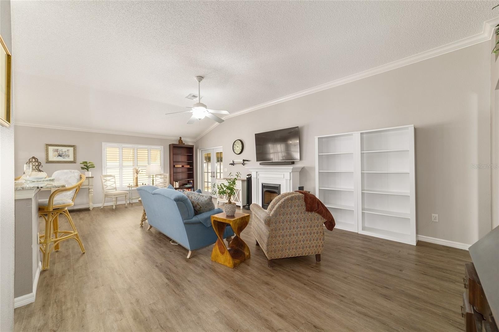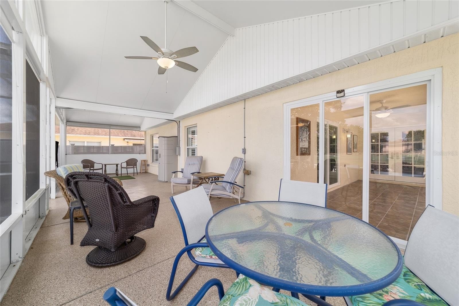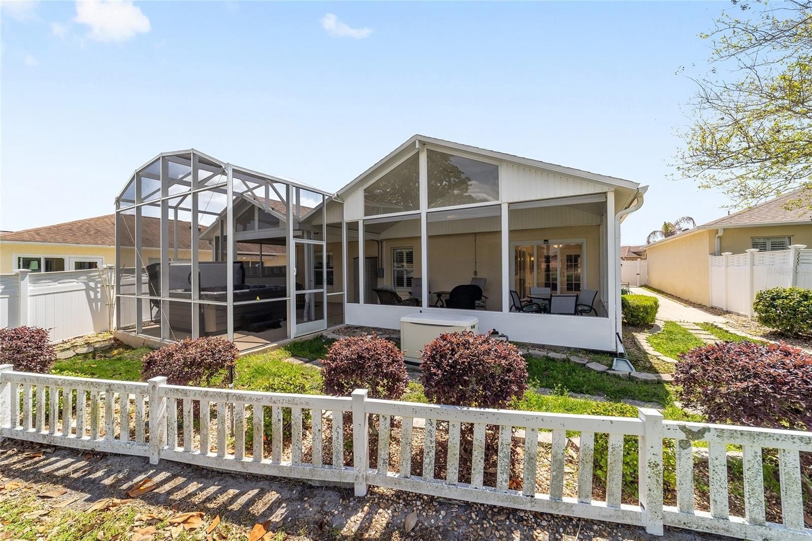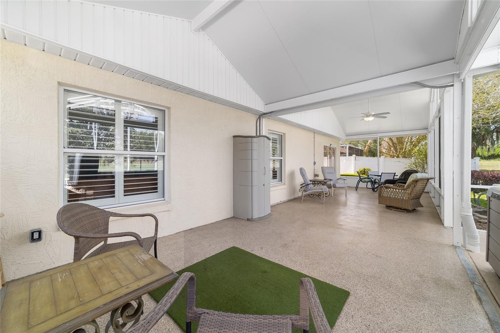 TURNKEY AND BOND IS PAID! This lovely block and stucco Grantham courtyard villa is located in Belmont Villas in The Village of Belvedere. It is a 3/2 with a climate controlled enclosed lanai and a large screened lanai with a roof on the golf course with a Premier Care Walk-In Jacuzzi Tub (AS-IS). The flooring is all luxury vinyl plank. As you enter the home you will notice the vaulted ceilings with crown molding and an open floor plan. This home is being sold Turnkey to include all furniture and furnishings in the home with the exception of items with a green sticker and some staging items. This home also has plantation shutters, a fireplace in the living room and granite in the kitchen and both bathrooms. The kitchen has stainless steel appliances, a tiled backsplash, white cabinets with pull outs and a gas range. There is also a granite breakfast bar to enjoy your morning coffee. The dining room has a lovely table with 6 chairs and matching sideboard. The primary bedroom has a queen sized bed with a dresser and chest. There is also a walk-in closet and a large bathroom with granite counters and tiled step-in shower. The guest bedroom has a full bed with a dresser, 2 nightstands and a TV mounted on the wall. The third bedroom could be used as an office, there are storage cabinets and a TV. Both guest rooms have built-in closets. The guest bathroom has granite counters and an upgraded shower. Both bathrooms have a bidet. There is a linen closet in the hallway. The laundry room has a newer washer and dryer and is located inside the home. Items in the garage do not convey, except for the Pelican Water Filtration System and the gas golf cart, included AS-IS! The garage has an epoxy flooring and has a remote controlled screen door. There is a 2019 GENERAC generator, 2020 Roof, 2018 HVAC and water heater is original. Taxes $3,884.32, Maint $261.78, Fire $320.71 and bond is paid!