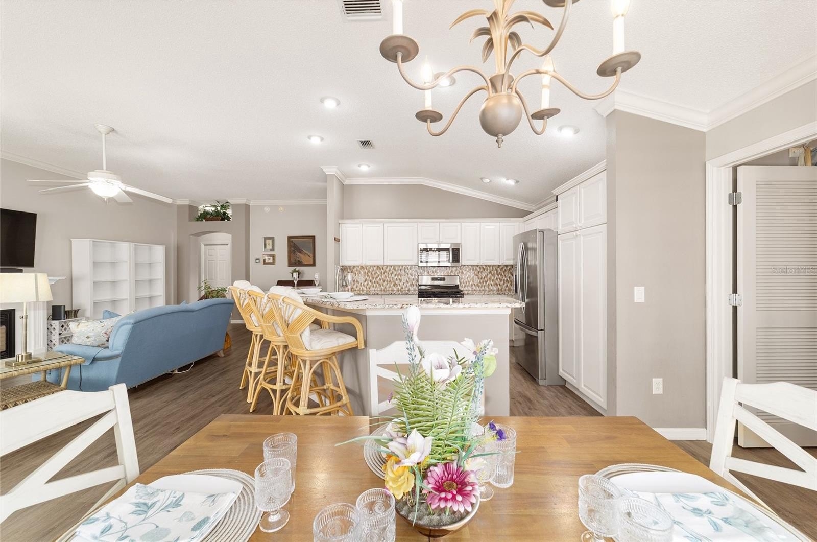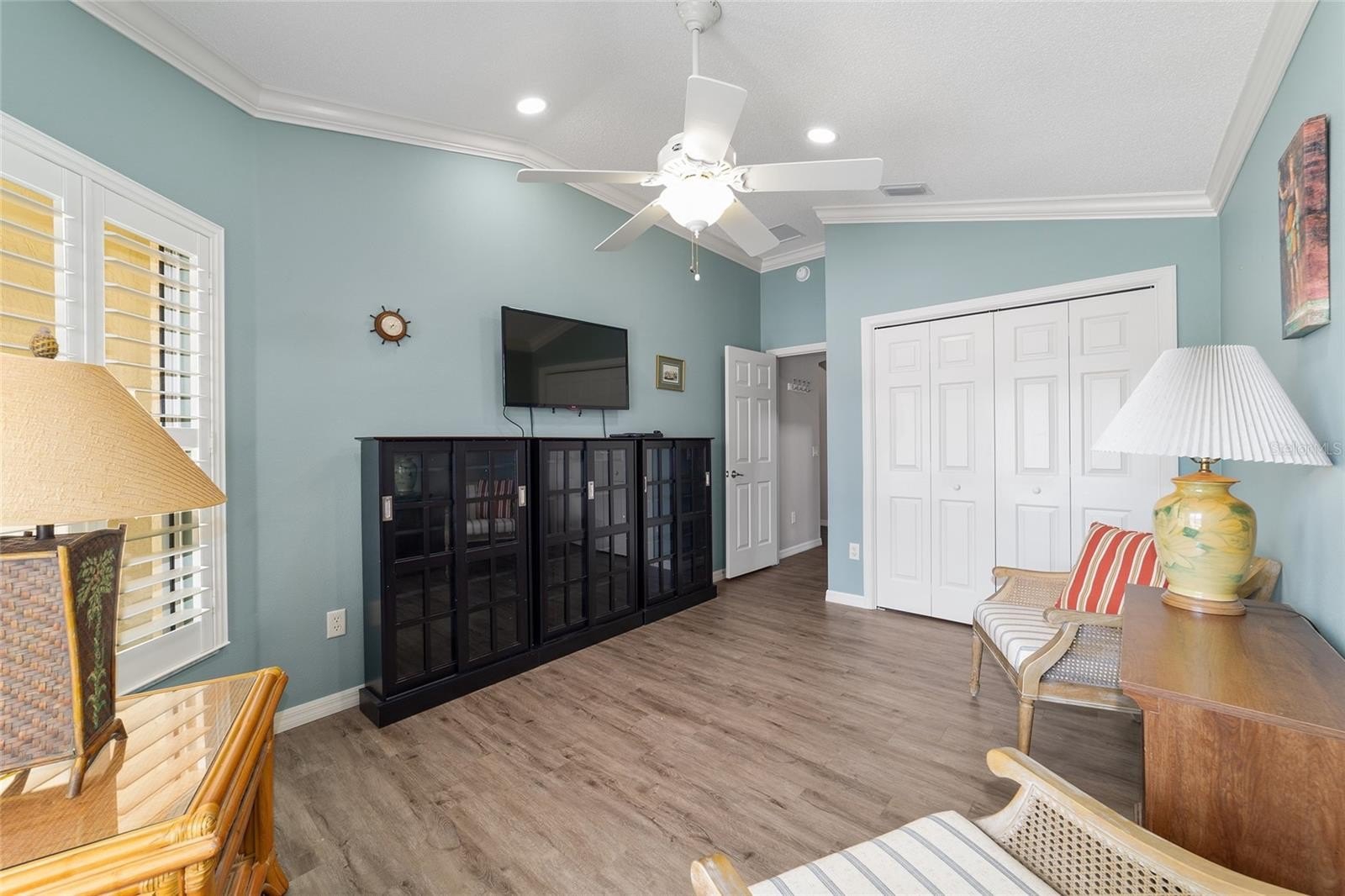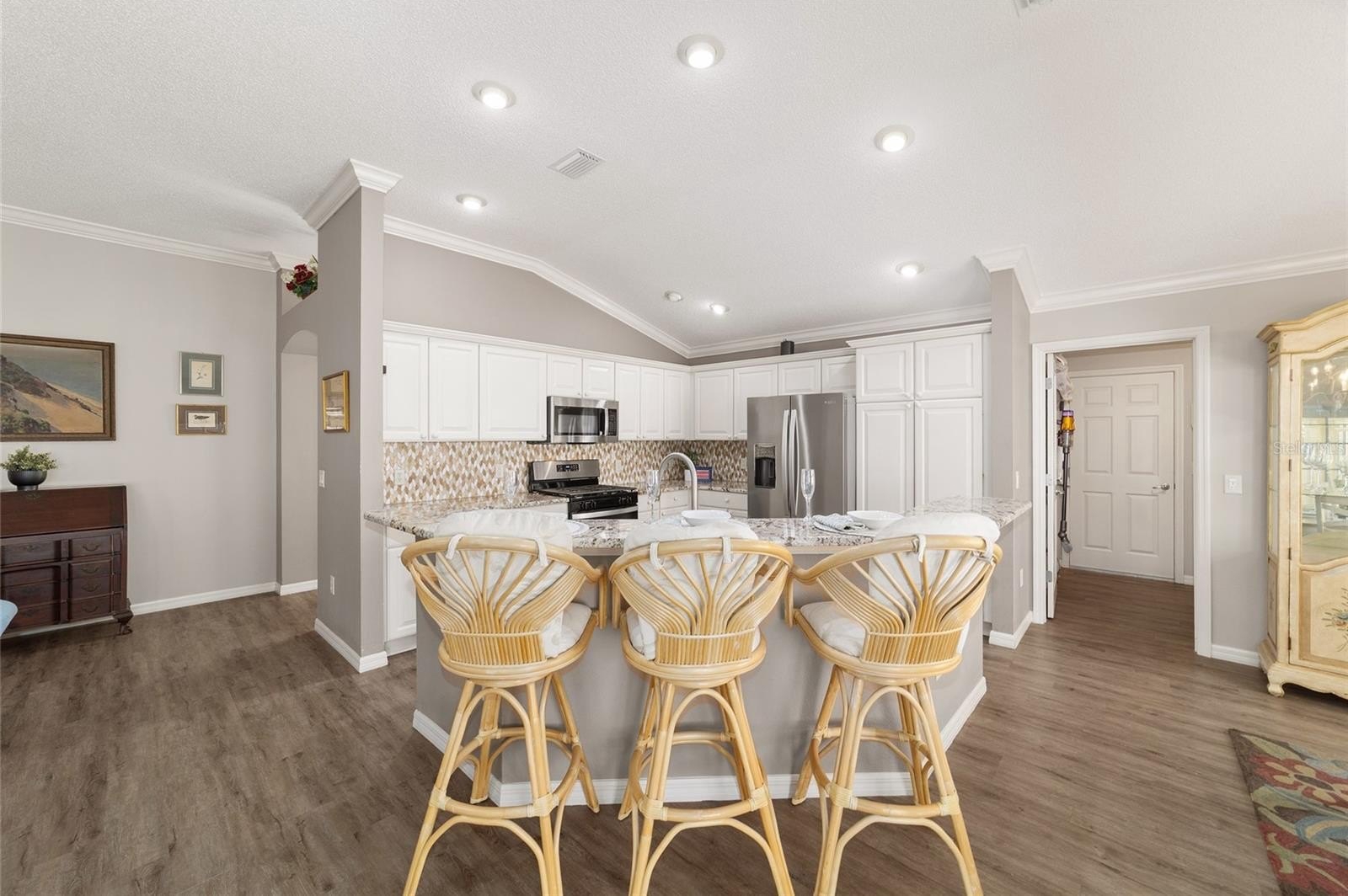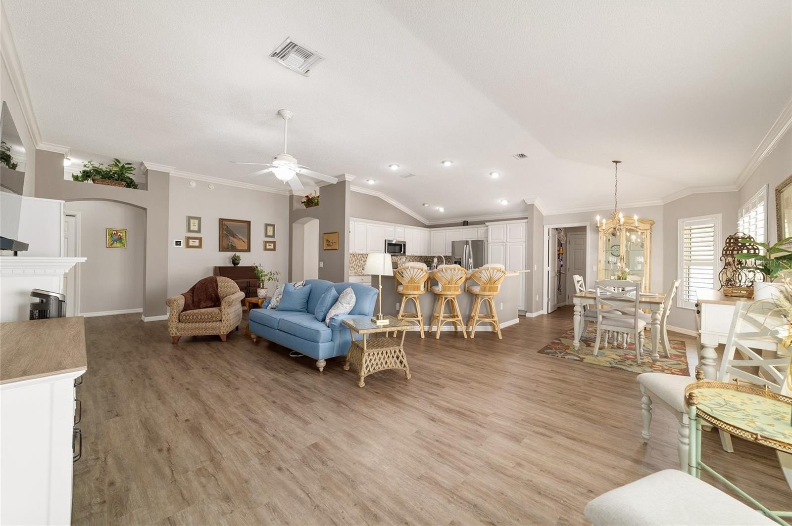 TURNKEY AND BOND IS PAID! This lovely block and stucco Grantham courtyard villa is located in Belmont Villas in The Village of Belvedere. It is a 3/2 with a climate controlled enclosed lanai and a large screened lanai with a roof on the golf course with a Premier Care Walk-In Jacuzzi Tub (AS-IS). The flooring is all luxury vinyl plank. As you enter the home you will notice the vaulted ceilings with crown molding and an open floor plan. This home is being sold Turnkey to include all furniture and furnishings in the home with the exception of items with a green sticker and some staging items. This home also has plantation shutters, a fireplace in the living room and granite in the kitchen and both bathrooms. The kitchen has stainless steel appliances, a tiled backsplash, white cabinets with pull outs and a gas range. There is also a granite breakfast bar to enjoy your morning coffee. The dining room has a lovely table with 6 chairs and matching sideboard. The primary bedroom has a queen sized bed with a dresser and chest. There is also a walk-in closet and a large bathroom with granite counters and tiled step-in shower. The guest bedroom has a full bed with a dresser, 2 nightstands and a TV mounted on the wall. The third bedroom could be used as an office, there are storage cabinets and a TV. Both guest rooms have built-in closets. The guest bathroom has granite counters and an upgraded shower. Both bathrooms have a bidet. There is a linen closet in the hallway. The laundry room has a newer washer and dryer and is located inside the home. Items in the garage do not convey, except for the Pelican Water Filtration System and the gas golf cart, included AS-IS! The garage has an epoxy flooring and has a remote controlled screen door. There is a 2019 GENERAC generator, 2020 Roof, 2018 HVAC and water heater is original. Taxes $3,884.32, Maint $261.78, Fire $320.71 and bond is paid!
