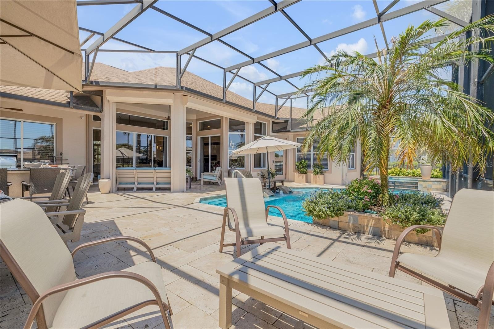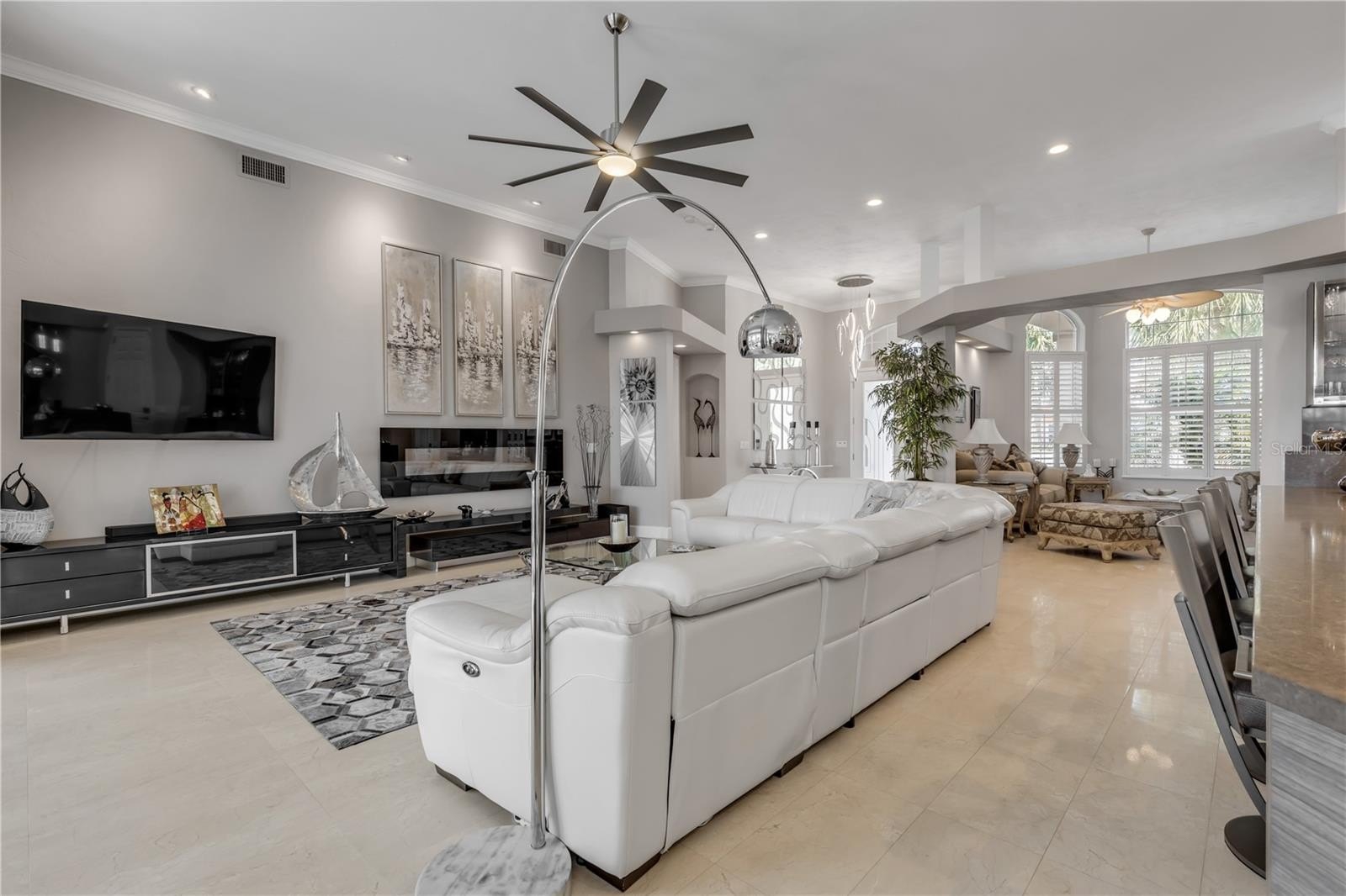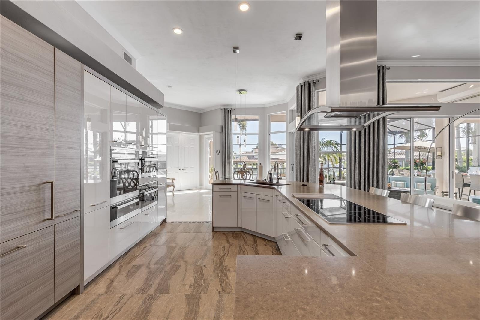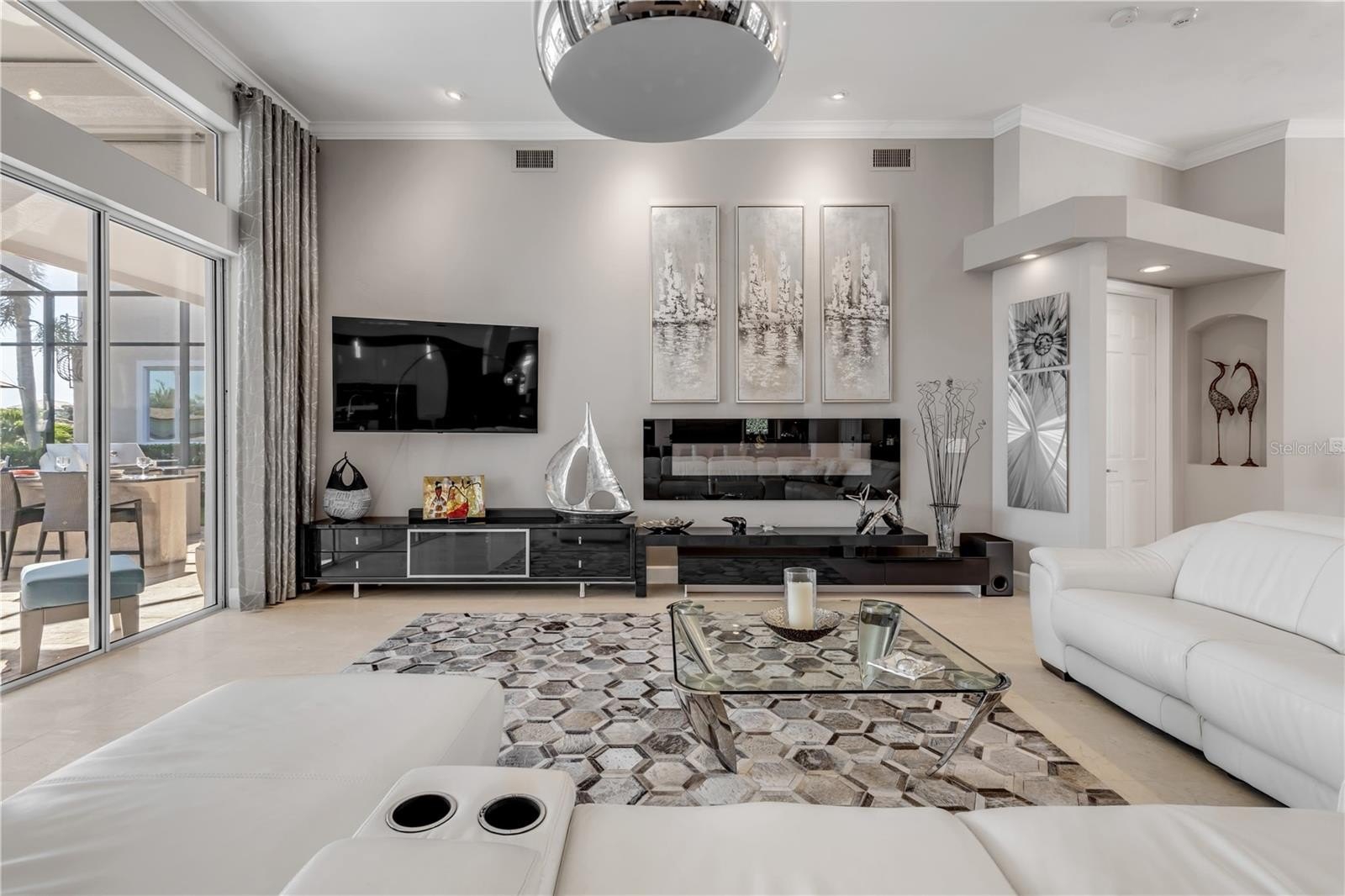 From the moment you arrive, the sense of scale is undeniable. Twin glass entry doors open to soaring 12-foot ceilings, custom tile inlays, and curated designer lighting — establishing an immediate tone of elegance and craftsmanship. The expansive great room is bathed in natural light through dramatic floor-to-ceiling windows, framing serene views of the private pool and waterfront beyond. An 80-inch recessed Modern Flames fireplace anchors the space, enhanced by integrated LED and precision downlighting. The open-concept layout transitions effortlessly into the gourmet kitchen and outdoor living areas — ideal for entertaining on any scale. German-Engineered Culinary Design - The chef’s kitchen is a masterclass in modern European craftsmanship, featuring: Custom SieMatic cabinetry in high-gloss and wood-grain finishes; Premium Miele appliances including steam, speed, and multifunction ovens; Concealed refrigerator/freezer; Induction cooktop and wine storage; Quartz waterfall island with breakfast seating; Granite sink and statement LED pendant lighting. This is not simply a kitchen — it is a culinary gallery. Private Owner’s Retreat - The primary suite offers lanai access and tranquil water views, accompanied by dual walk-in closets and a vaulted dressing or fitness space. The spa-inspired bath showcases frameless glass showers, rain heads, LED mirrors, and designer finishes — delivering a true resort experience at home. Guest accommodations reflect equal attention to detail, with fully tiled baths, sleek vanities, and contemporary glass accents. Resort-Style Outdoor Living - Step onto a travertine lanai designed for year-round enjoyment. The heated pool and spa feature: Sundeck and waterfall elements; Bubbler jet features;