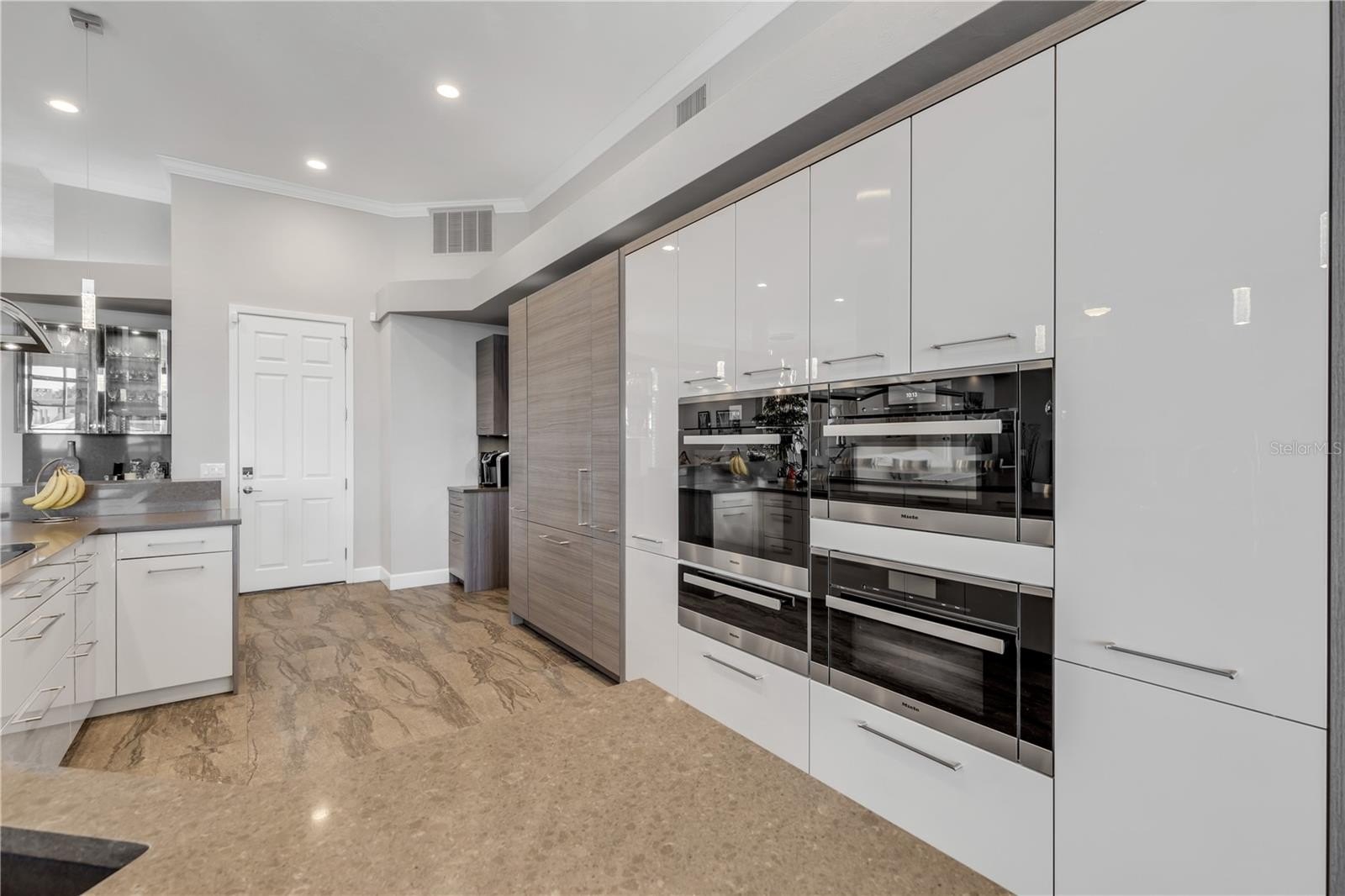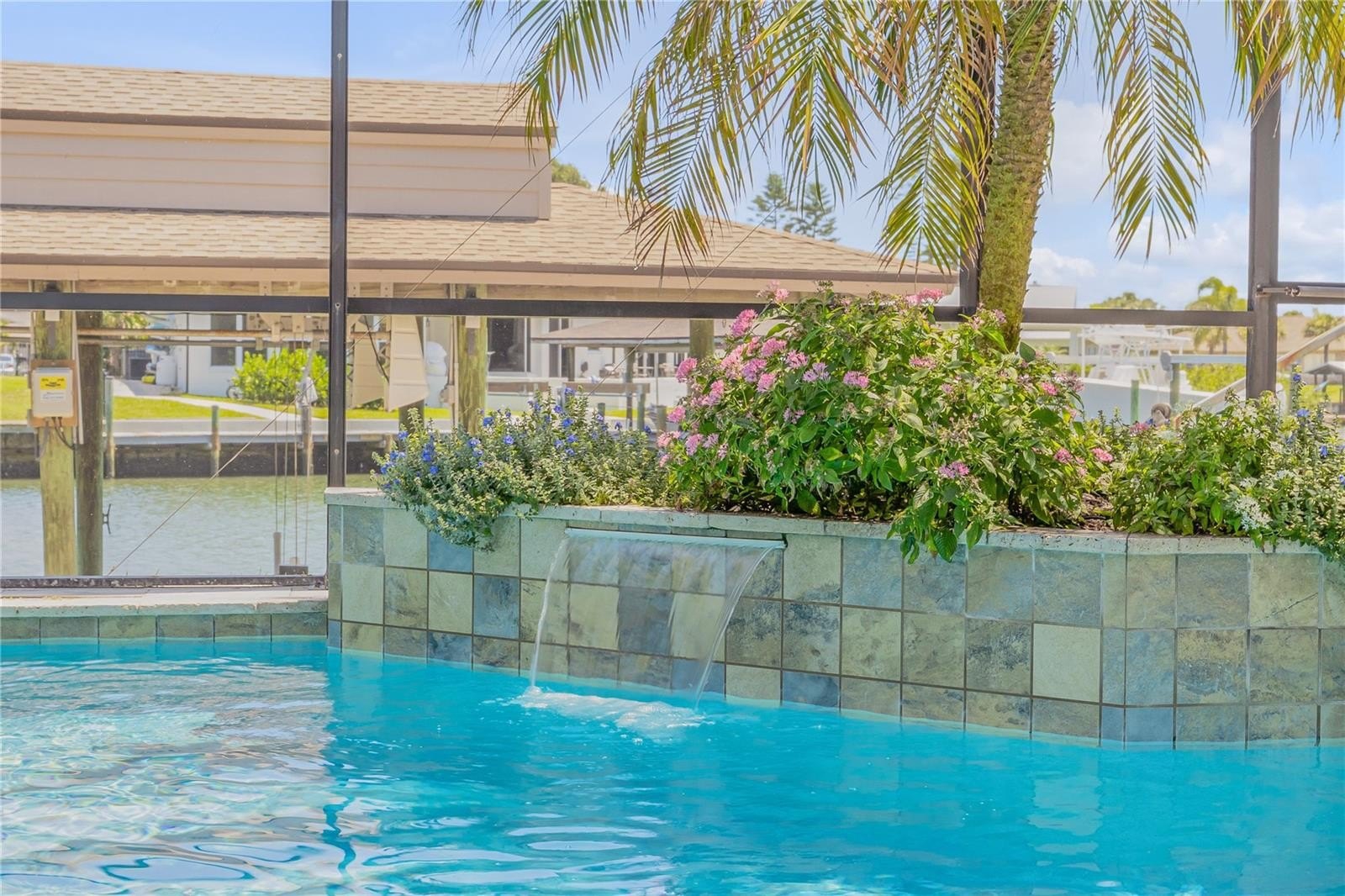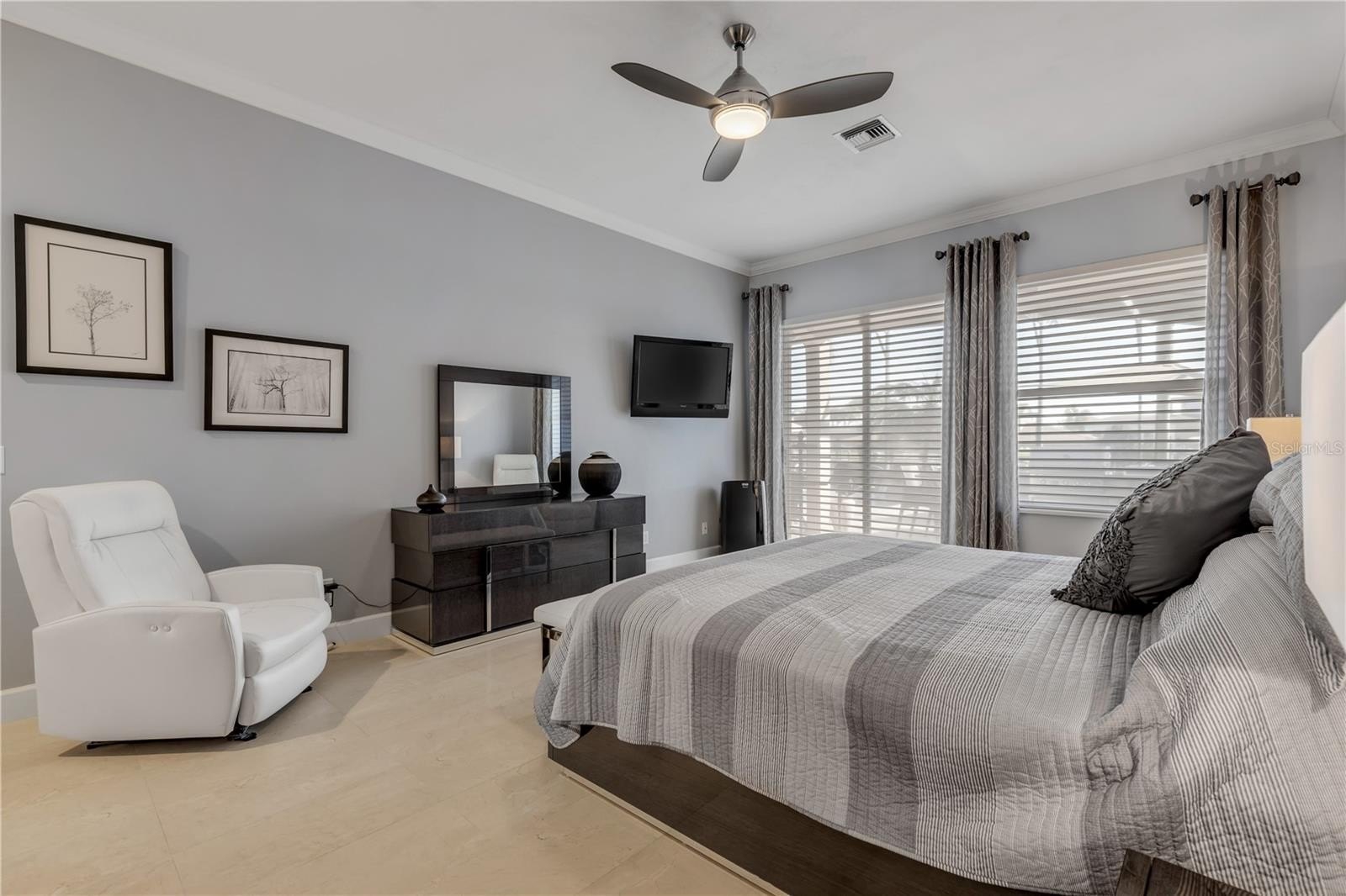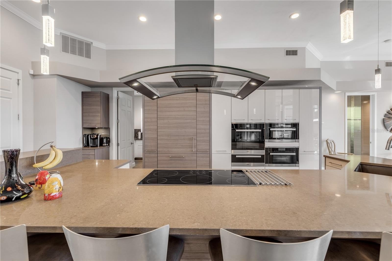From the moment you arrive, the sense of scale is undeniable. Twin glass entry doors open to soaring 12-foot ceilings, custom tile inlays, and curated designer lighting — establishing an immediate tone of elegance and craftsmanship. The expansive great room is bathed in natural light through dramatic floor-to-ceiling windows, framing serene views of the private pool and waterfront beyond. An 80-inch recessed Modern Flames fireplace anchors the space, enhanced by integrated LED and precision downlighting. The open-concept layout transitions effortlessly into the gourmet kitchen and outdoor living areas — ideal for entertaining on any scale. German-Engineered Culinary Design - The chef’s kitchen is a masterclass in modern European craftsmanship, featuring: Custom SieMatic cabinetry in high-gloss and wood-grain finishes; Premium Miele appliances including steam, speed, and multifunction ovens; Concealed refrigerator/freezer; Induction cooktop and wine storage; Quartz waterfall island with breakfast seating; Granite sink and statement LED pendant lighting. This is not simply a kitchen — it is a culinary gallery. Private Owner’s Retreat - The primary suite offers lanai access and tranquil water views, accompanied by dual walk-in closets and a vaulted dressing or fitness space. The spa-inspired bath showcases frameless glass showers, rain heads, LED mirrors, and designer finishes — delivering a true resort experience at home. Guest accommodations reflect equal attention to detail, with fully tiled baths, sleek vanities, and contemporary glass accents. Resort-Style Outdoor Living - Step onto a travertine lanai designed for year-round enjoyment. The heated pool and spa feature: Sundeck and waterfall elements; Bubbler jet features;