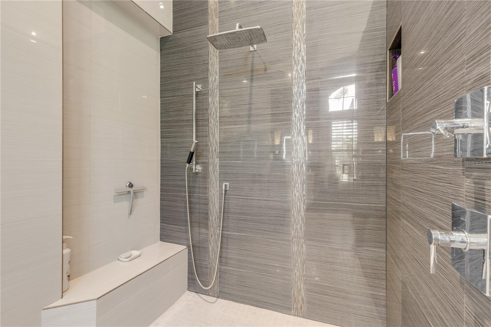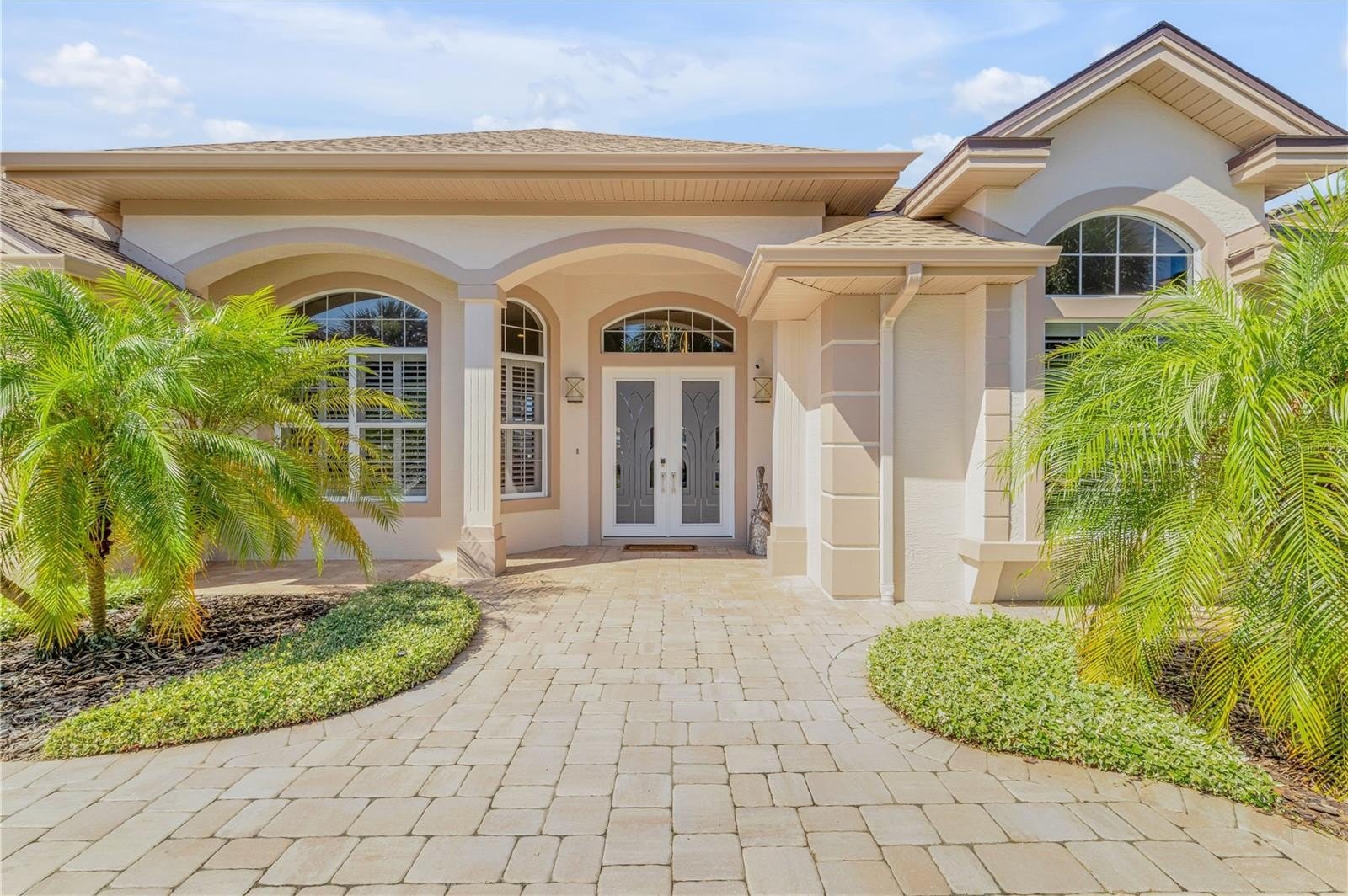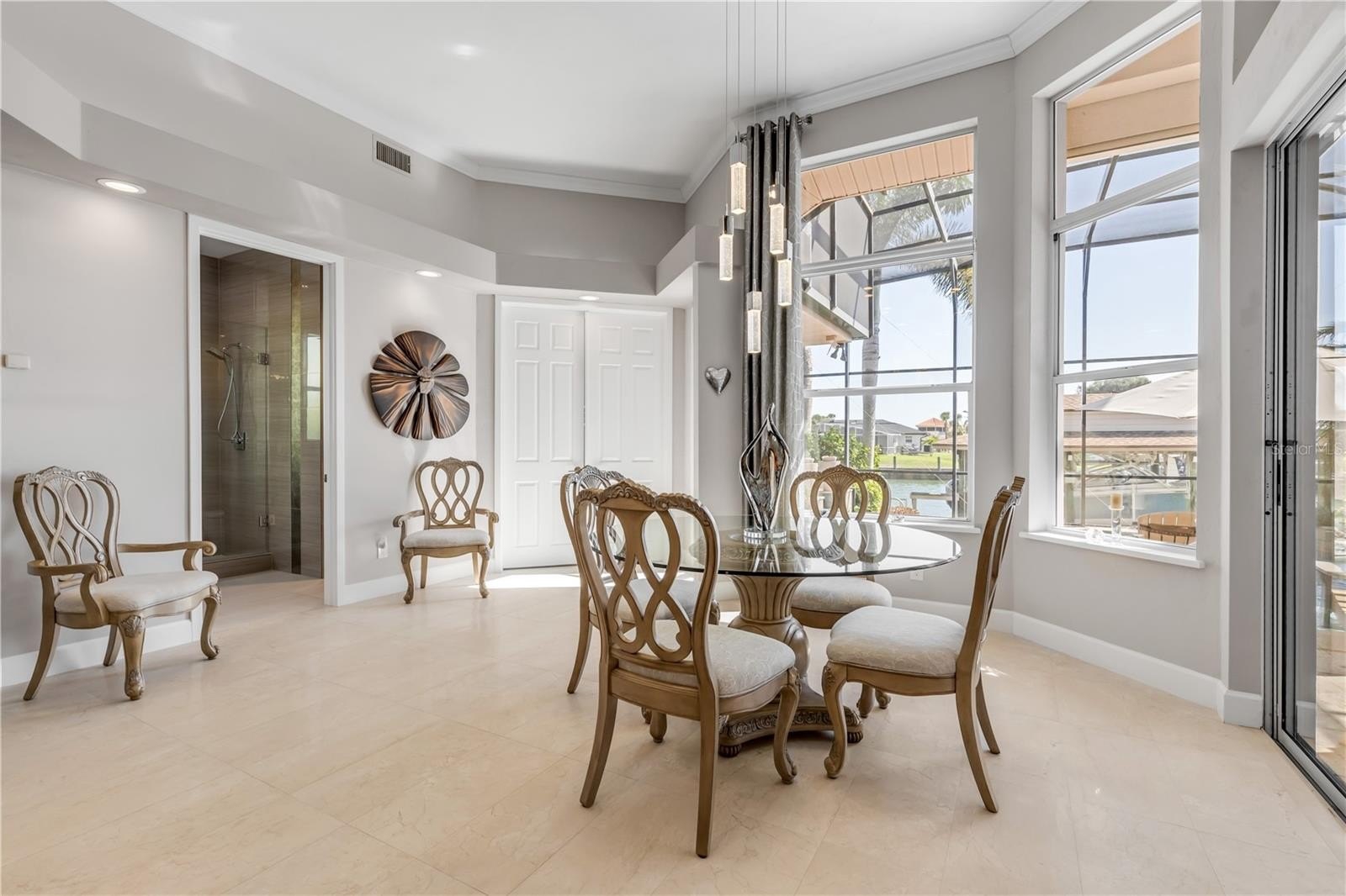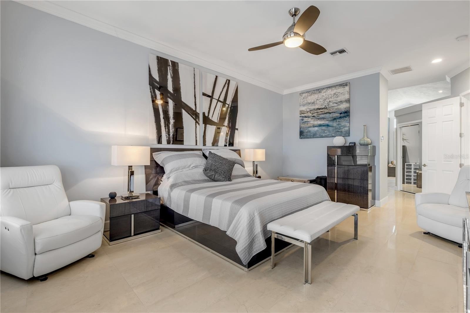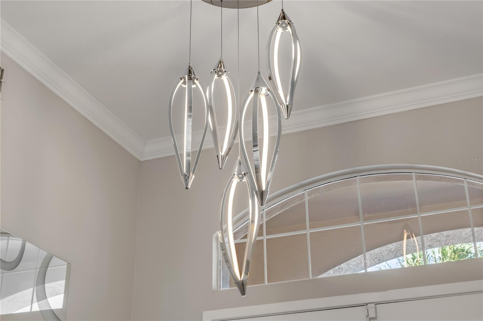 From the moment you arrive, the sense of scale is undeniable. Twin glass entry doors open to soaring 12-foot ceilings, custom tile inlays, and curated designer lighting — establishing an immediate tone of elegance and craftsmanship. The expansive great room is bathed in natural light through dramatic floor-to-ceiling windows, framing serene views of the private pool and waterfront beyond. An 80-inch recessed Modern Flames fireplace anchors the space, enhanced by integrated LED and precision downlighting. The open-concept layout transitions effortlessly into the gourmet kitchen and outdoor living areas — ideal for entertaining on any scale. German-Engineered Culinary Design - The chef’s kitchen is a masterclass in modern European craftsmanship, featuring: Custom SieMatic cabinetry in high-gloss and wood-grain finishes; Premium Miele appliances including steam, speed, and multifunction ovens; Concealed refrigerator/freezer; Induction cooktop and wine storage; Quartz waterfall island with breakfast seating; Granite sink and statement LED pendant lighting. This is not simply a kitchen — it is a culinary gallery. Private Owner’s Retreat - The primary suite offers lanai access and tranquil water views, accompanied by dual walk-in closets and a vaulted dressing or fitness space. The spa-inspired bath showcases frameless glass showers, rain heads, LED mirrors, and designer finishes — delivering a true resort experience at home. Guest accommodations reflect equal attention to detail, with fully tiled baths, sleek vanities, and contemporary glass accents. Resort-Style Outdoor Living - Step onto a travertine lanai designed for year-round enjoyment. The heated pool and spa feature: Sundeck and waterfall elements; Bubbler jet features;