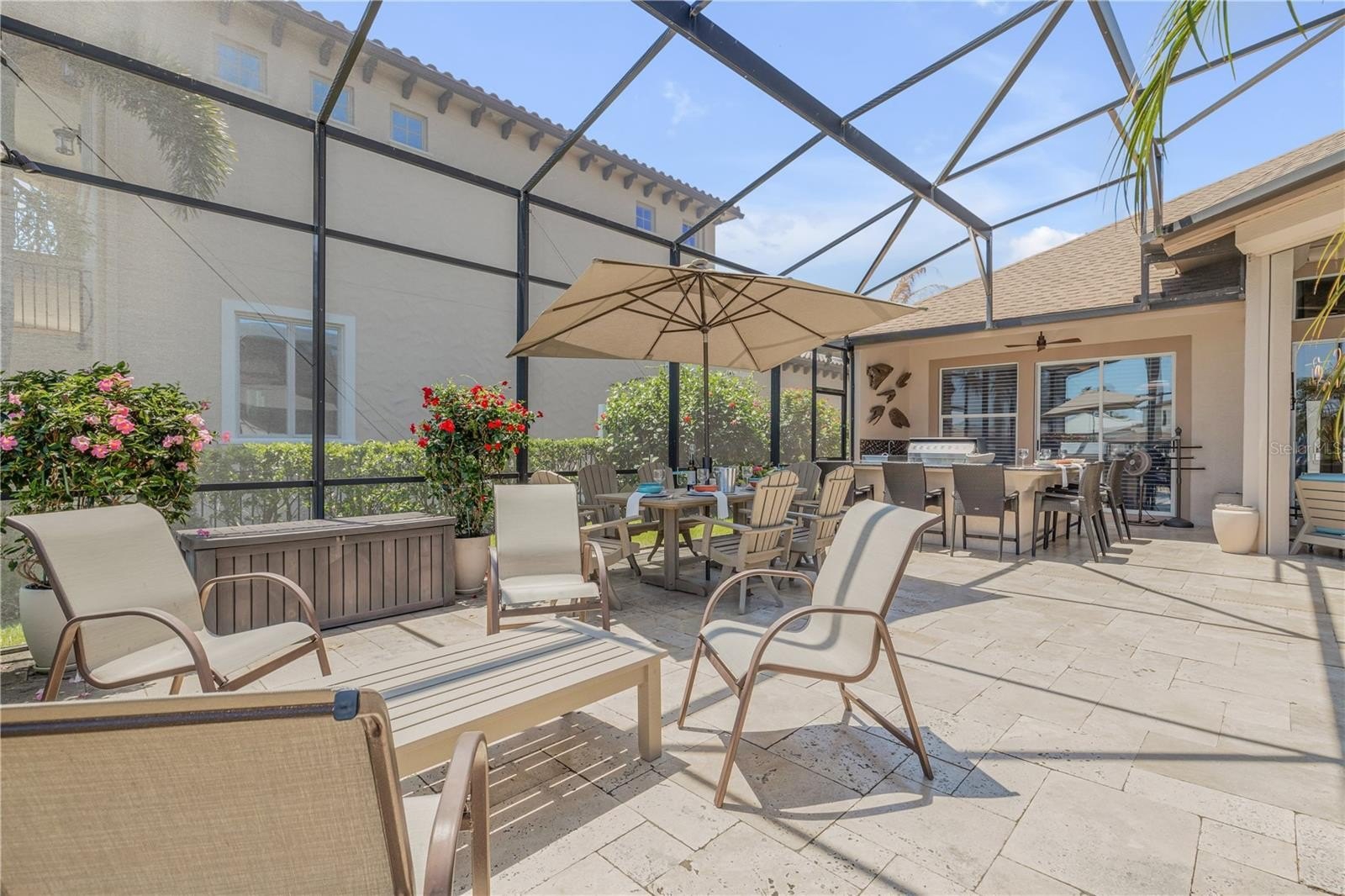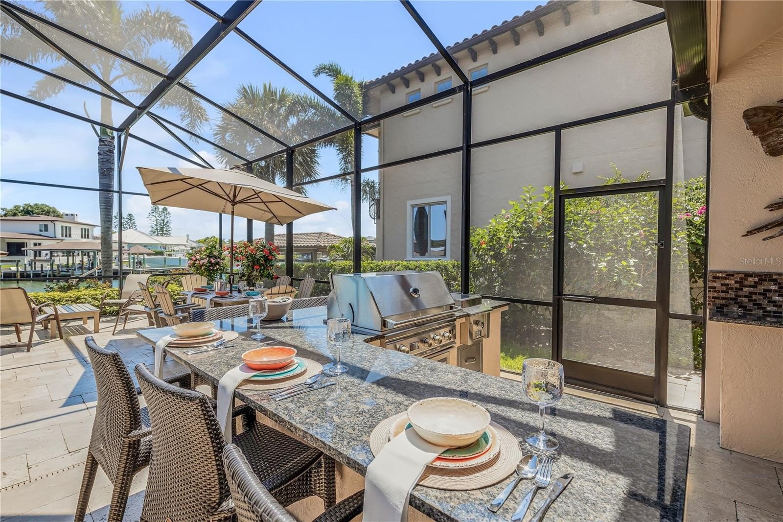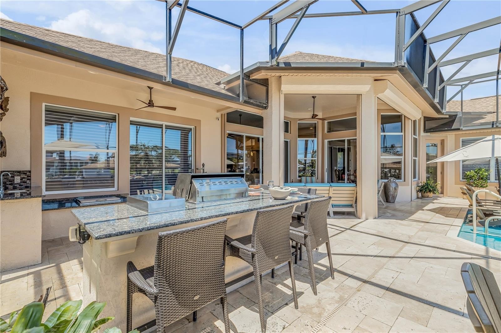 Fully automated I-Aqualink control system; Hurricane-rated electric roller shutters. The summer kitchen is fully equipped with granite counters, built-in grill, searing burner, beverage cooler, and bar seating for six — perfect for sunset gatherings. Premier Boating Facilities -