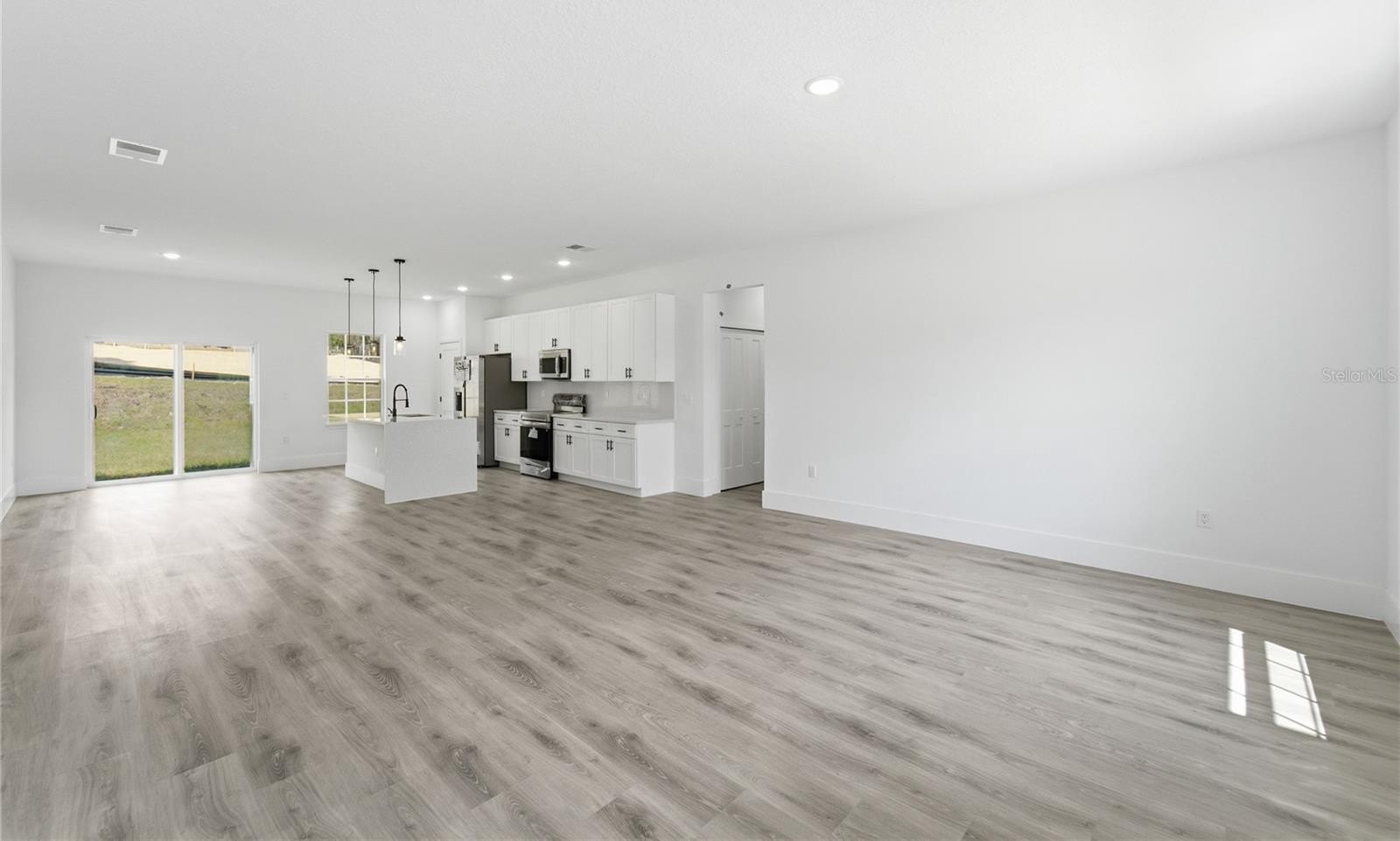 The open floorplan creates a seamless and inviting flow between the expansive living room and dining area, making it perfect for entertaining or relaxing. The kitchen is a true highlight, featuring beautiful solid wood cabinets, elegant stone countertops, and included appliances, combining style and practicality.