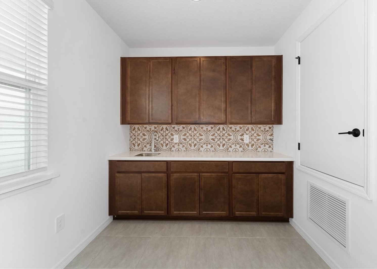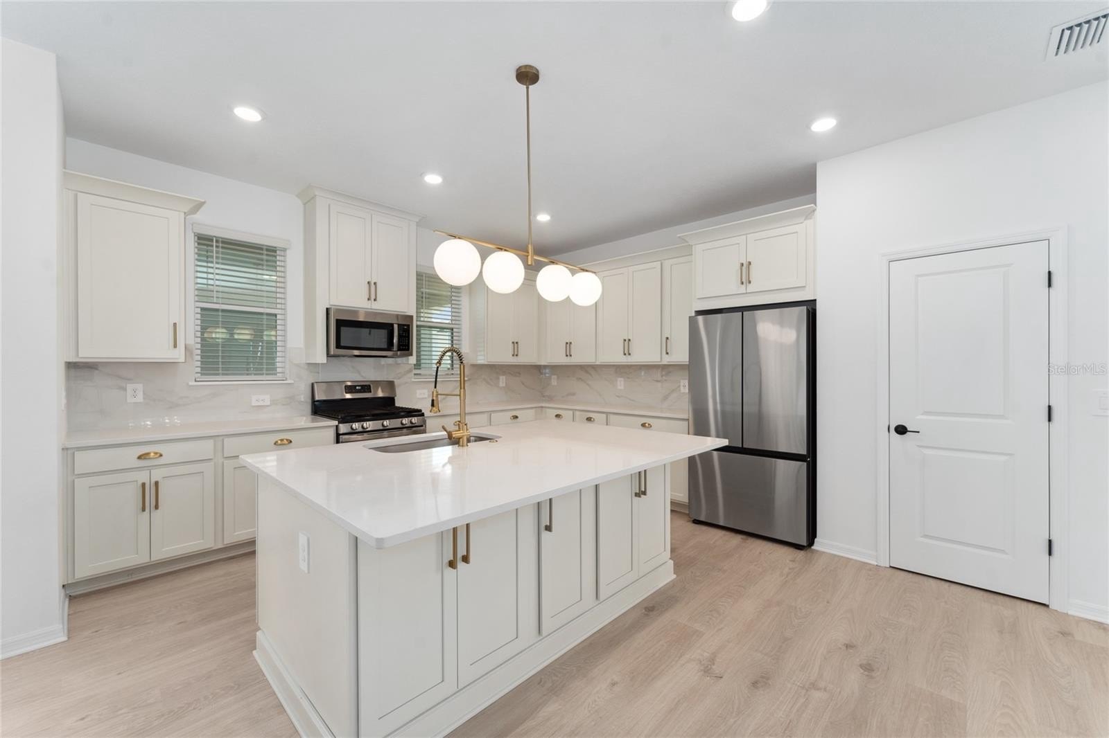 The open-concept first floor features a bright, inviting living space paired with a cabinet-rich gourmet kitchen designed for both everyday living and entertaining. Kitchen highlights include an oversized island with ample counter space, gas range, upgraded refrigerator, exterior-vented microwave, garbage disposal, and a hidden trash cabinet. The kitchen overlooks a paved private courtyard, creating a low-maintenance outdoor space perfect for relaxing or entertaining.