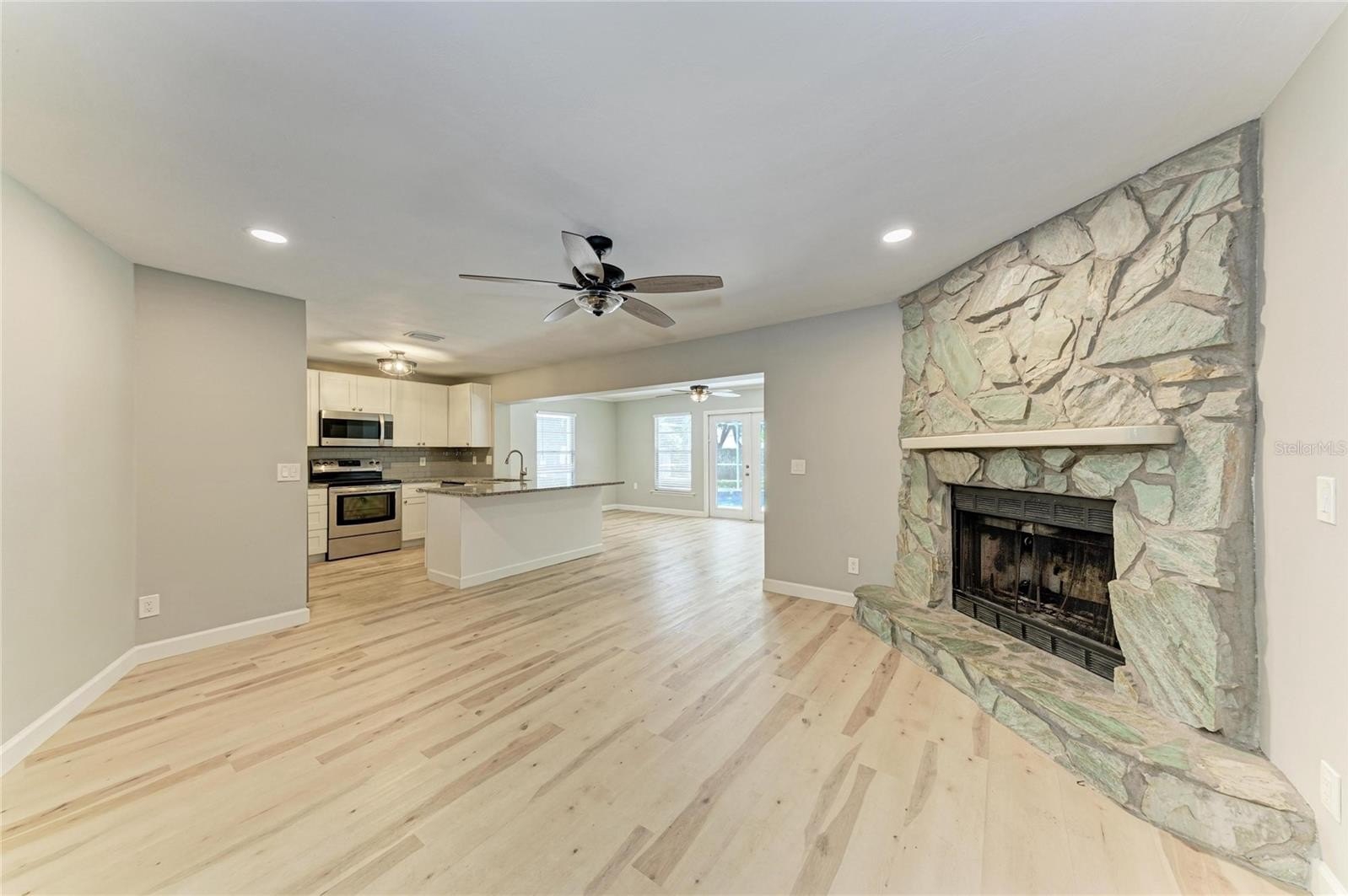 Welcome to your own slice of paradise in the quiet, sought-after community of Manatee Oaks. This beautifully appointed 3-bedroom, 2-bath home is truly move-in ready, featuring gorgeous flooring throughout and an open-concept floor plan designed for both comfortable living and effortless entertaining. From the moment you step inside, you'll feel the difference that thoughtful updates and pride of ownership make. The spacious living room centers around a cozy wood-burning fireplace — equally perfect for quiet evenings with a good book or lively game nights with friends. The warmth and character it brings to the space is something you simply can't manufacture. The fully updated kitchen flows seamlessly into the dining room, offering abundant counter space and a layout any home chef will love. Whether you're preparing an intimate dinner or hosting a crowd, entertaining here is an absolute breeze.