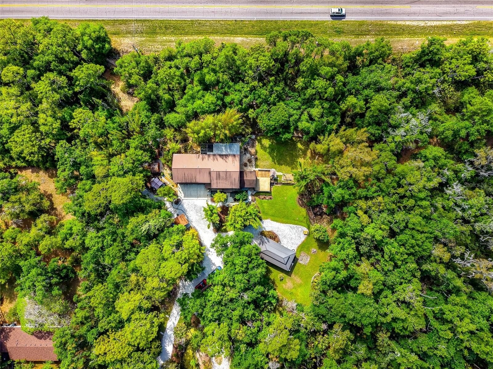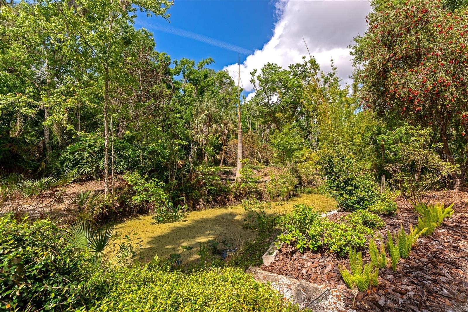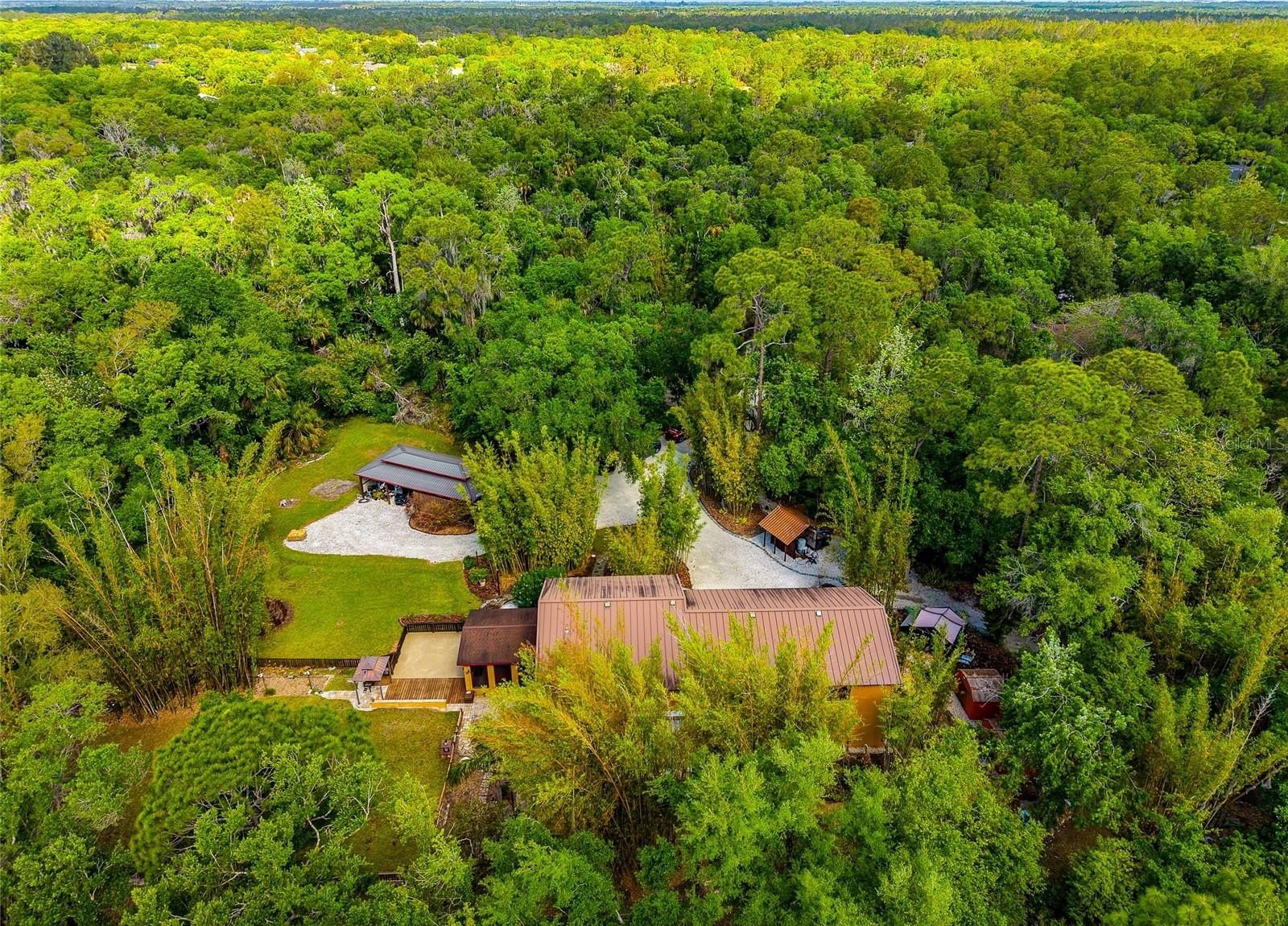 As you approach, you’ll immediately notice the sense of seclusion. The attached 3 car garage could easily be converted to a Mother In Law Suite. Set well back from the road and accessed by three charming bridges, the property welcomes you into a peaceful, private retreat. The grounds are something truly special and not typical landscaping, but a thoughtfully curated natural oasis. Lush bamboo gardens and a rich variety of subtropical plants are strategically placed throughout the property, creating a setting that feels more like a botanical escape than a backyard. Adding to the tranquility, a river winds through the wetlands portion of the land, visible through a backdrop of mature forest. This natural barrier not only enhances the beauty but also provides exceptional privacy from neighboring areas. The unique blend of uplands and wetlands creates a peaceful, campground like atmosphere across different areas of the property, an uncommon serenity that’s hard to replicate. Functionality meets flexibility throughout. A large portion of the acreage is already cleared and usable, featuring multiple sheds, a 4 car carport, and abundant storage options. The oversized 3.5 car garage is built extra deep, offering valuable flex space perfect for a home business, workshop, craft area, or future expansion. Outdoor living is just as impressive, with two screened lanais, an open-air deck, and an extended patio spaces designed for relaxation, entertaining, and soaking in the surrounding nature. It’s the kind of property where every day feels like a getaway. Located within Sundance, residents enjoy a rare combination of freedom and amenities. The community allows for home-based businesses and horses, and offers access to a marina and stables all with minimal restrictions and an incredibly low HOA fee of $220 a year. If you’ve been searching for a property that offers strength, space, privacy, and a deep connection to nature...this is it.