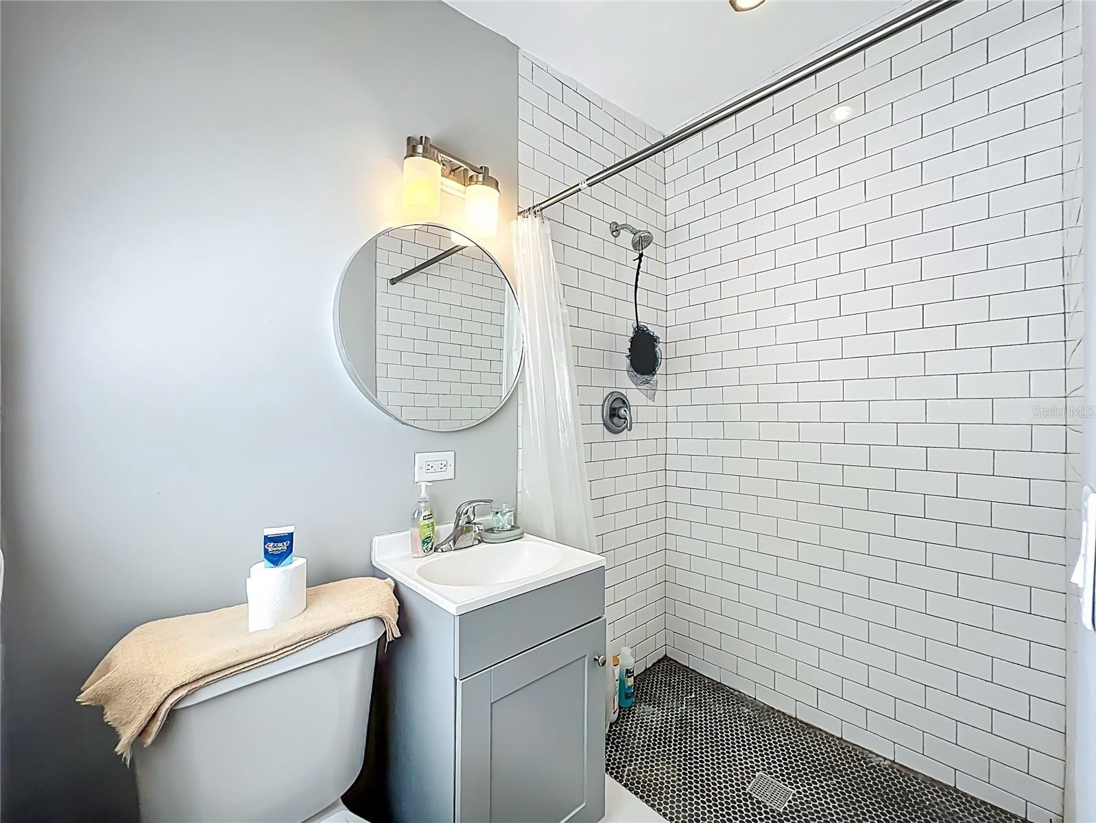 The split layout offers three generously sized guest bedrooms that share a fully renovated bathroom (2022), complete with a new vanity, updated fixtures, and a subway-tiled shower and tub combination. The primary suite provides a comfortable retreat with its own updated en-suite bath (2022), featuring a sleek vanity, contemporary fixtures, and a subway-tiled shower.