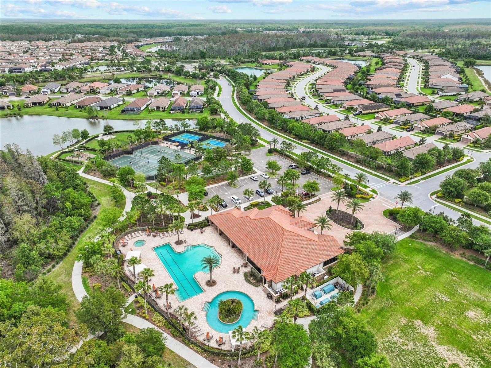 Residents of Esplanade at Starkey Ranch enjoy resort-style amenities including a clubhouse, 24-hour fitness center, resort and lap pools, spa, pickleball, tennis, dog parks, and social activities. The community offers 22 miles of trails and access to over 800 acres of conservation next to J.B. Starkey Wilderness Park.