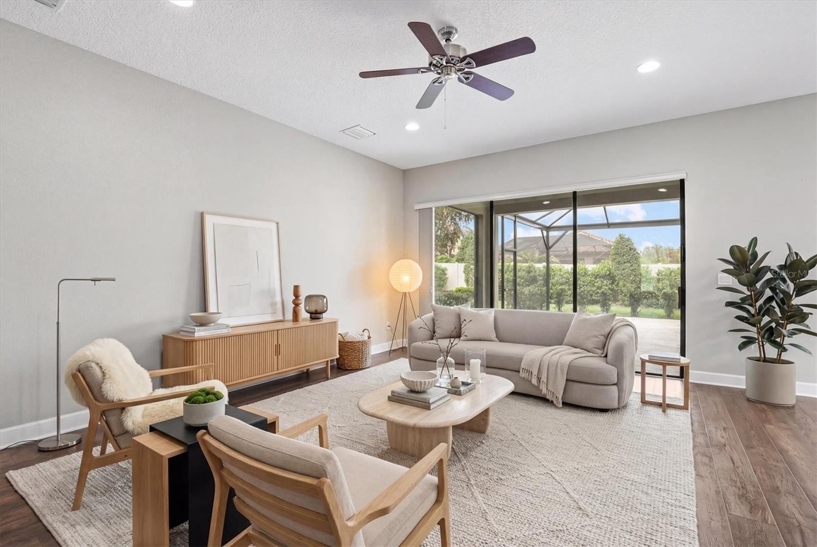 Enjoy true indoor-outdoor Florida living with disappearing pocket sliders leading to an expansive 18’ x 26’ screened lanai with panoramic enclosure, remote-controlled fans and lighting, and custom LED ambiance lighting—perfect for entertaining and sunset views.