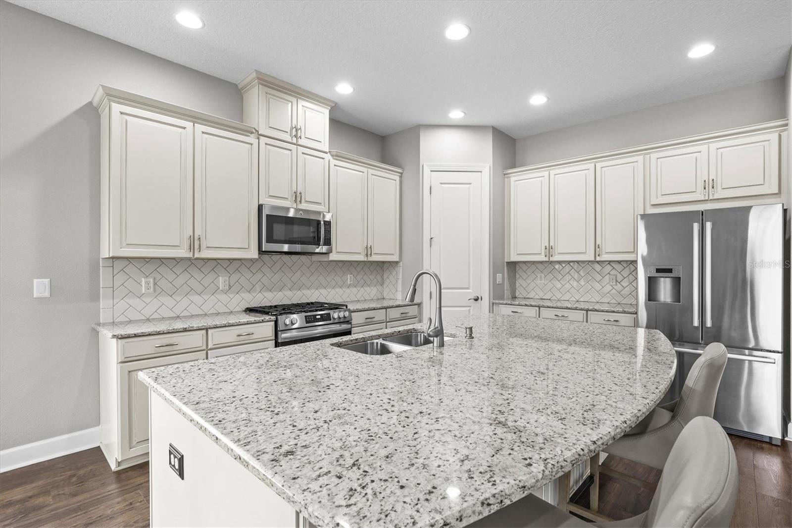 Featuring 10-foot ceilings, luxury vinyl plank flooring throughout, and an open-concept layout, this home is ideal for both everyday living and entertaining. The gourmet kitchen includes a large granite island, herringbone tile backsplash, gas range, Bosch stainless steel French-door refrigerator, and eat-in dining space, all flowing seamlessly into the spacious living area.