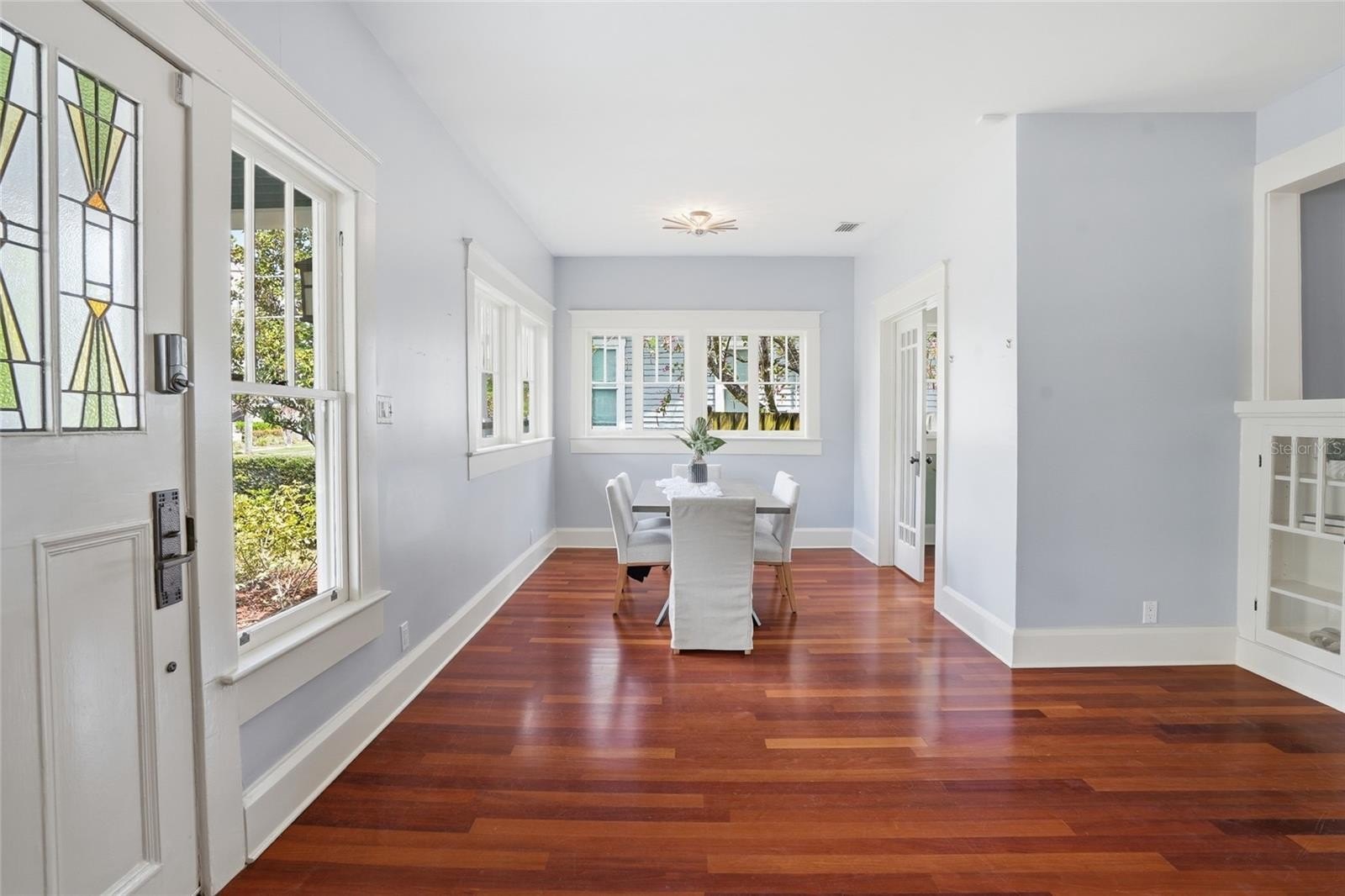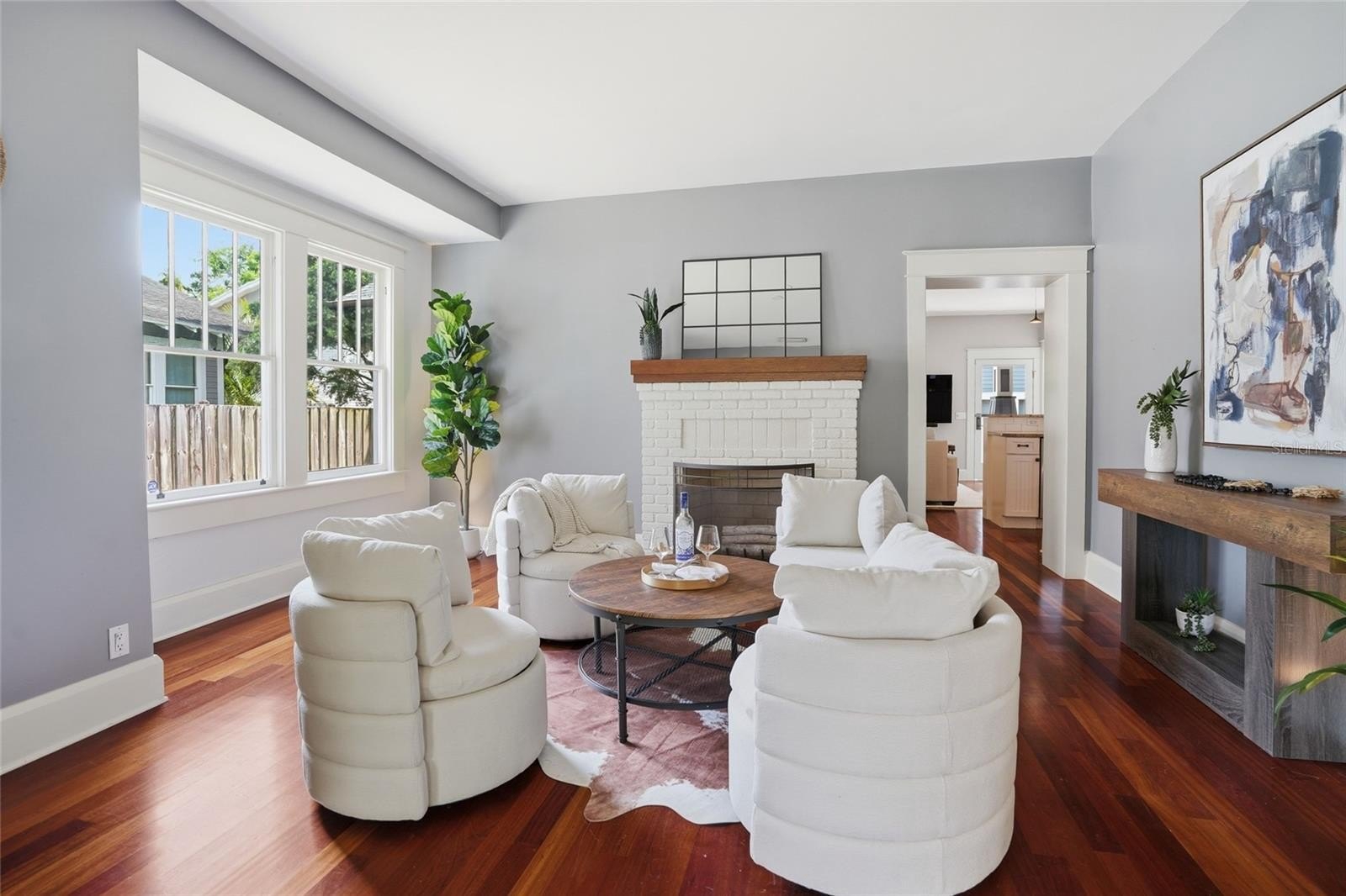 A welcoming front porch with a signature swing sets the tone, inviting slow mornings and evening conversations beneath the shade of mature trees. Inside, Brazilian hardwood floors flow throughout the main home, complemented by original built-ins, crown molding, and curated architectural details that honor the home’s heritage. The main living area is both warm and sophisticated, anchored by a wood-burning fireplace and seamlessly connected to a private den with French doors—ideal for a home office, library, playroom or quiet retreat.