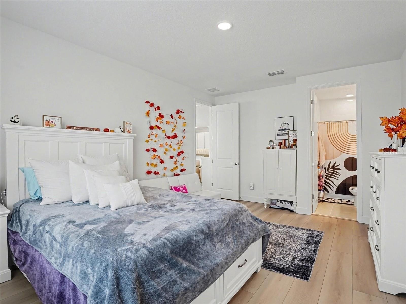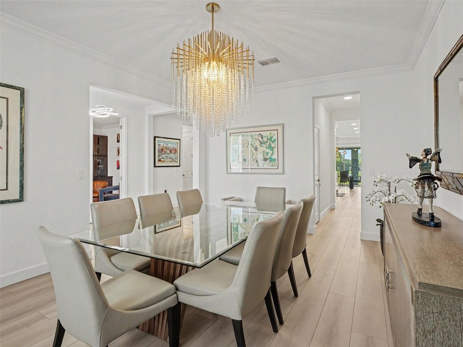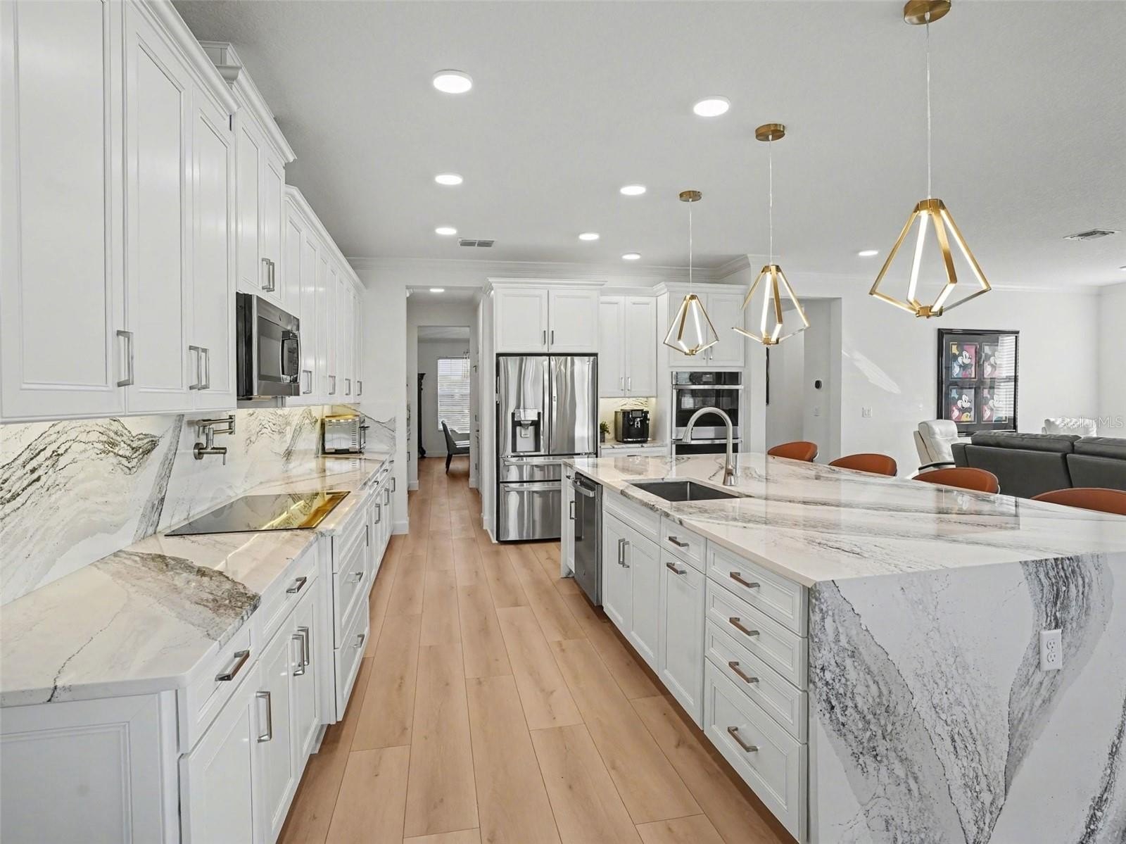 At the front of the home, a stylish lounge with a built-in dry bar and wine refrigerator creates an inviting first impression, complemented by a formal dining room nearby. The main level opens into a bright, open-concept living space where the kitchen and family room connect seamlessly. The chef’s kitchen serves as the focal point, featuring a waterfall quartz island with bar seating, matching quartz countertops and backsplash, double ovens, a pot filler, abundant cabinetry, a walk-in pantry, and designer lighting throughout. A butler’s pantry, coffee station, and built-in office nook add everyday convenience, while the dinette area overlooks the backyard and opens to a screened patio through sliding glass doors. A private guest suite with its own en-suite bath completes the first floor.