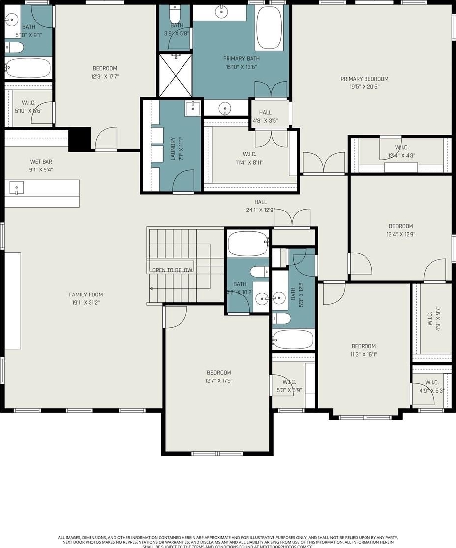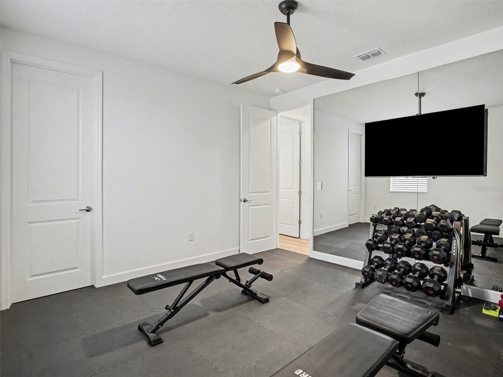 Upstairs, a spacious loft offers an ideal setting for entertaining, complete with a wet bar and wine refrigerator. All bedrooms are located on the second level, including the primary suite with a custom walk-in closet and a spa-inspired bath featuring a soaking tub and large walk-in shower. The sixth bedroom is currently used as a fitness studio with floor-to-ceiling mirrors and natural light. An upstairs laundry room with additional storage and a utility sink adds convenience.