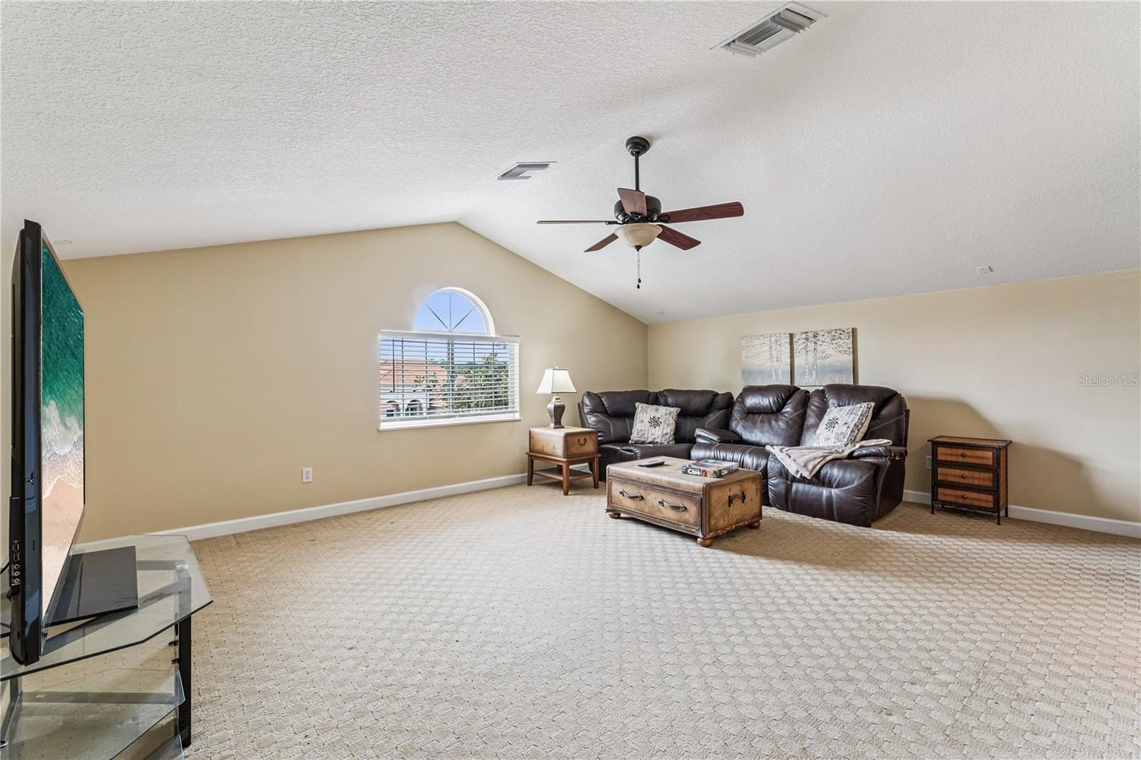 The owner’s suite offers a private retreat with a sitting area overlooking the pool and lanai, an expansive walk-in closet with custom shelving and separate dressing area, and a luxurious en-suite bath. Upstairs, the oversized bonus room is perfect for movie nights and game days, complete with a wet bar, powder bath, and dedicated AC unit.