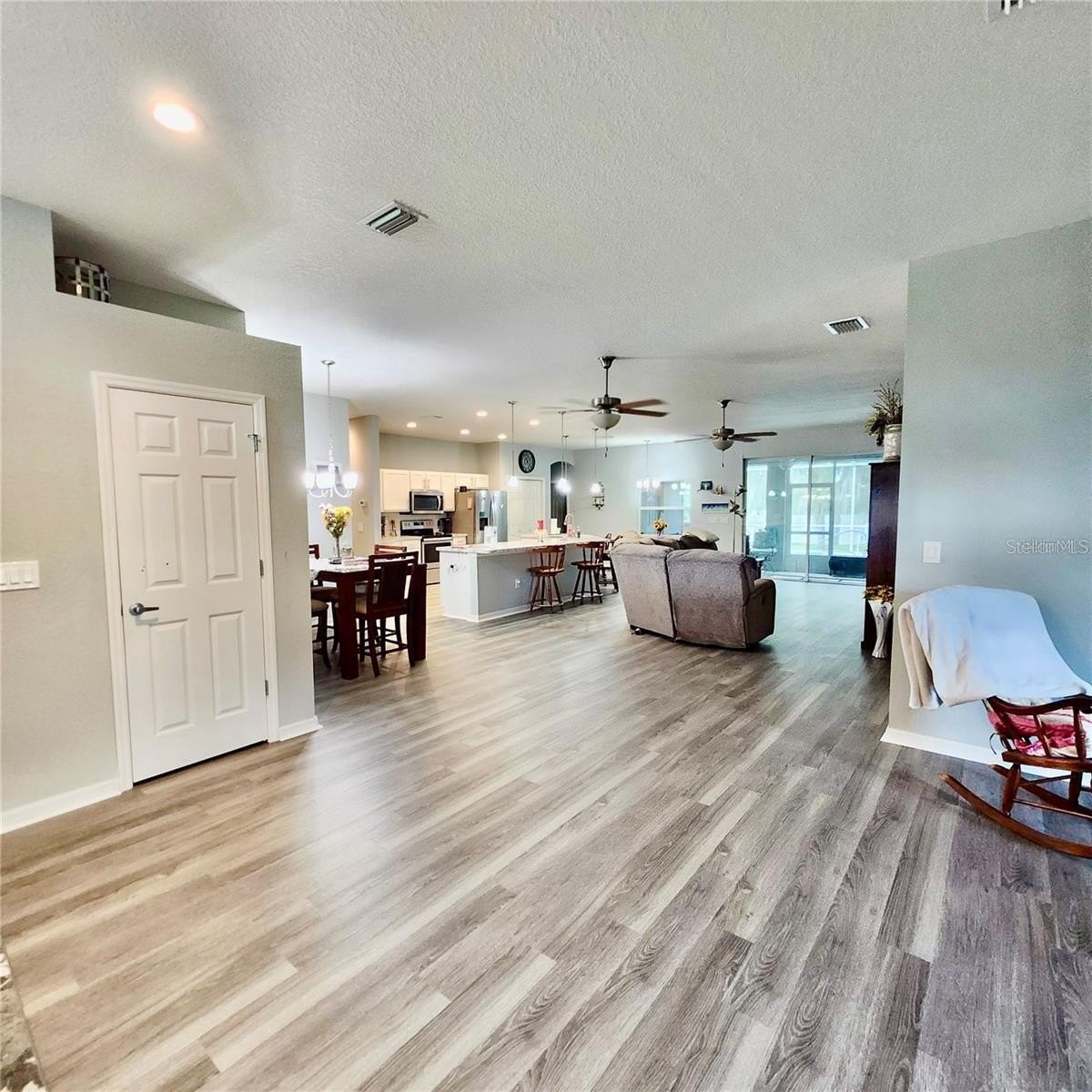 Welcome to this beautifully upgraded 5-bedroom, 3-bathroom pool home in the highly sought-after Kingsland Country Estates – Forest Glenn. Built in 2018 and offering 2,534 sq ft of modern living, this property delivers the perfect blend of space, style, and outdoor luxury. Step inside to an open-concept layout featuring luxury laminate flooring, tray ceilings, and a bright, airy living space ideal for entertaining. The kitchen is a true centerpiece with Laminate countertops, stainless steel appliances, a large island, and abundant storage. The split-bedroom floor plan provides privacy for everyone, including a spacious primary suite with a walk-in closet and spa-inspired bathroom. Your outdoor oasis awaits: a saltwater, solar-heated, screen-enclosed pool, extended patio, and plenty of yard space on a 0.39-acre lot. Whether you’re hosting gatherings or enjoying quiet evenings at home, this backyard delivers year-round enjoyment. Additional features include: • 3-car garage • Solar pool heating • Inside laundry room • Block construction • Quiet, established neighborhood with low HOA ($65/year) Located minutes from shopping, dining, medical facilities, and SR-200, this home offers both convenience and tranquility. This is one of the best values for a 5-bedroom pool home in the area — schedule your showing today!